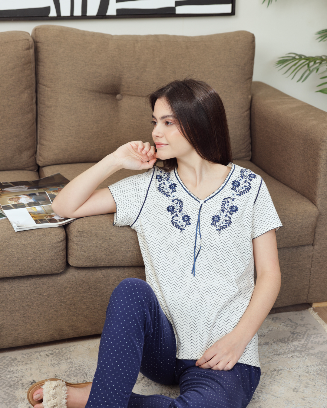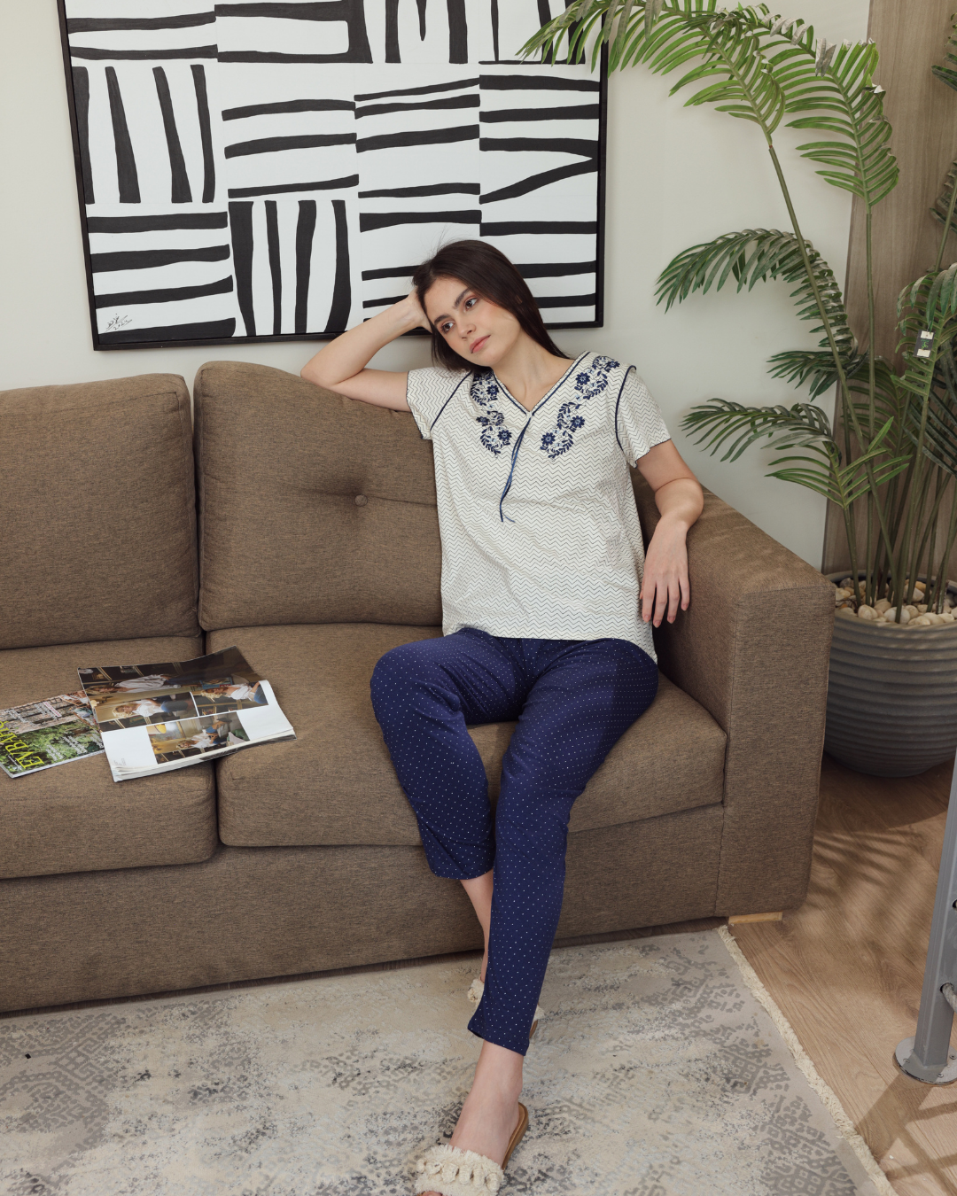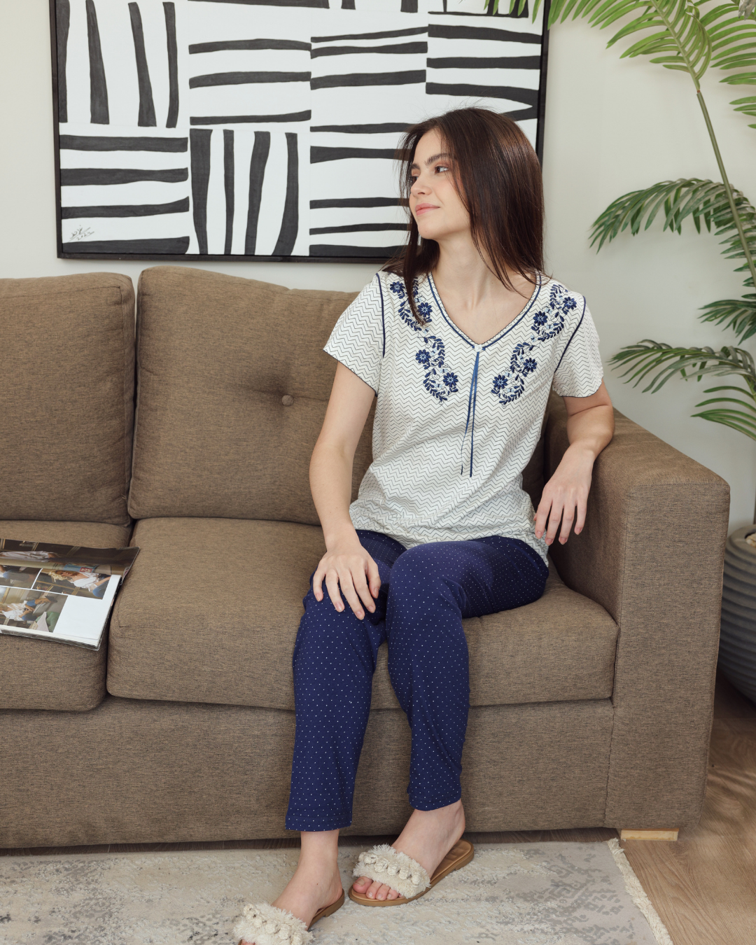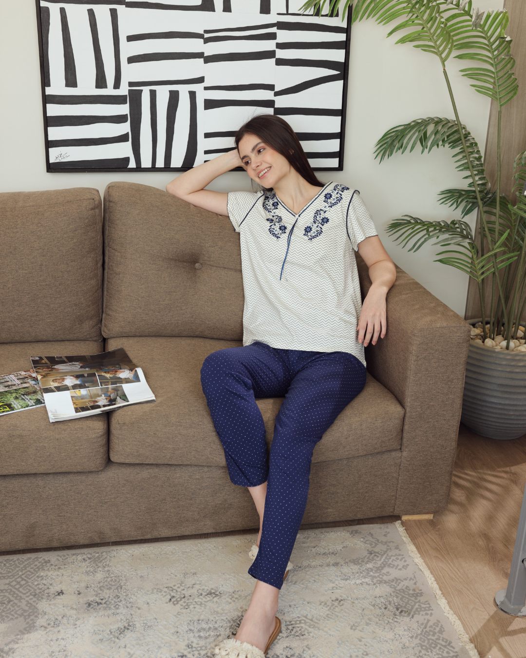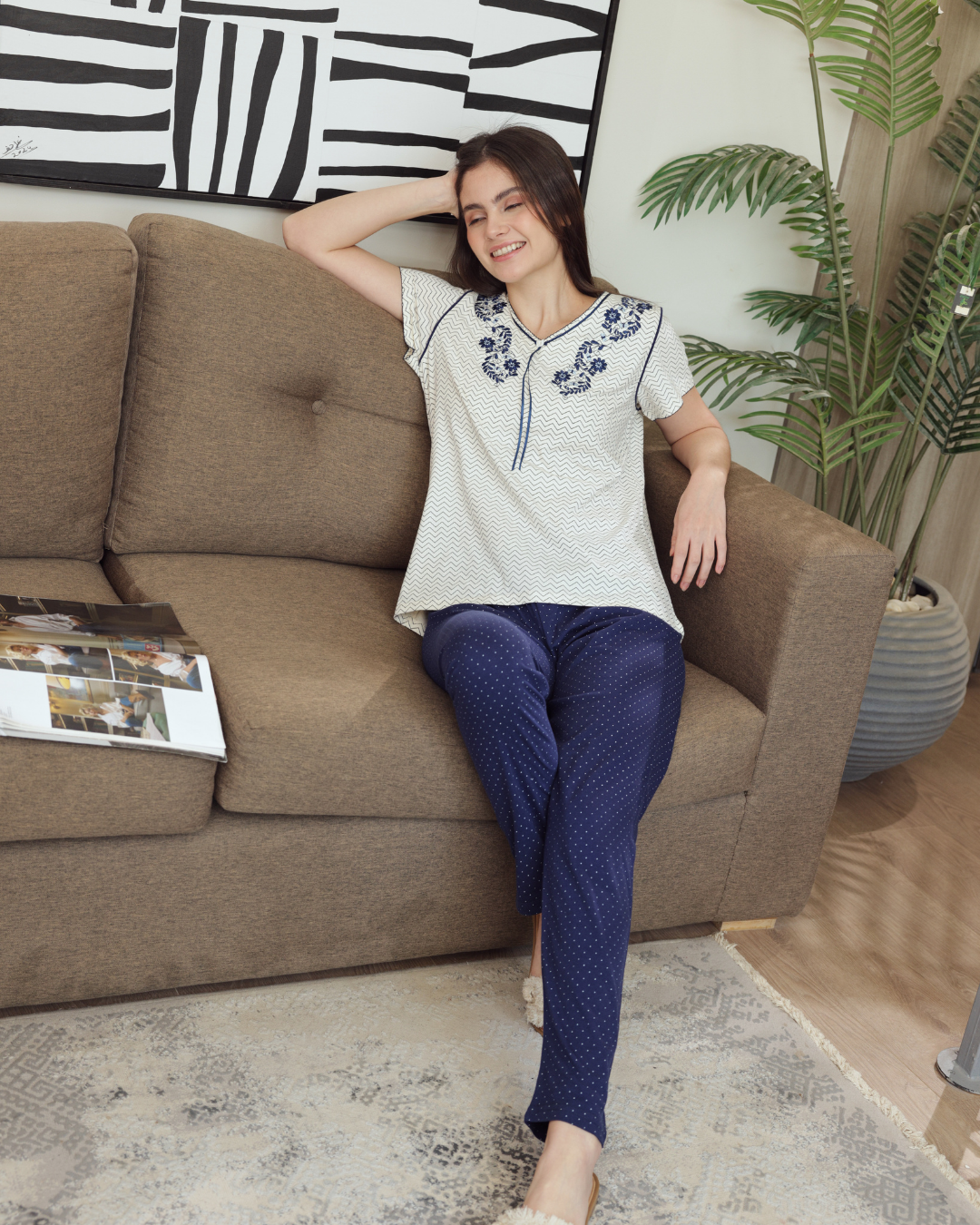 بيجاما حريمي نصف كم بنطلون طويل طباعة زجزاج مع منقط
