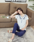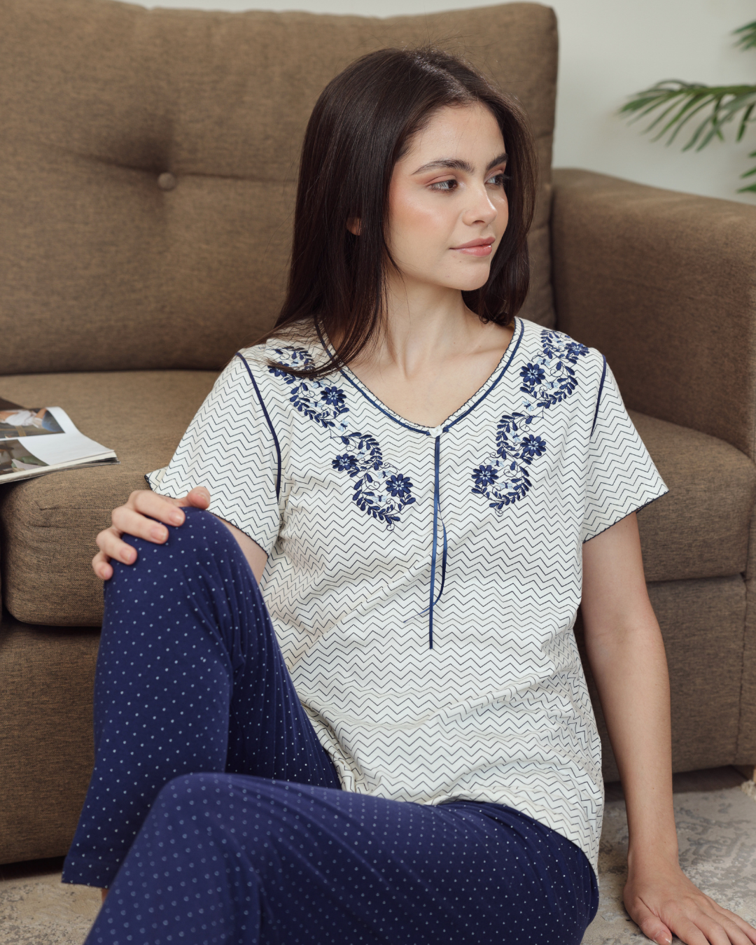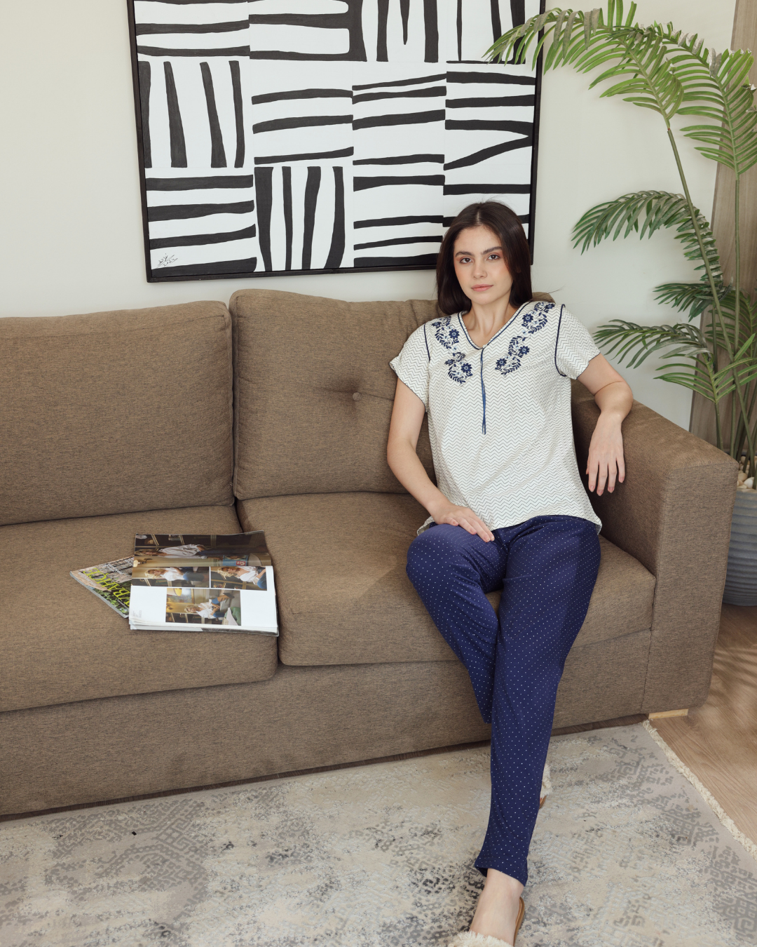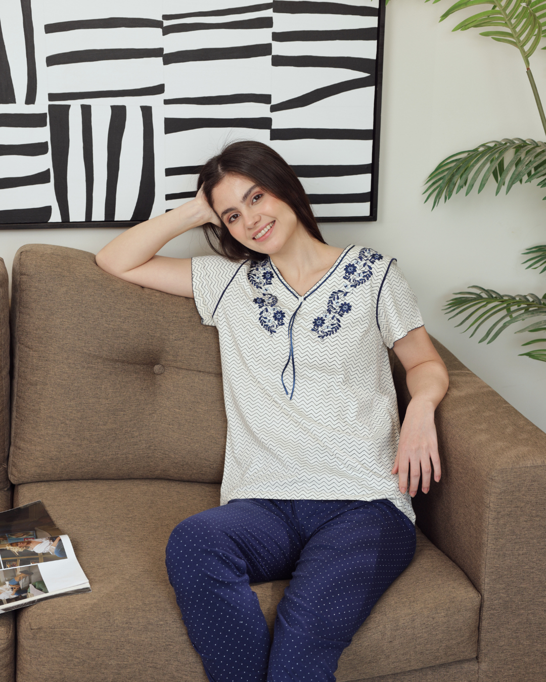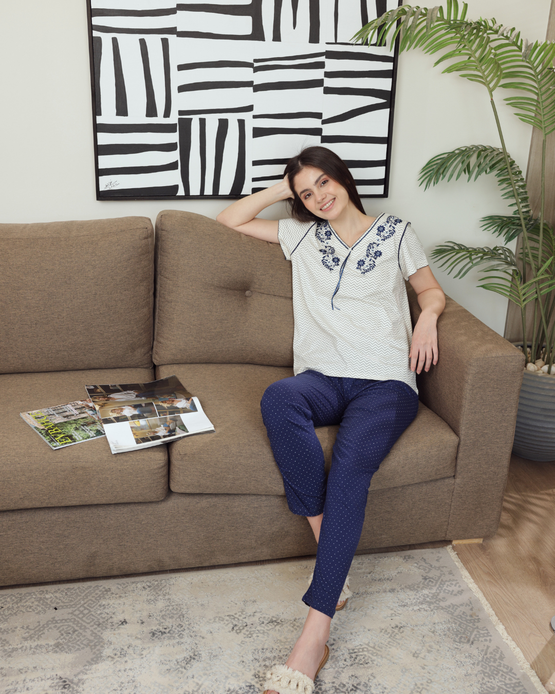 بيجاما حريمي نصف كم بنطلون طويل طباعة زجزاج مع منقط