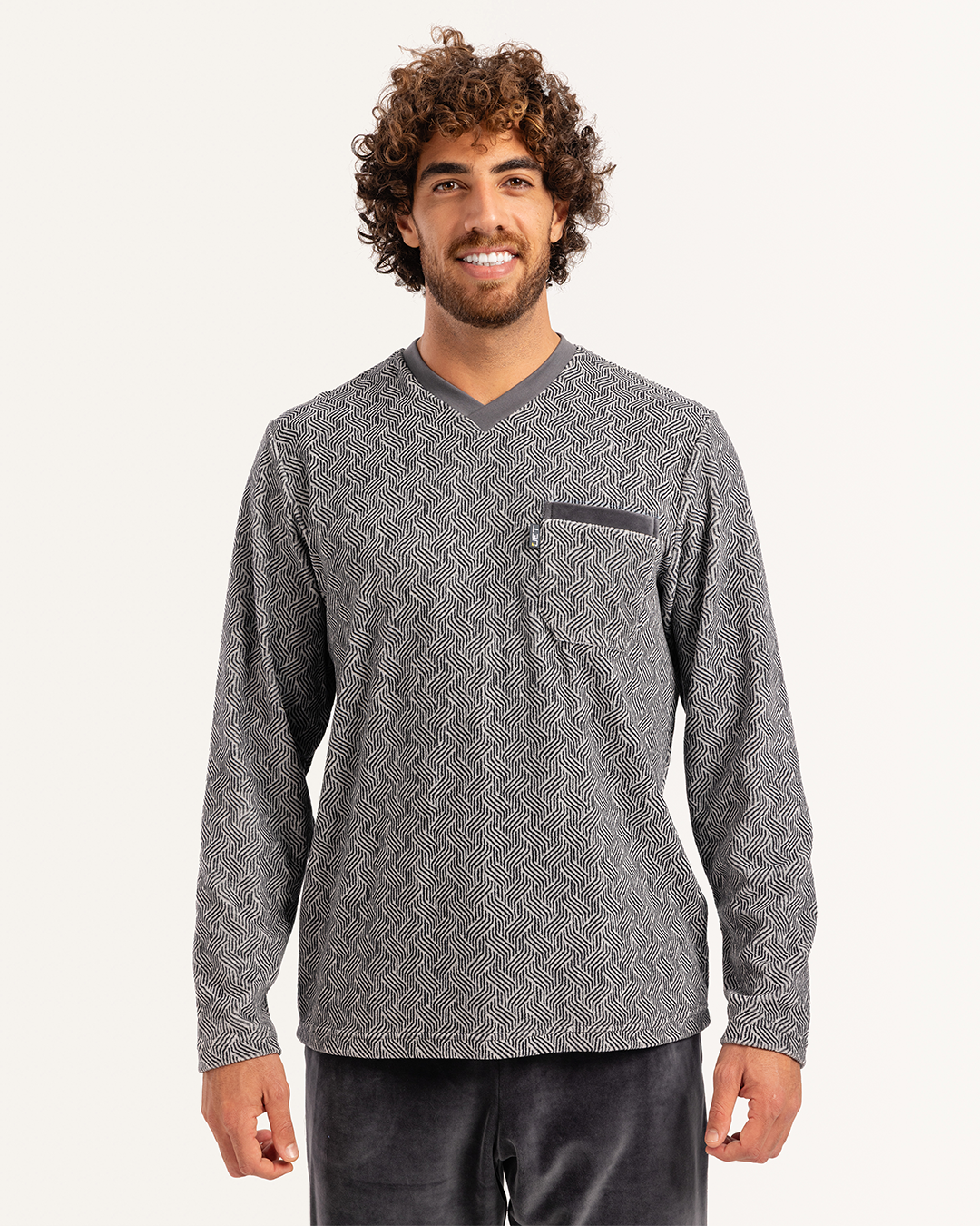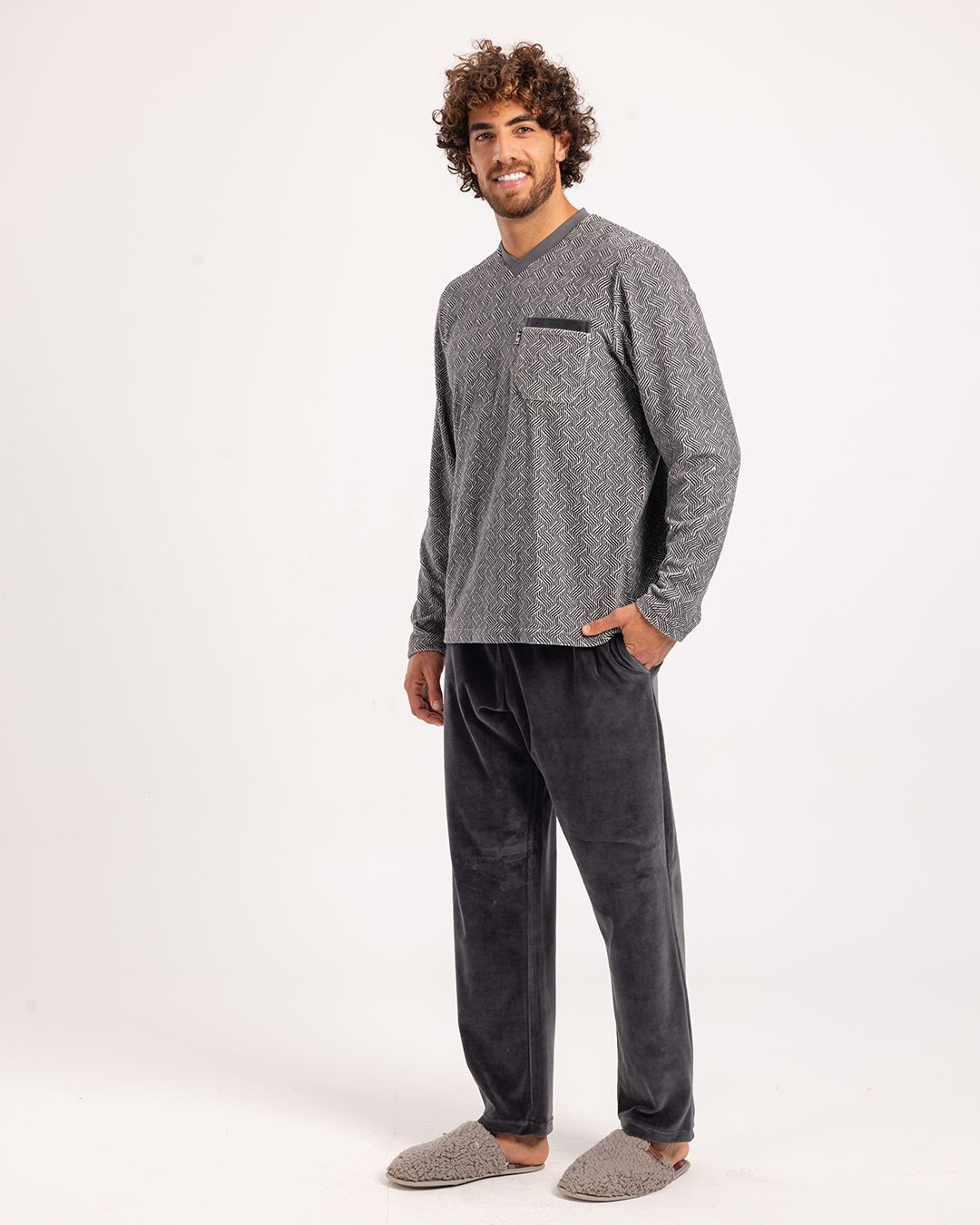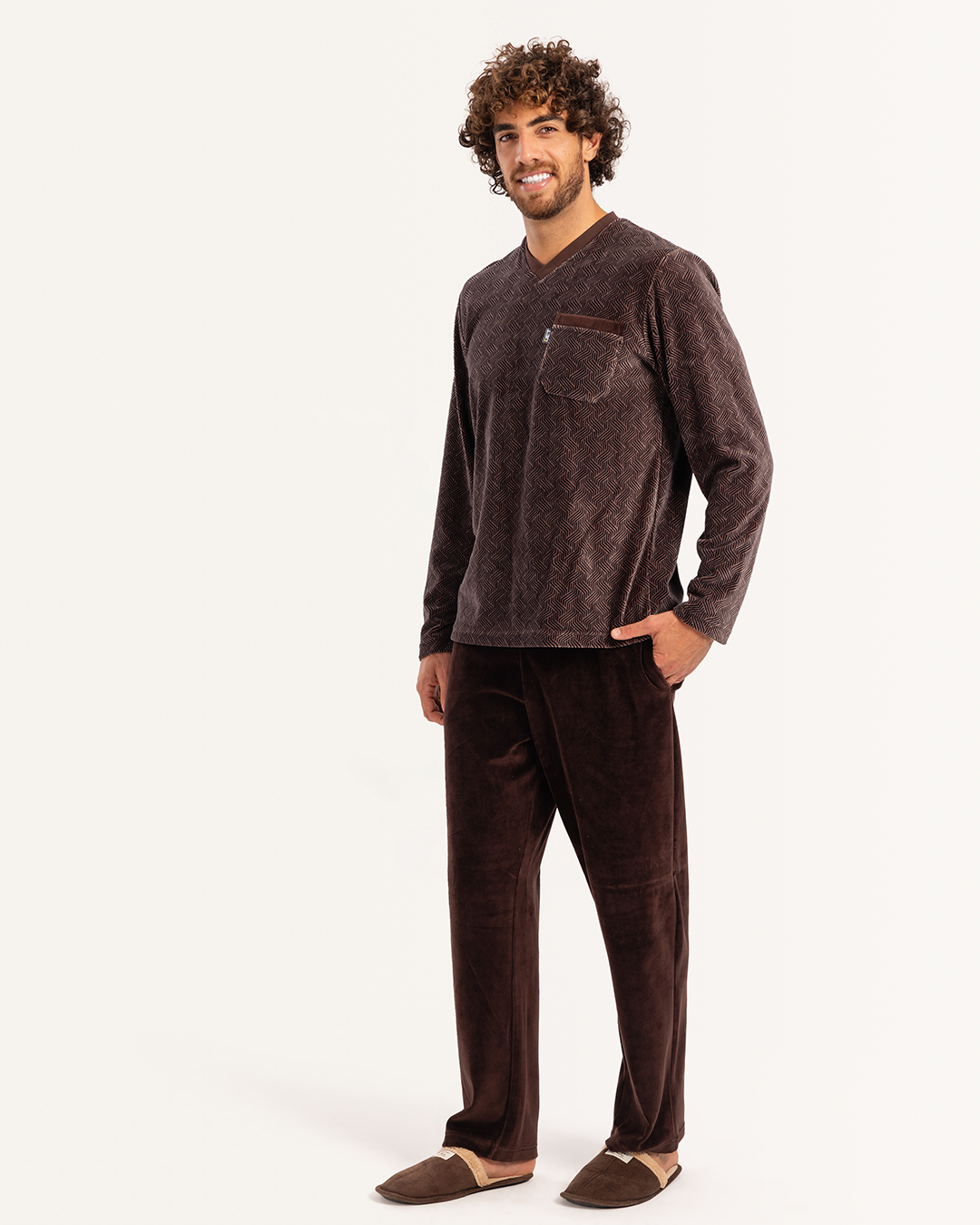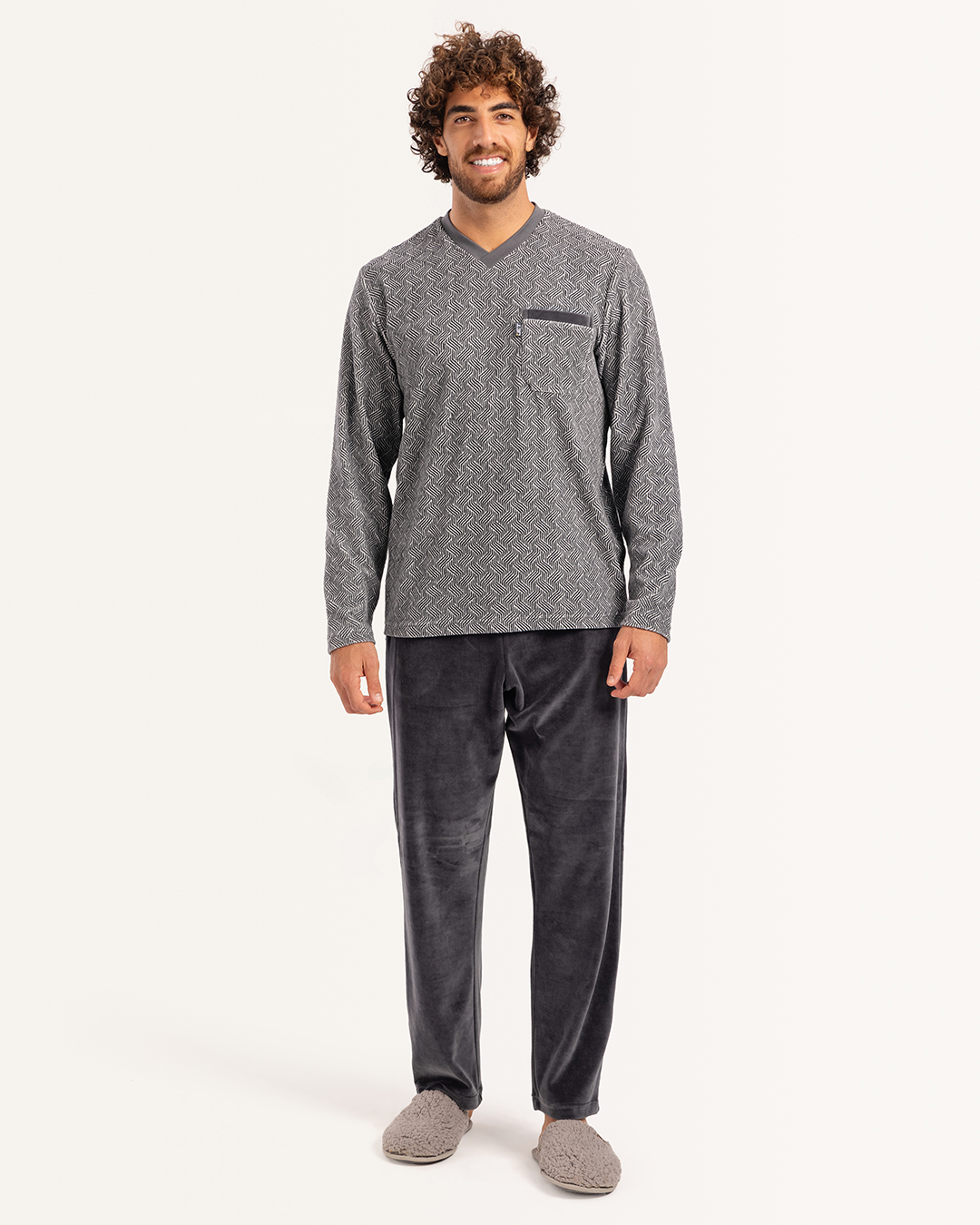 بيجاما رجالى قطيفة توب مطبوع  رقبه V جيب على الصدر و بنطلون ساده