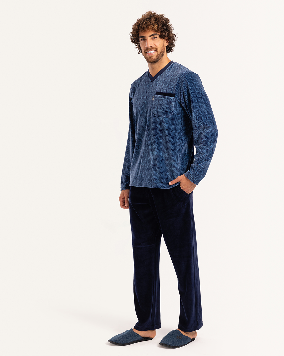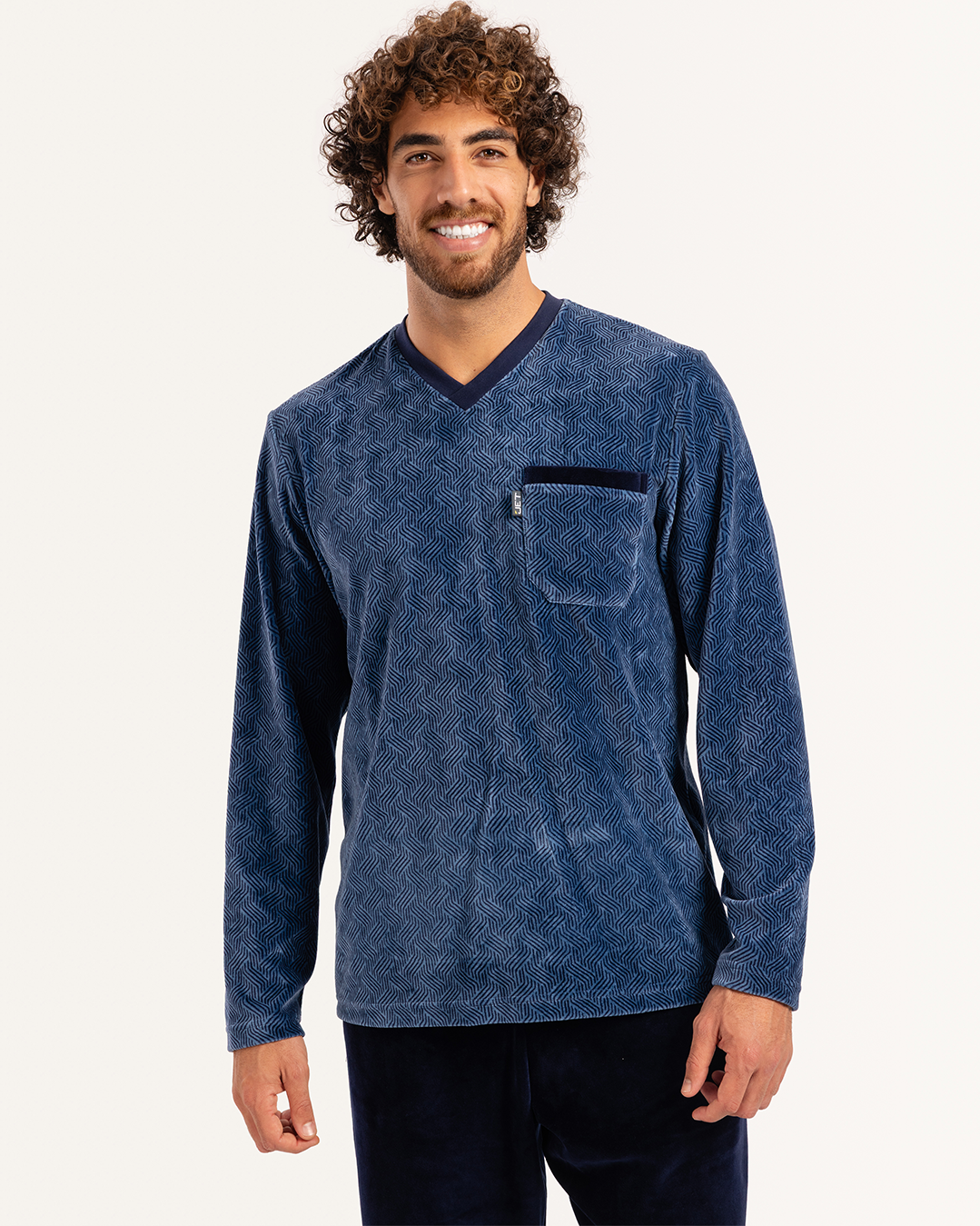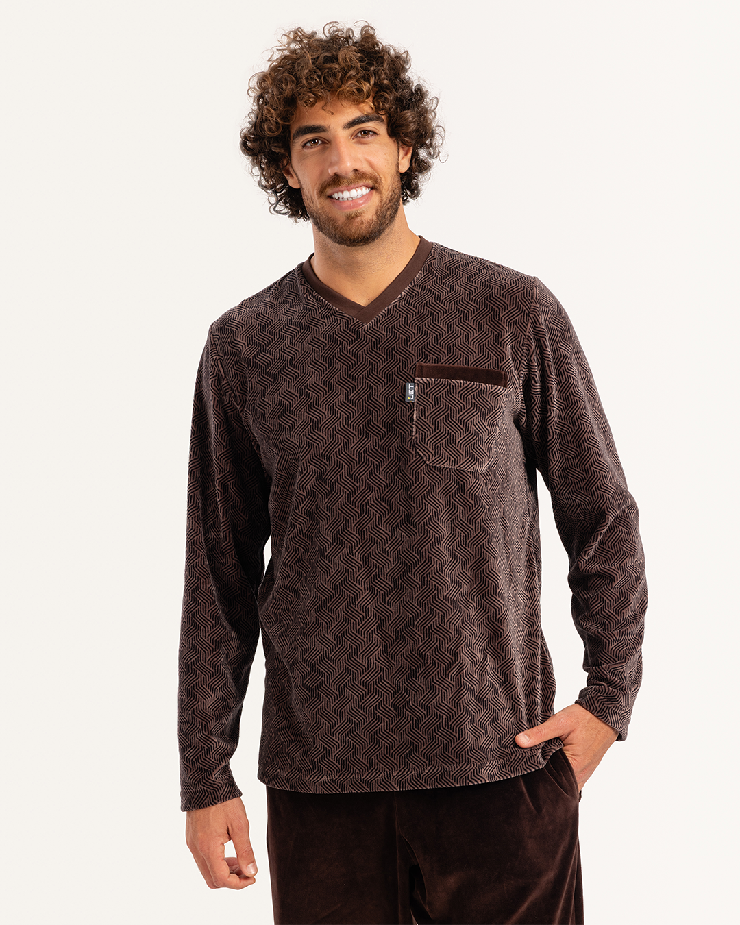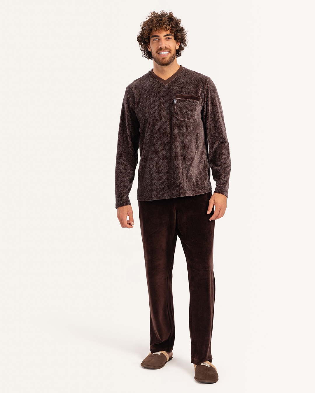 بيجاما رجالى قطيفة توب مطبوع  رقبه V جيب على الصدر و بنطلون ساده