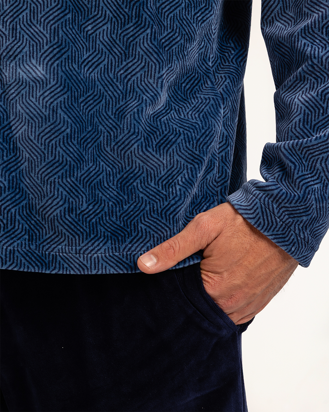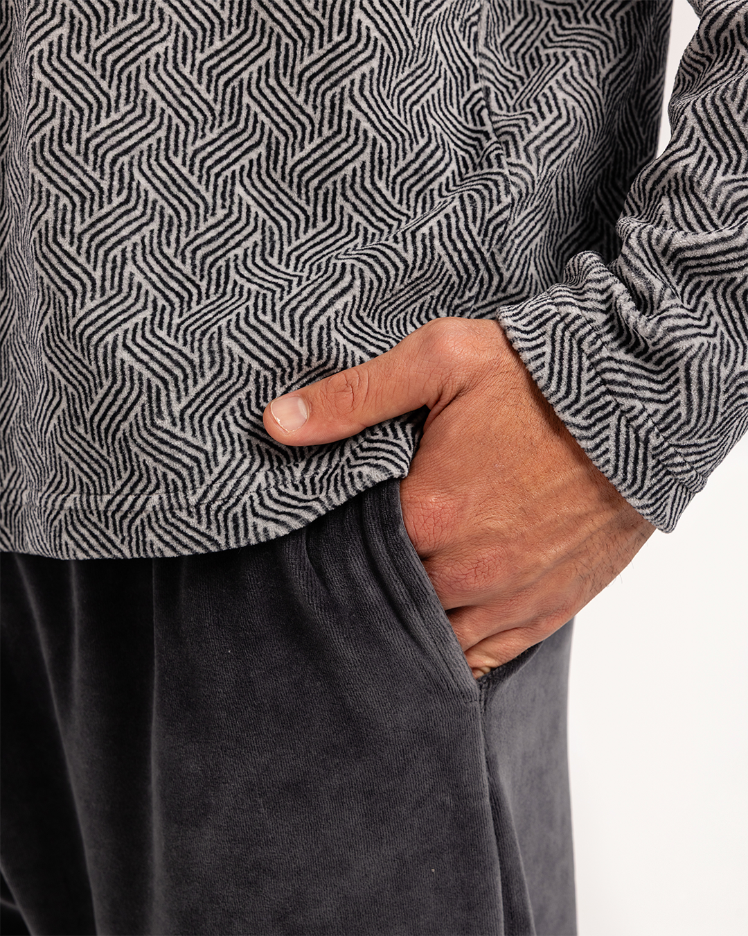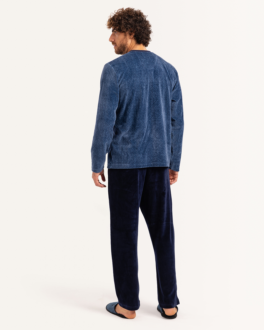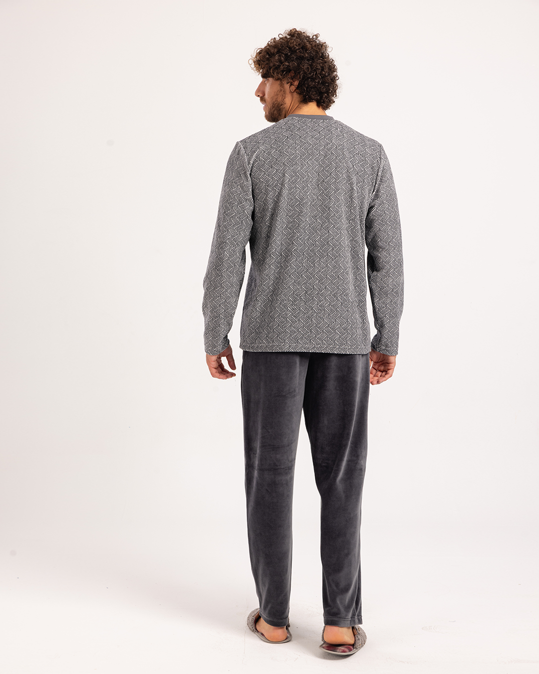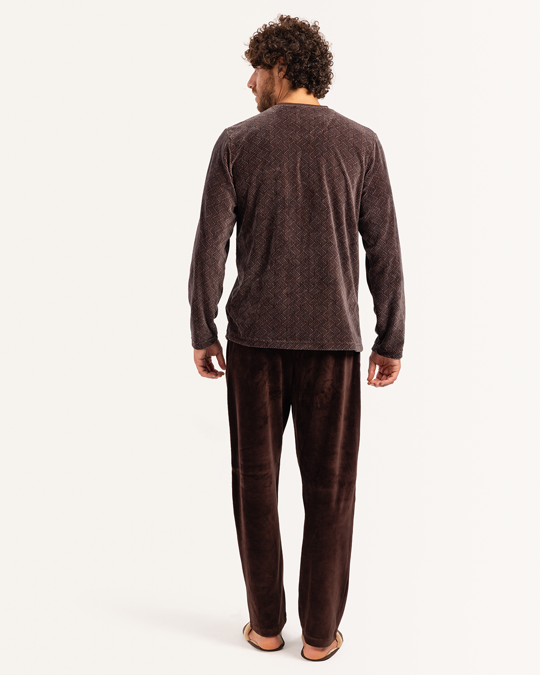 بيجاما رجالى قطيفة توب مطبوع  رقبه V جيب على الصدر و بنطلون ساده