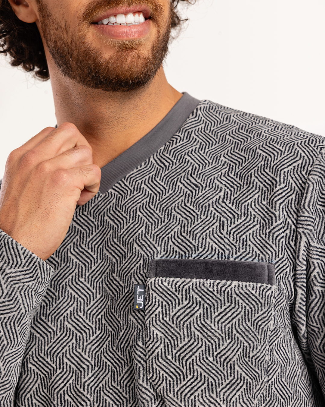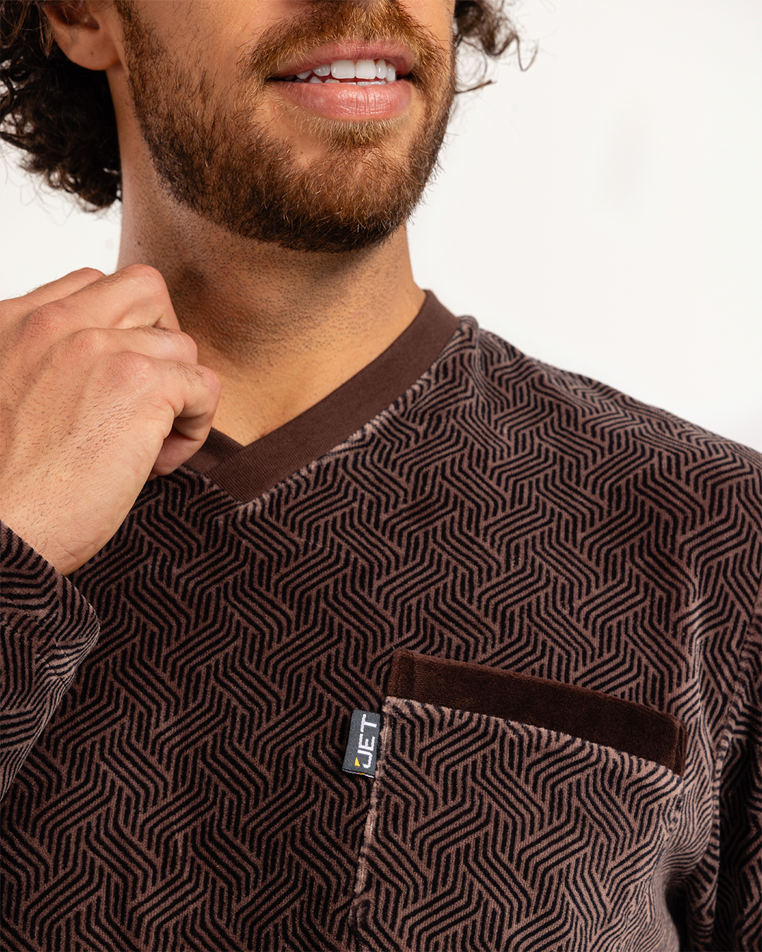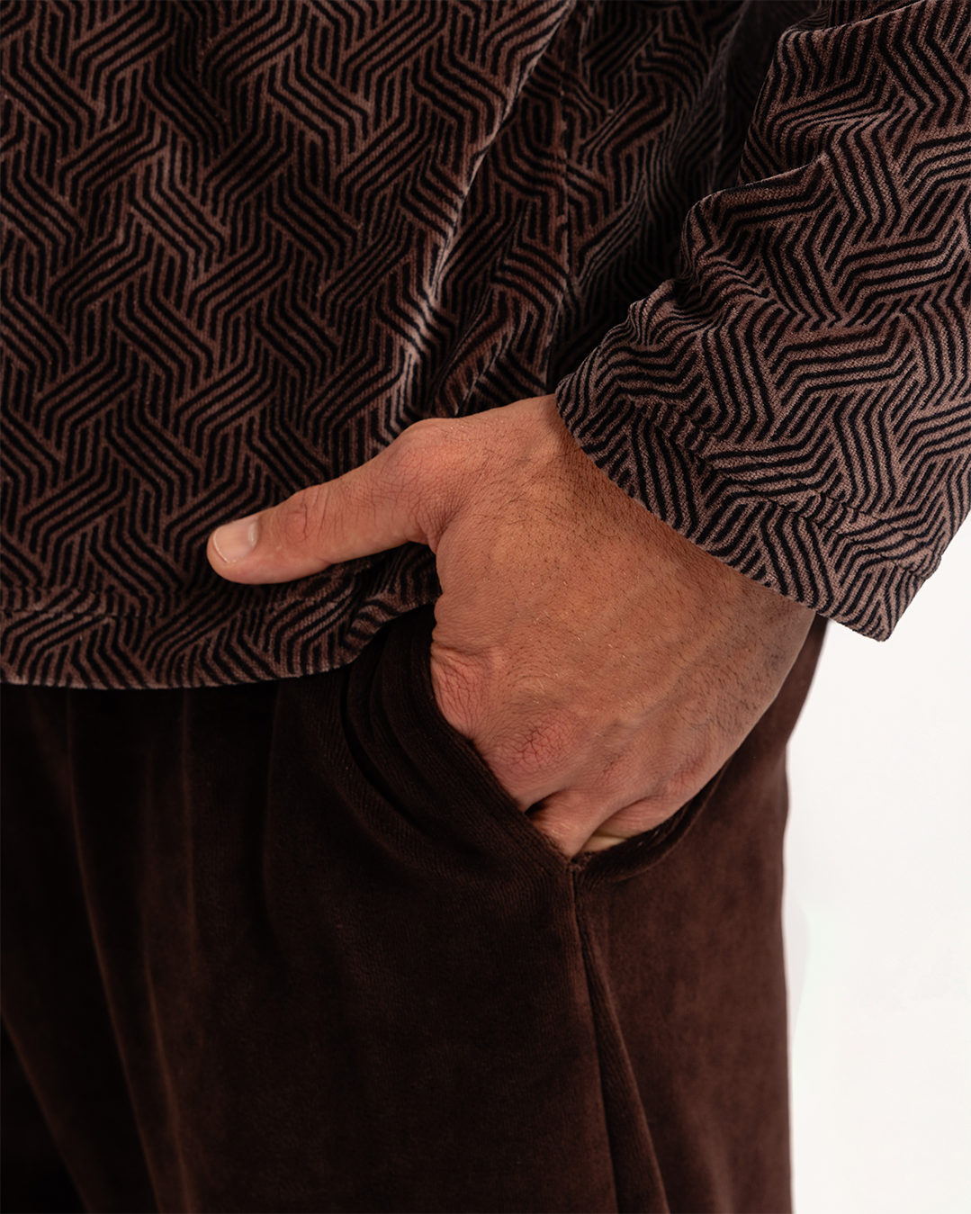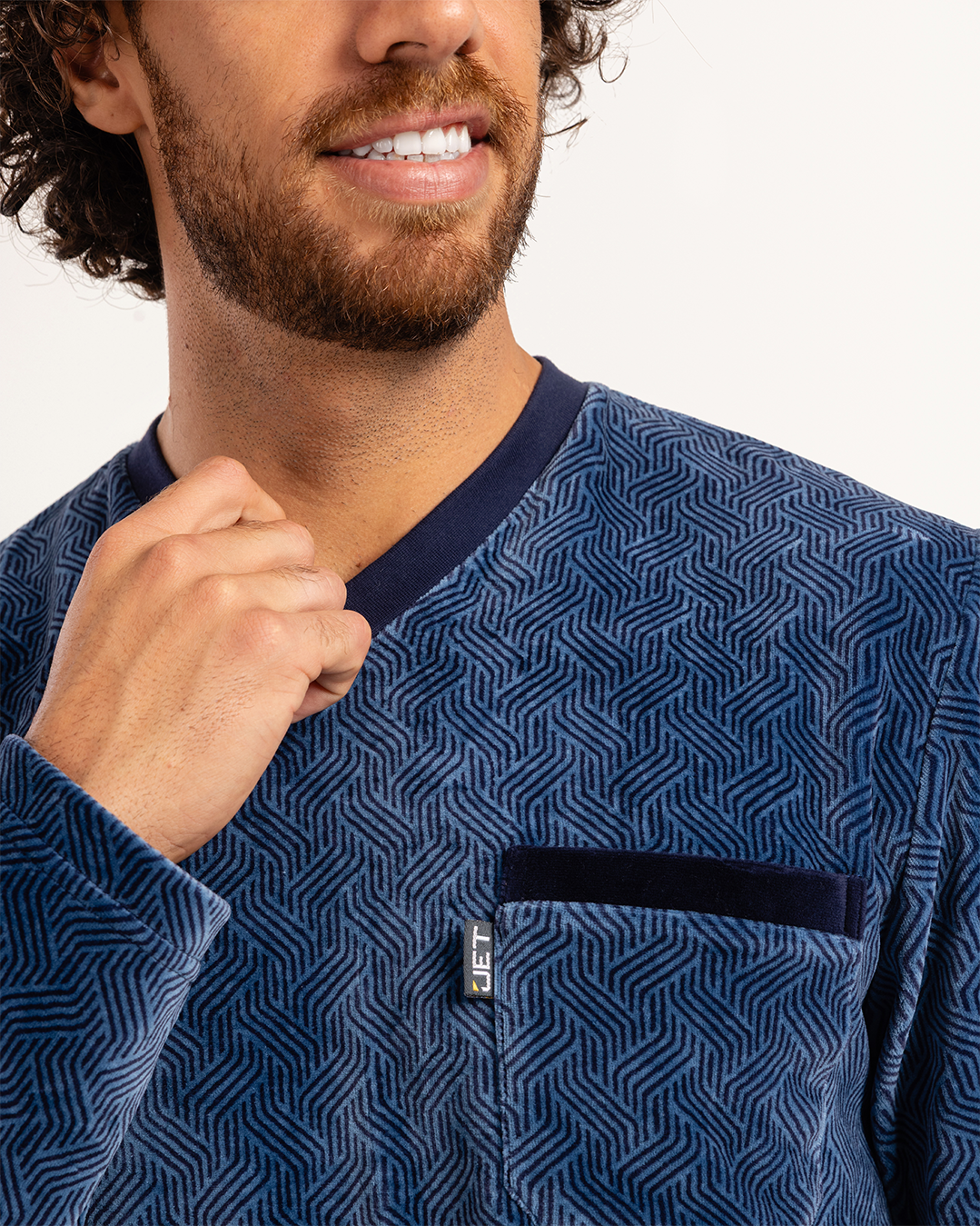 بيجاما رجالى قطيفة توب مطبوع  رقبه V جيب على الصدر و بنطلون ساده