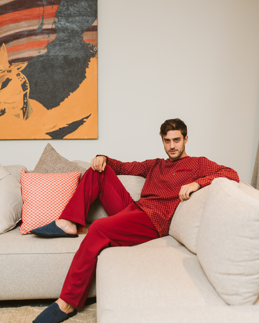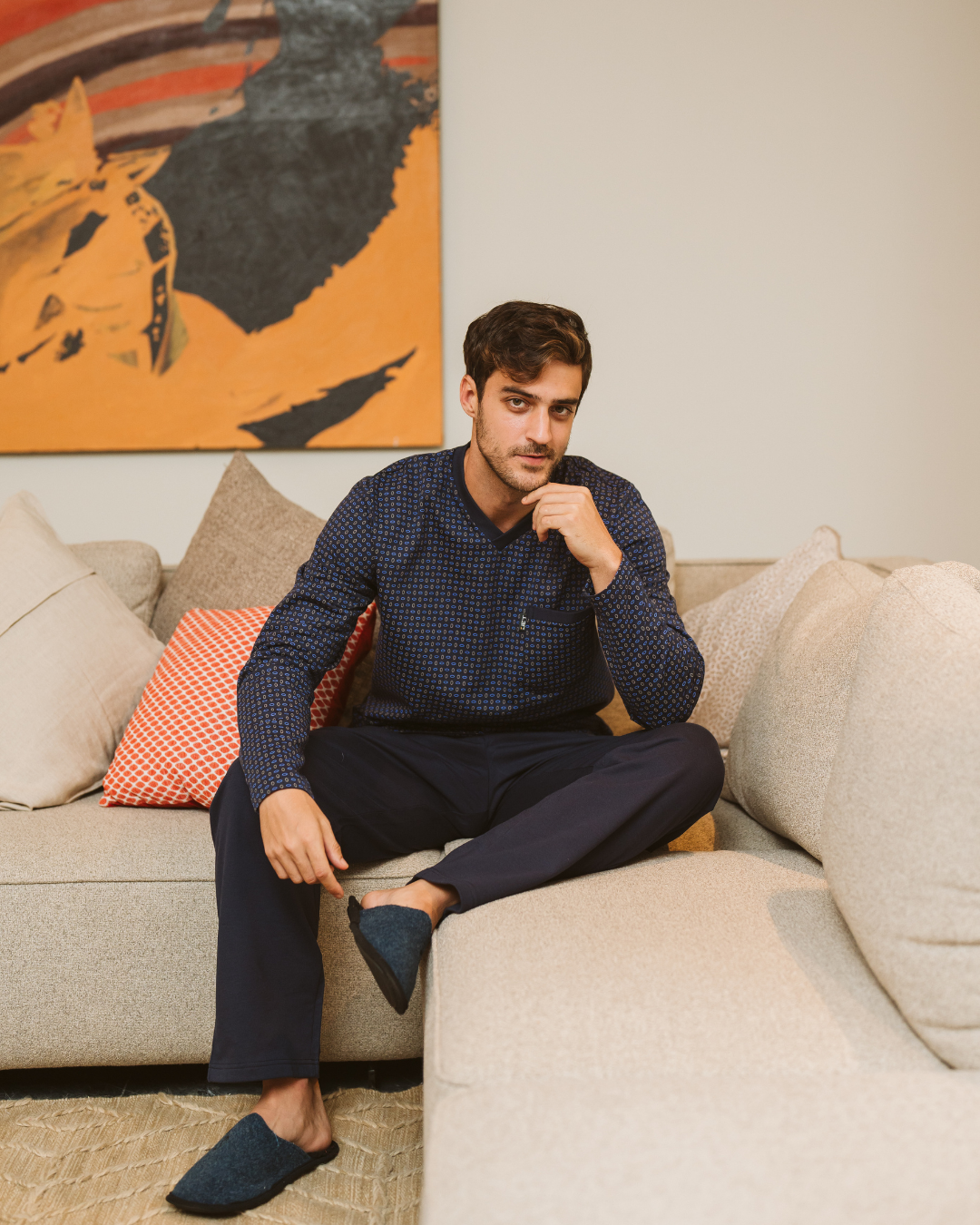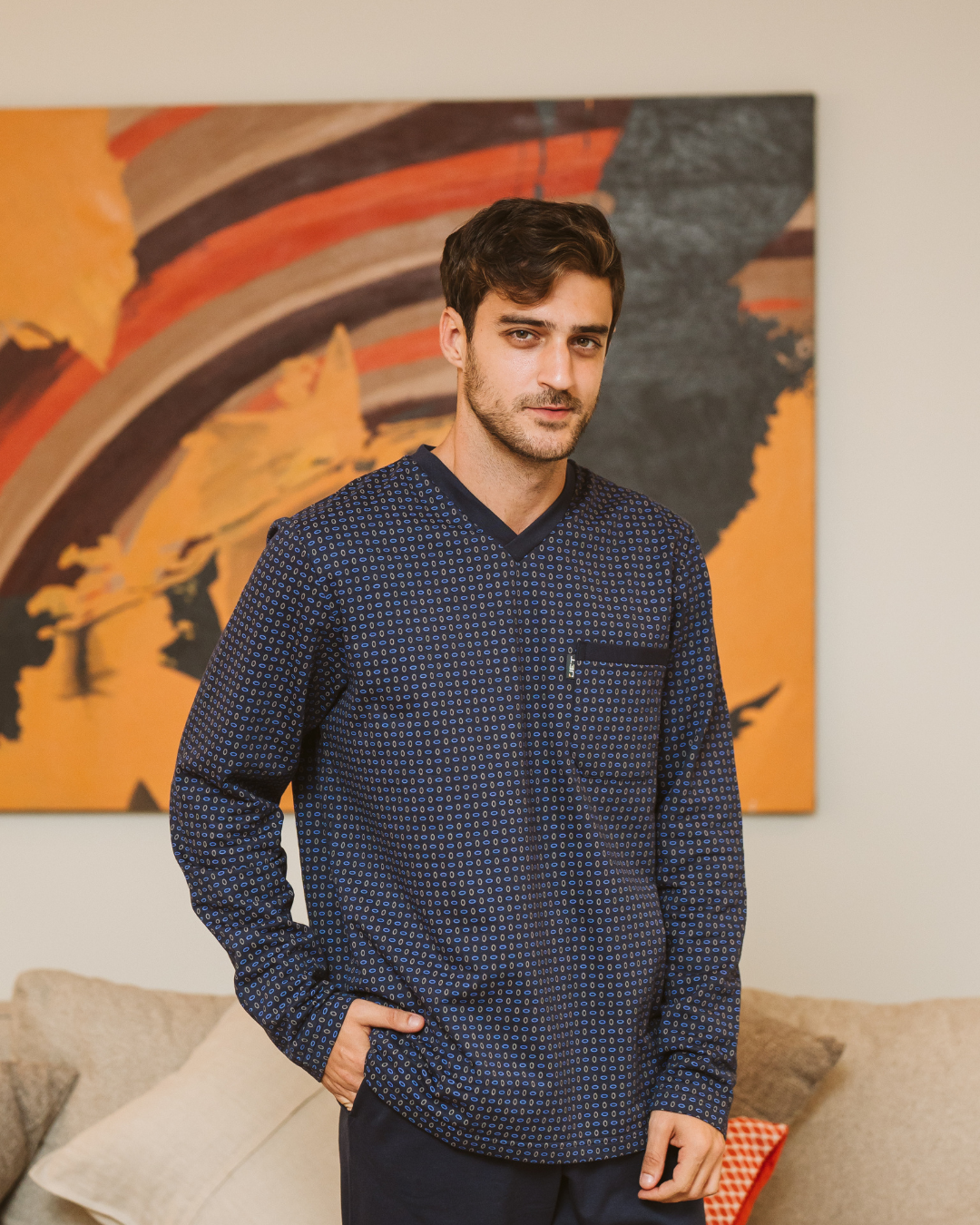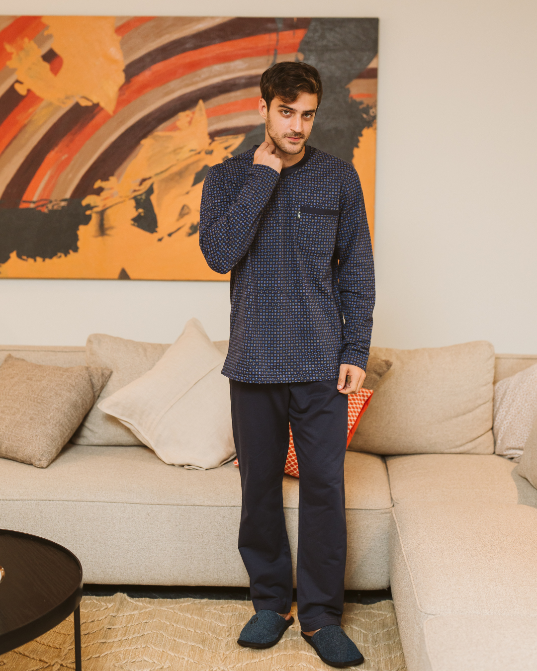 بيجاما رجالى مصبوغ مطبوع  * سادة ، جاكيت مصبوغ مطبوع كم طويل مع رقبة