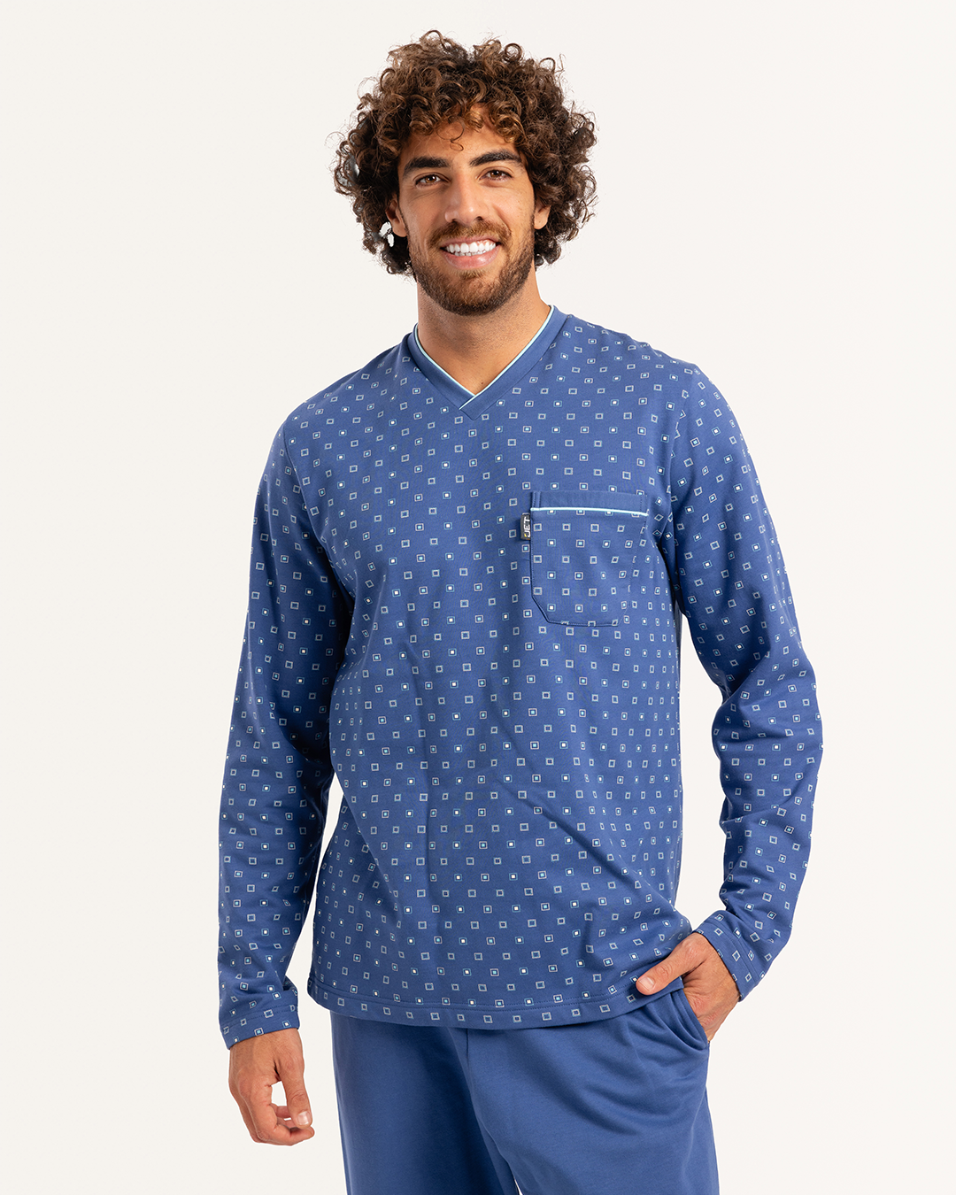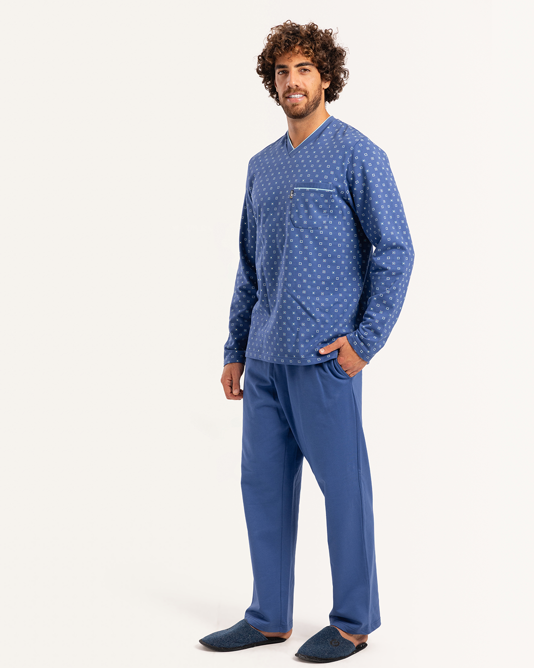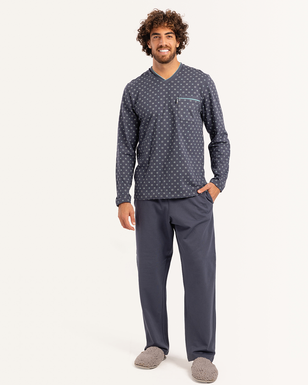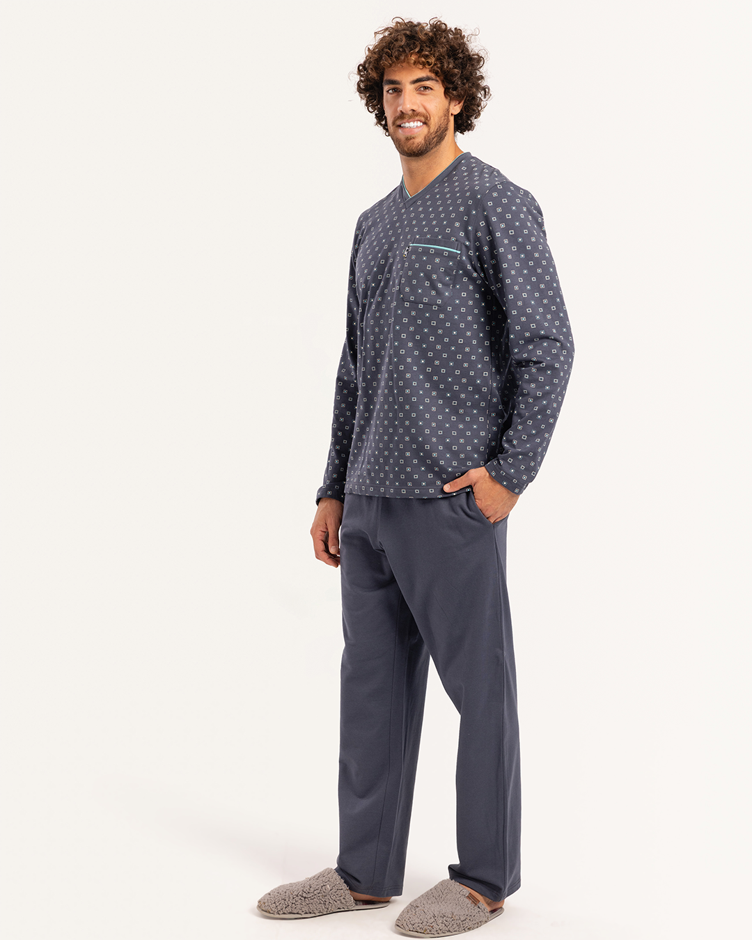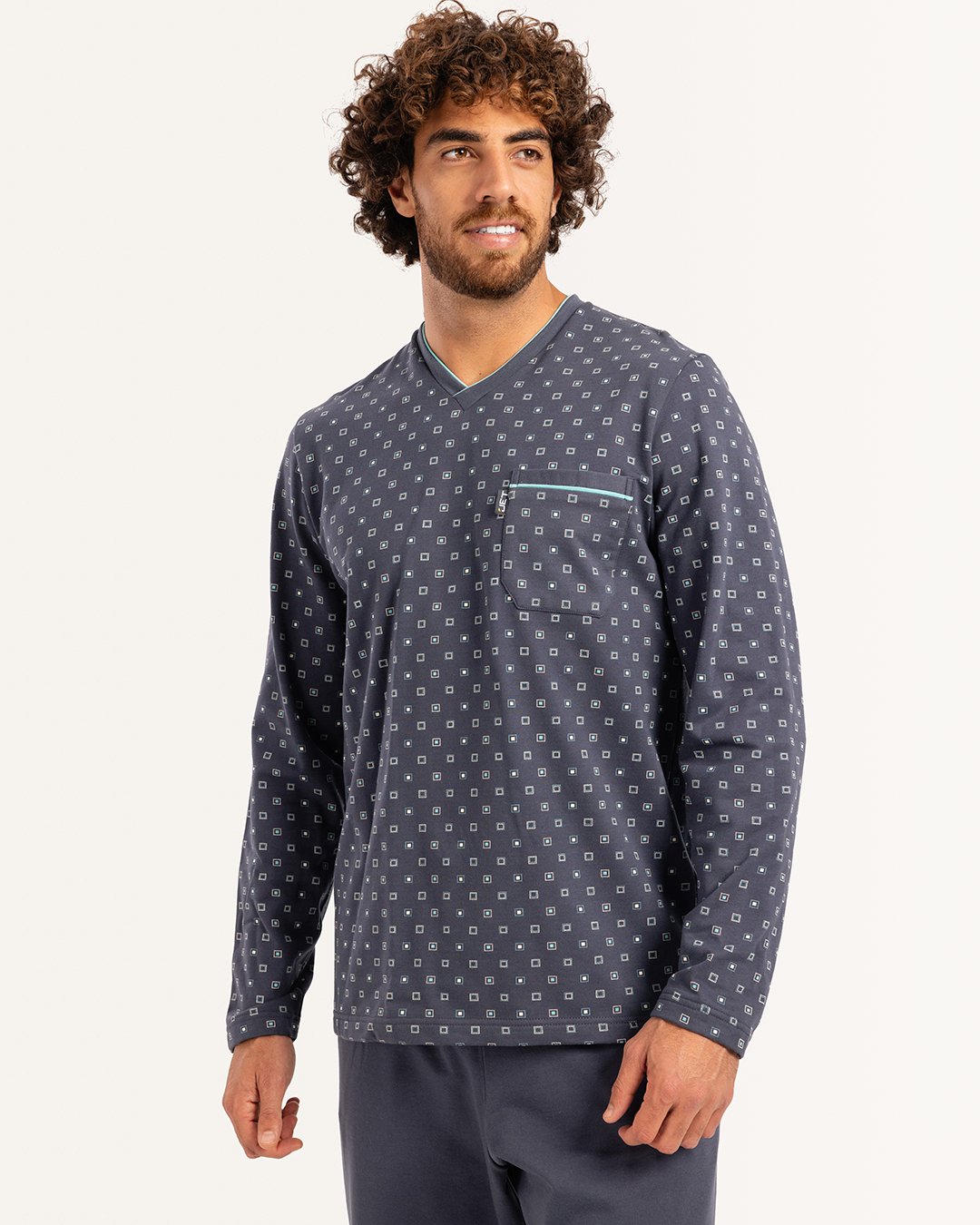 بيجاما رجالى ميلتون  توب مطبوع  رقبه V جيب على الصدر مع بنطلون سادة