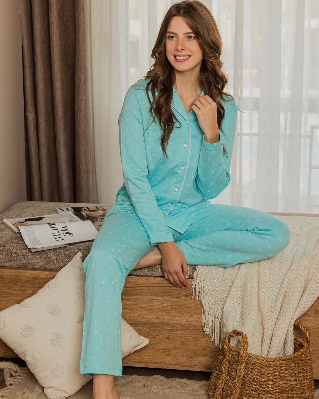 بيجامه حريمي كلاسيك جاكيت مطبوع مفتوح بزراير بكم طويل وبنطلون مطبوع