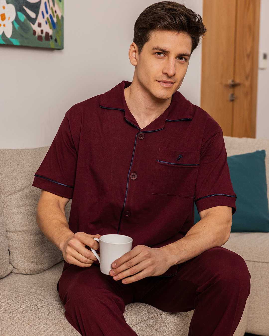 بيجامه رجالي بزراير نص كم مفتوحة تطريز الحصان بنطلون