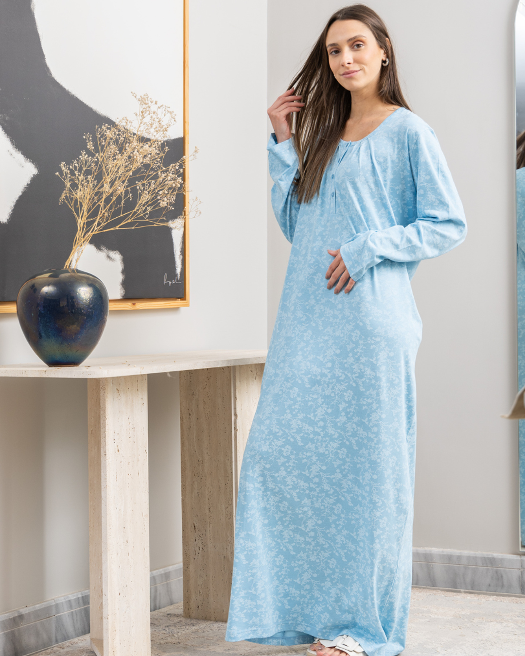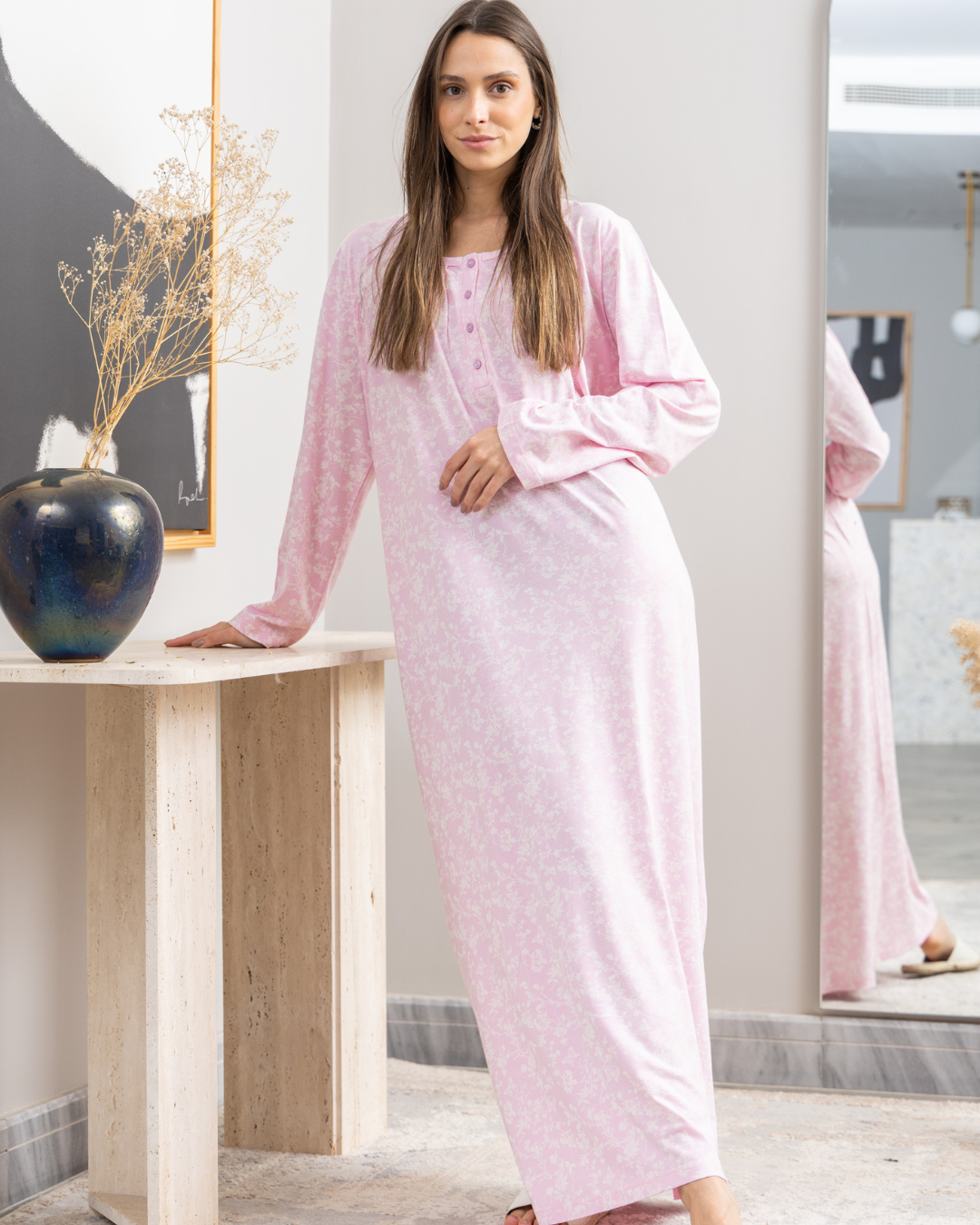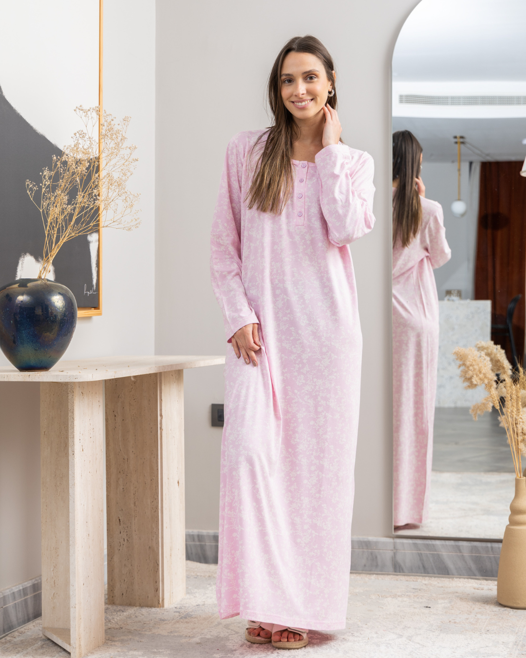 قميص نوم حريمي طويل بكم راوند بزراير طباعه فراشات