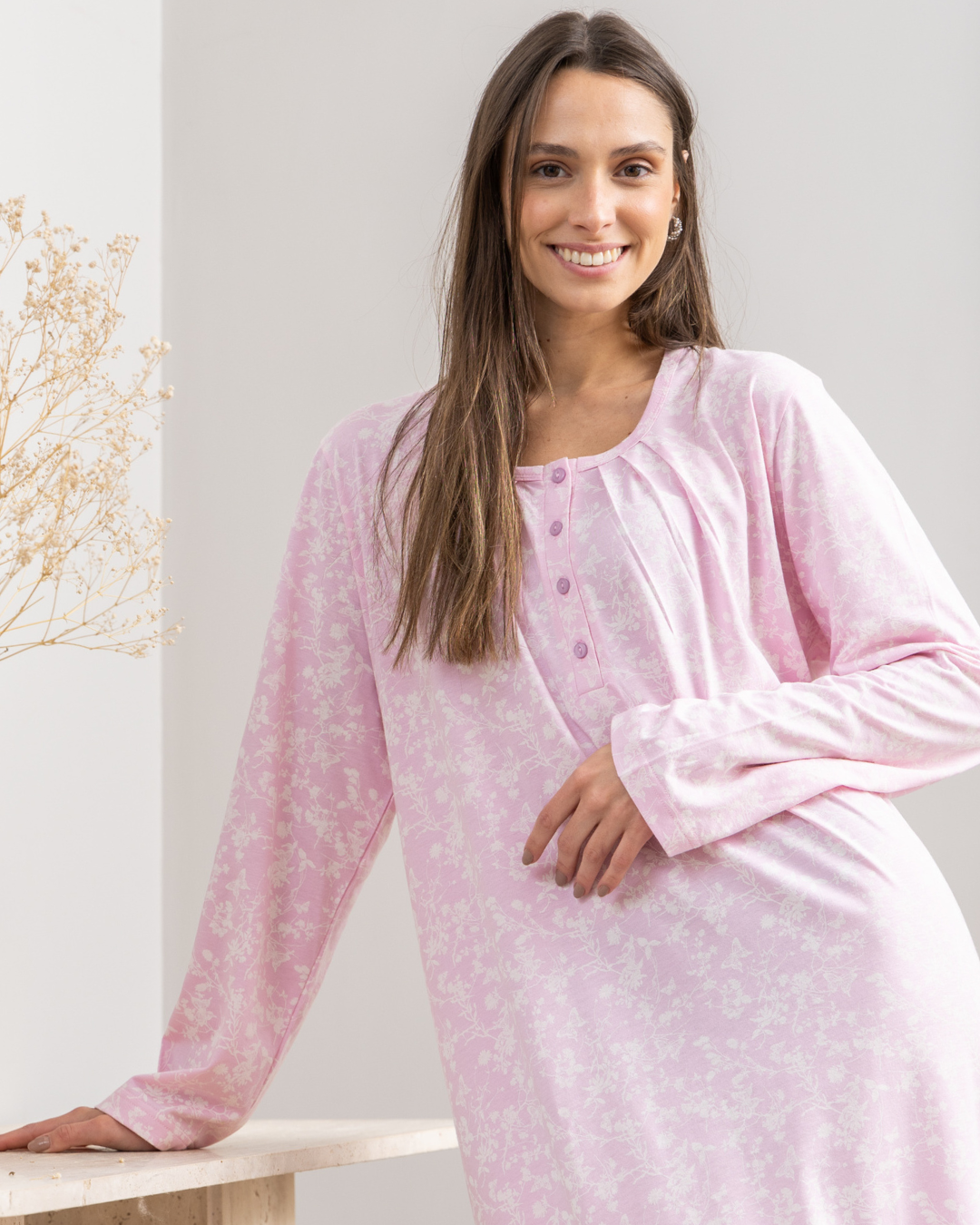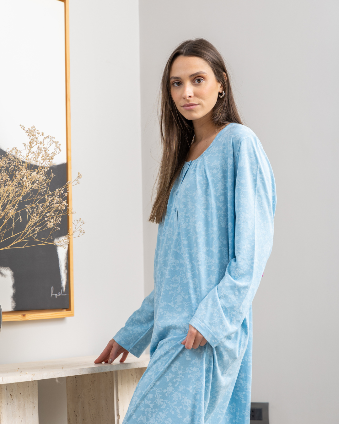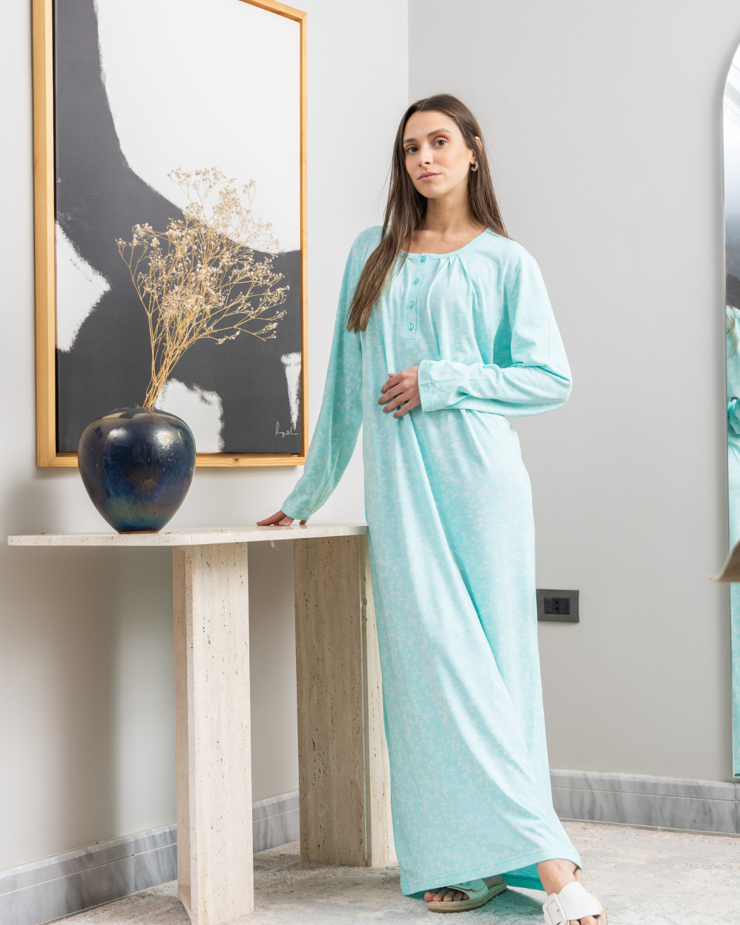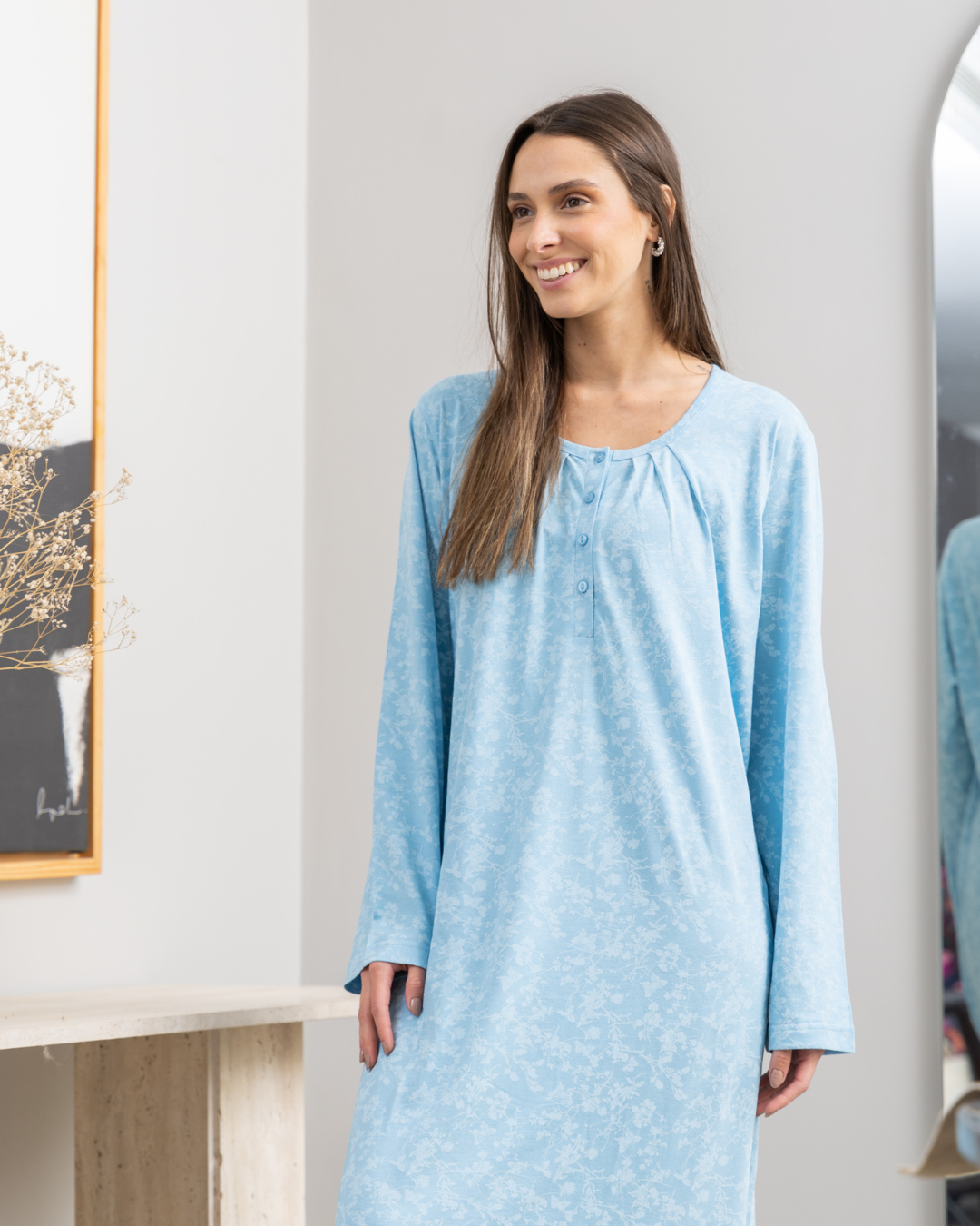 قميص نوم حريمي طويل بكم راوند بزراير طباعه فراشات