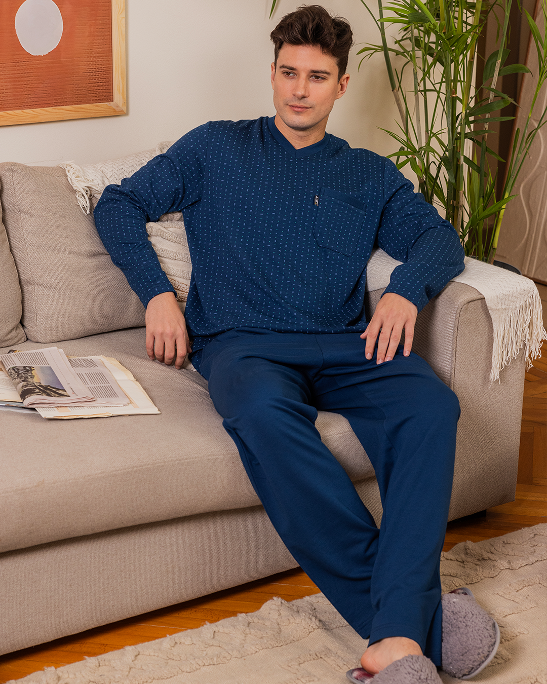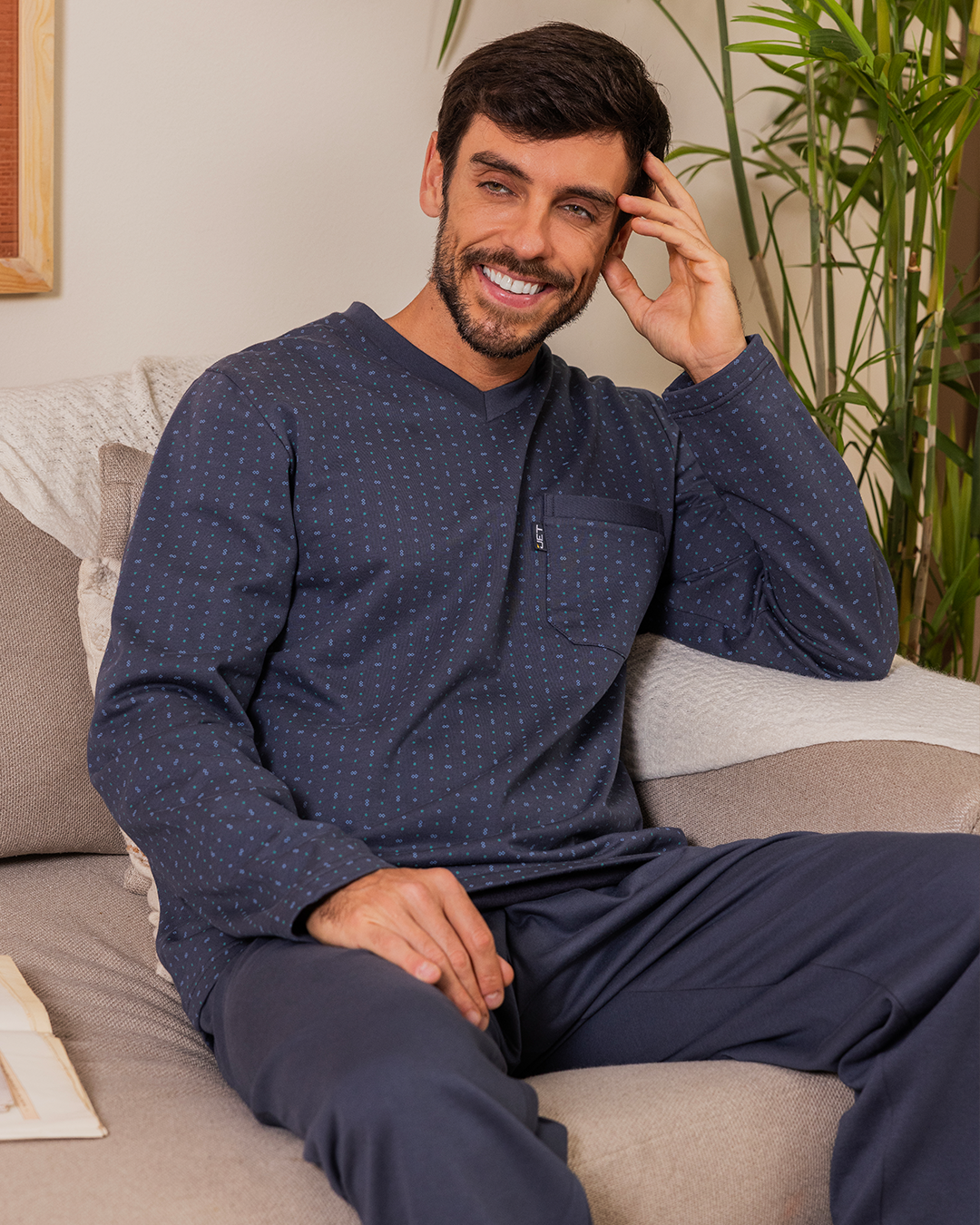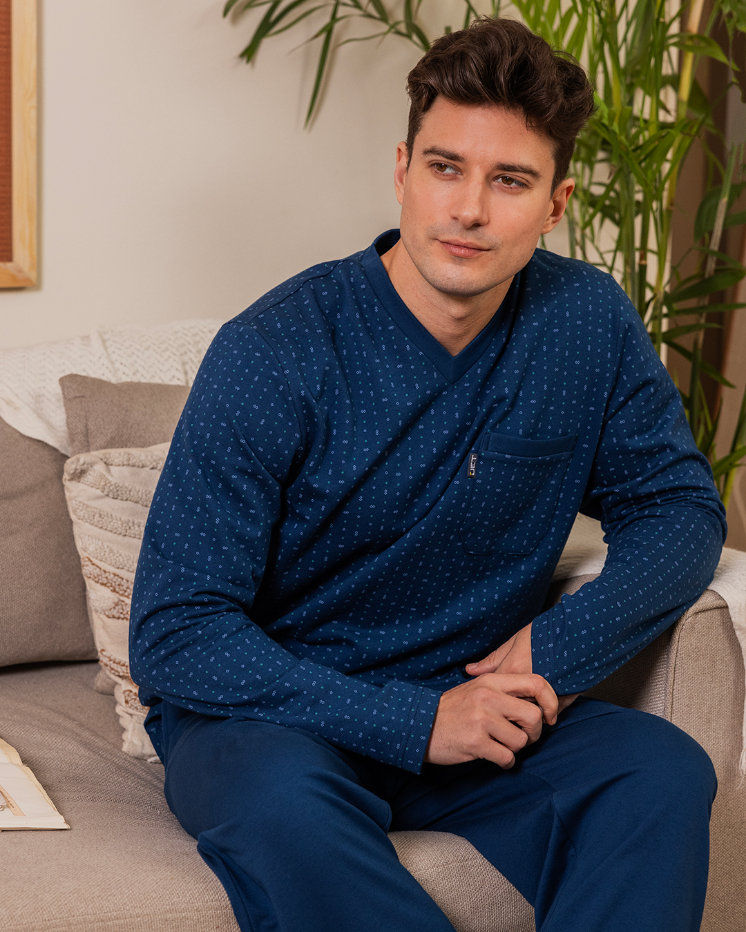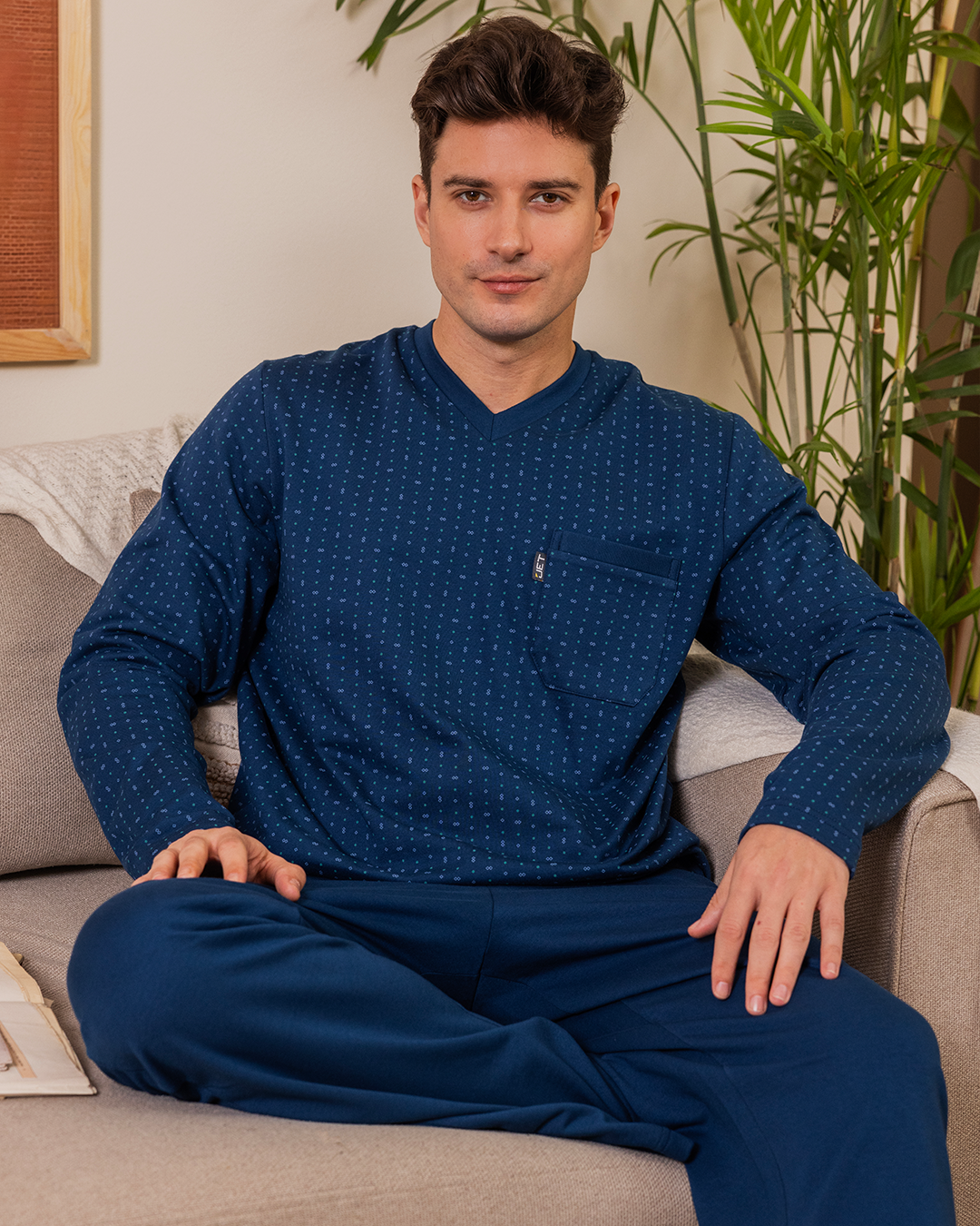 وجيب علي الصدر وبنطلون ساده V بيجامه رجالي تيشرت مطبوع سمبوكسه بكم طويل برقبة