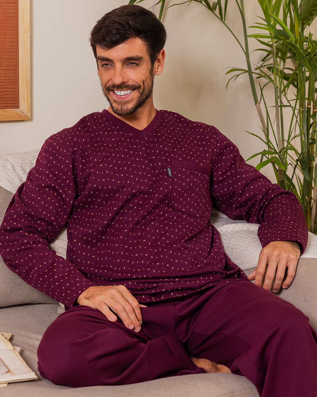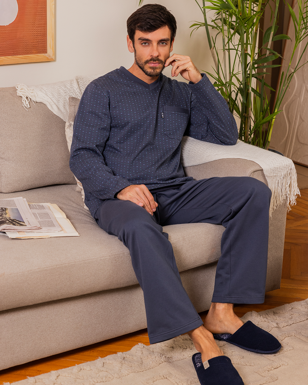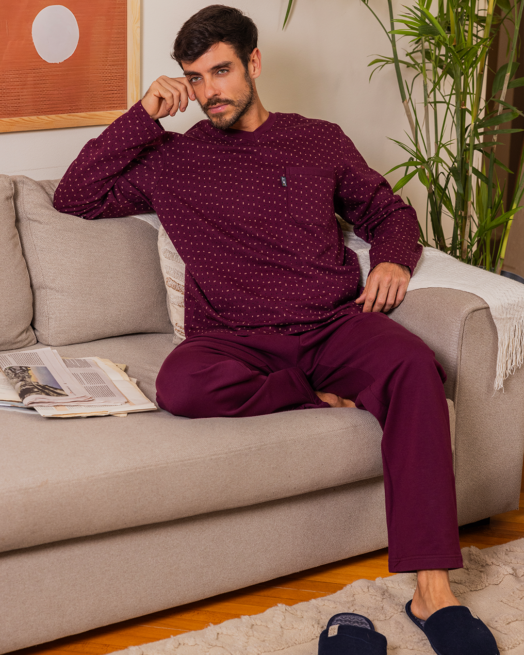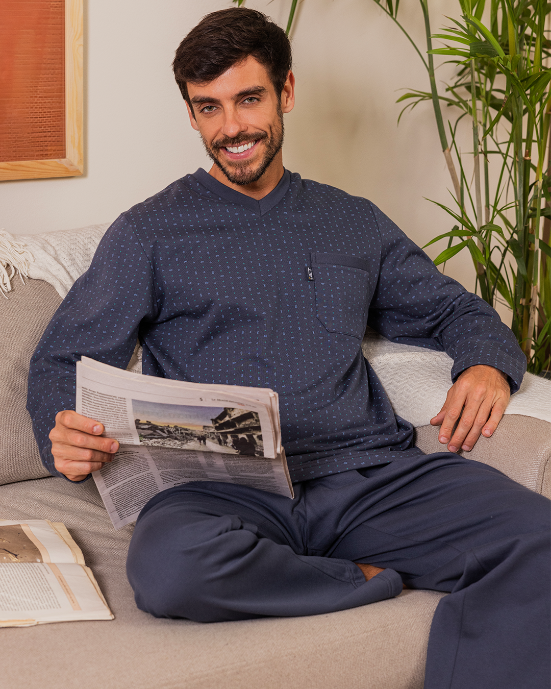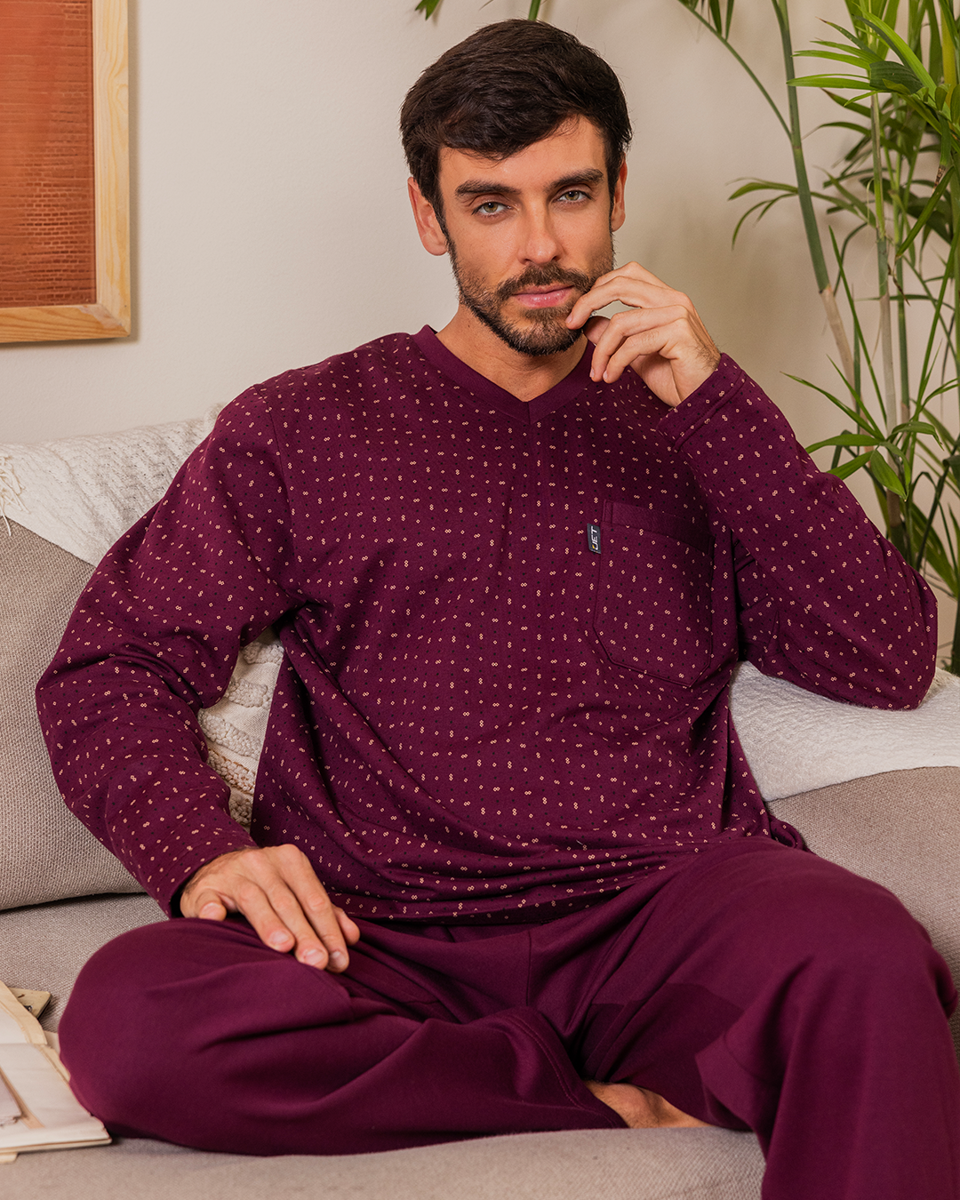 وجيب علي الصدر وبنطلون ساده V بيجامه رجالي تيشرت مطبوع سمبوكسه بكم طويل برقبة