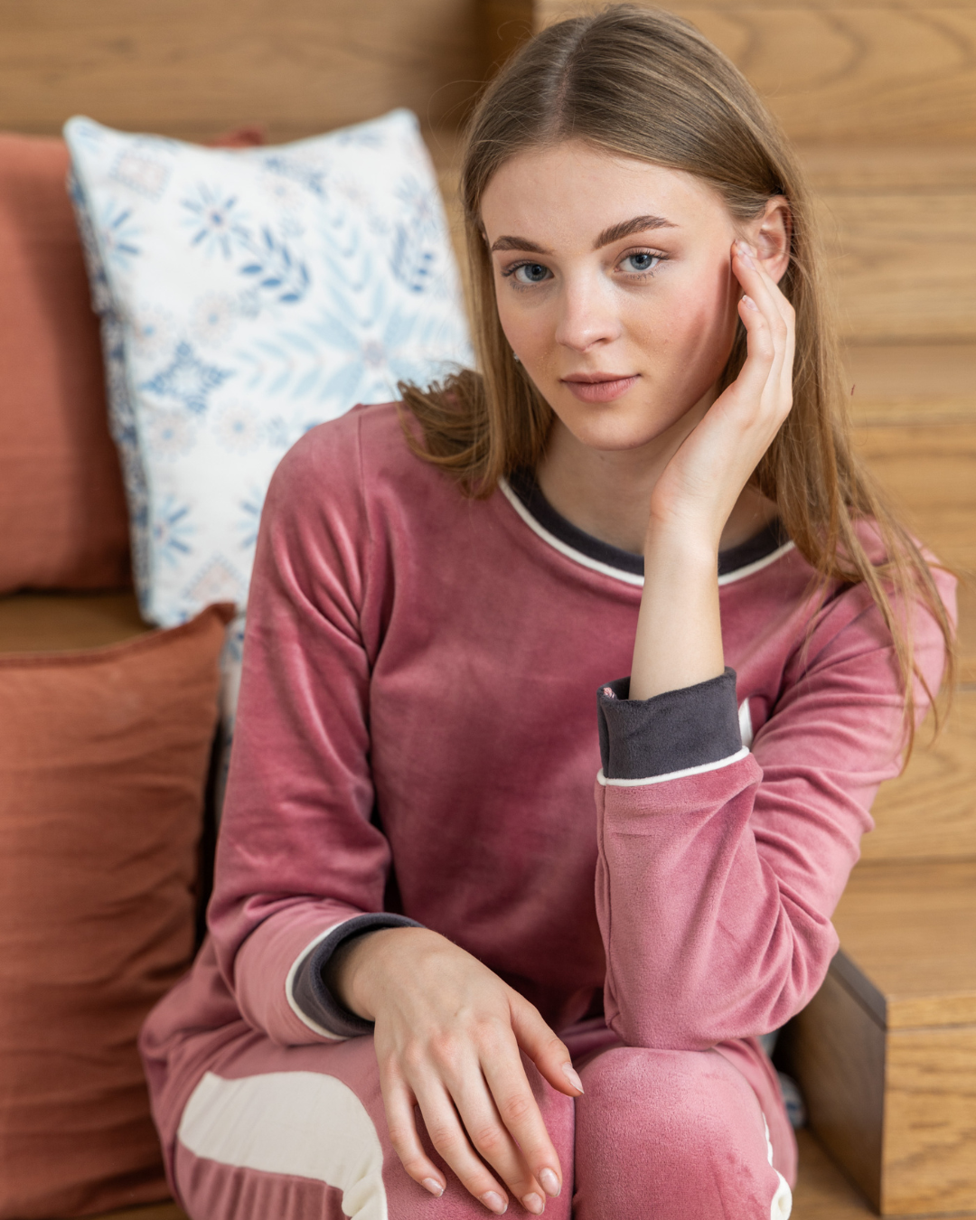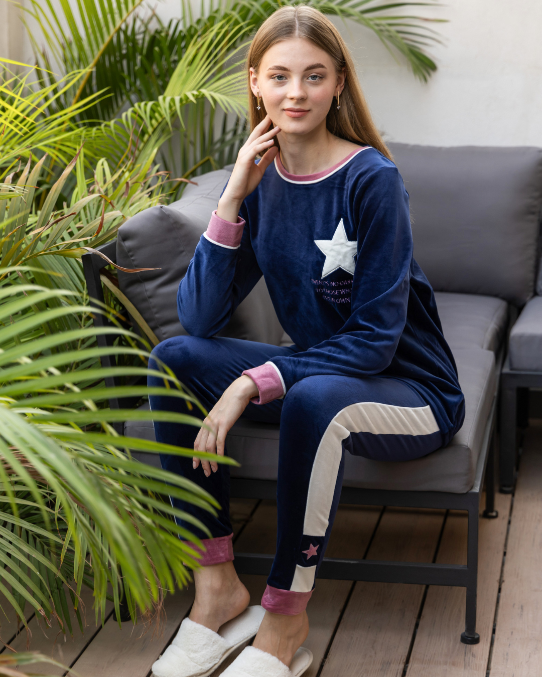 بيجامه حريمي قطيفة كنزة سادة تطريز نجمة