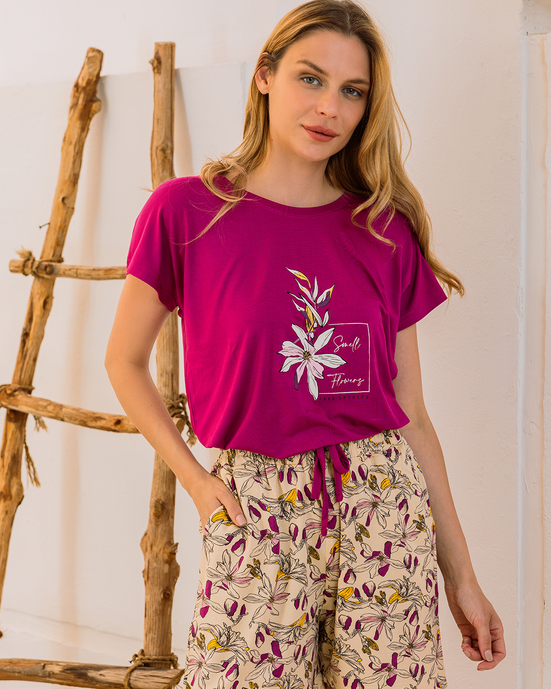 Smell Flowers بيجاما حريمي نص كم وشورت مطبوع فسكوز ليكرا