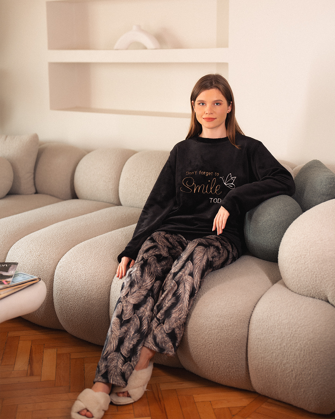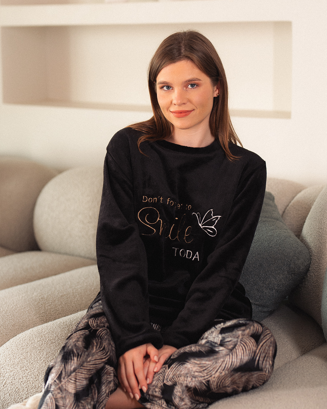Smile بيجامة حريمي دوران تطريز علي الصدر بنطلون مطبوع ورق الشجر بولار