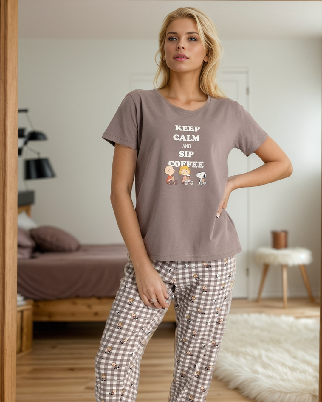 KEEP CALM AND SIP COFFEE Women's pajamas with half-sleeved T-shirt and checkered printed pants