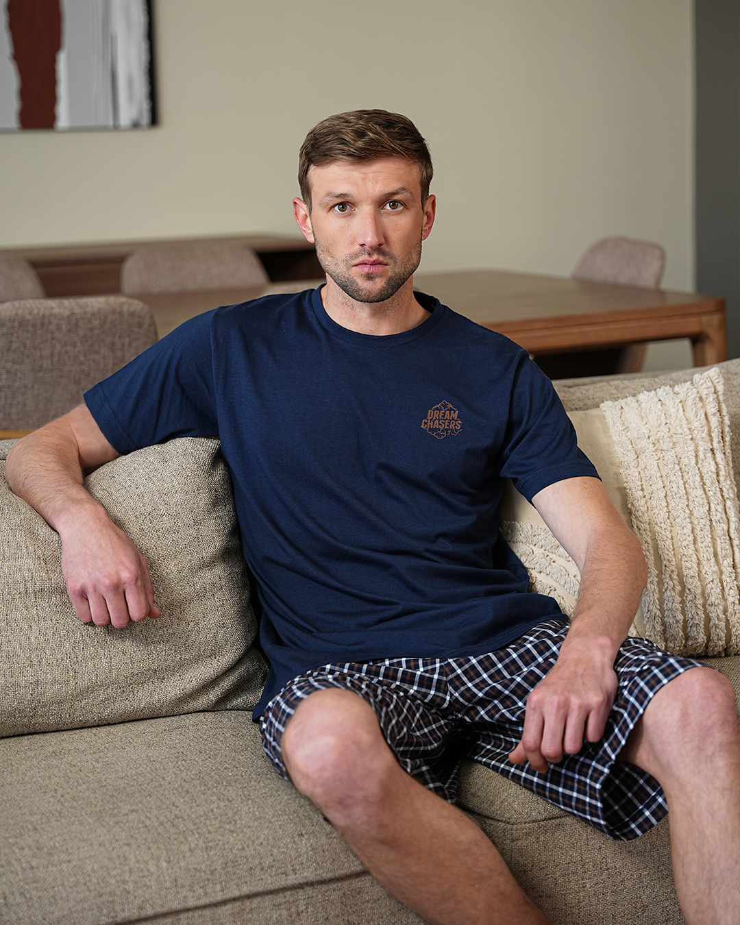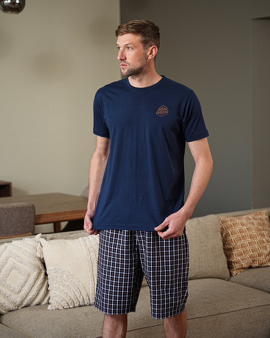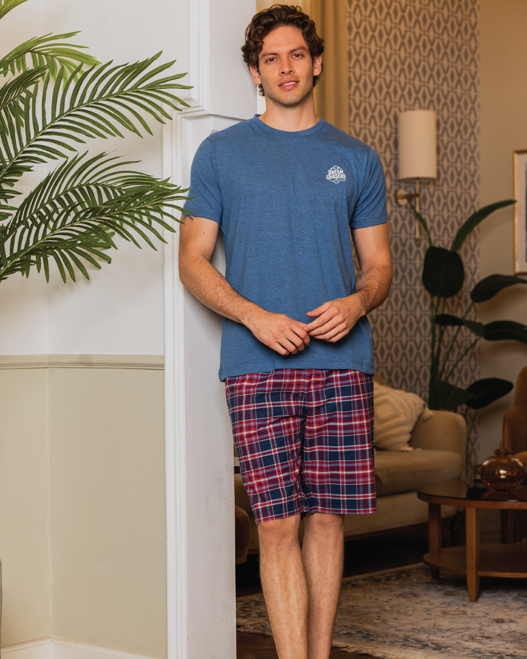 السادة Xبيجامه رجالي تيشرت نص كم رواند وشورت النسيج الكاروة
