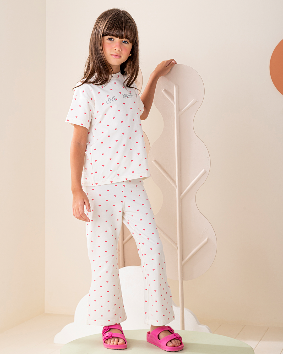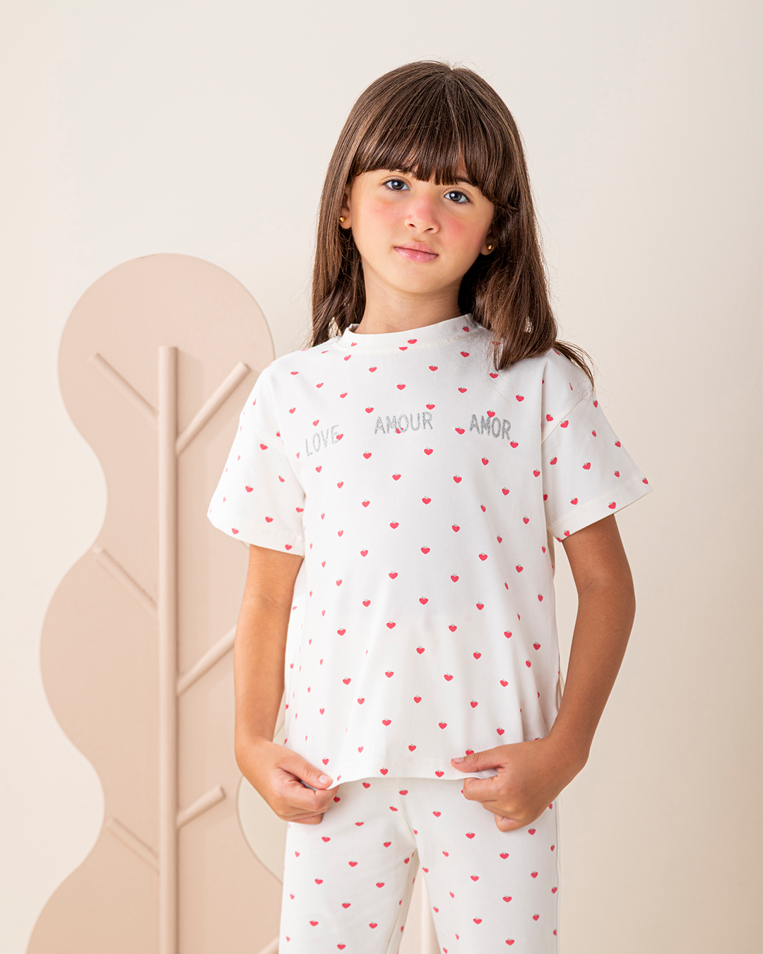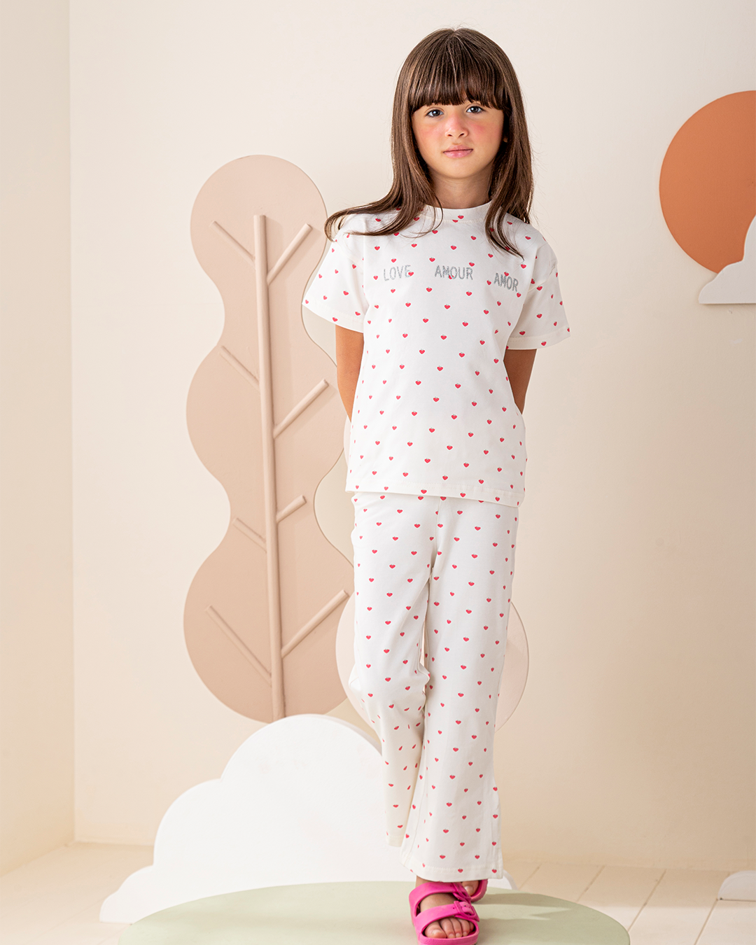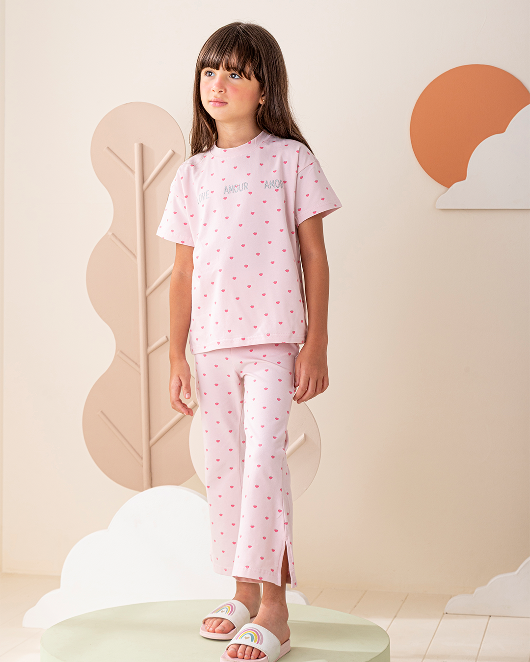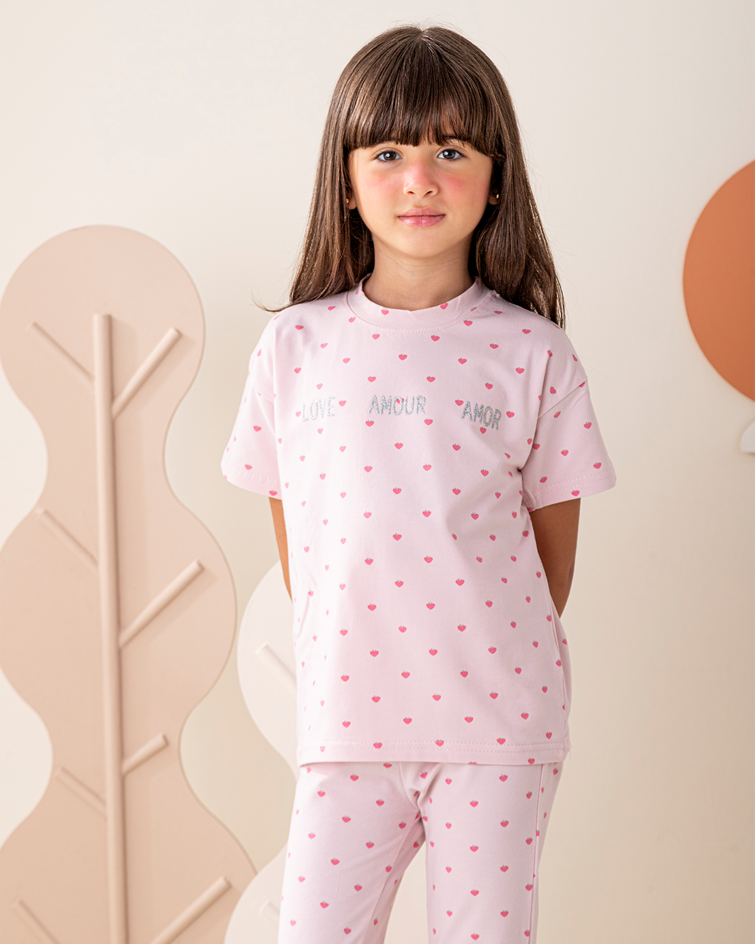 بيجاما بنطلون قطن كتف ساقط قلوب صغيره