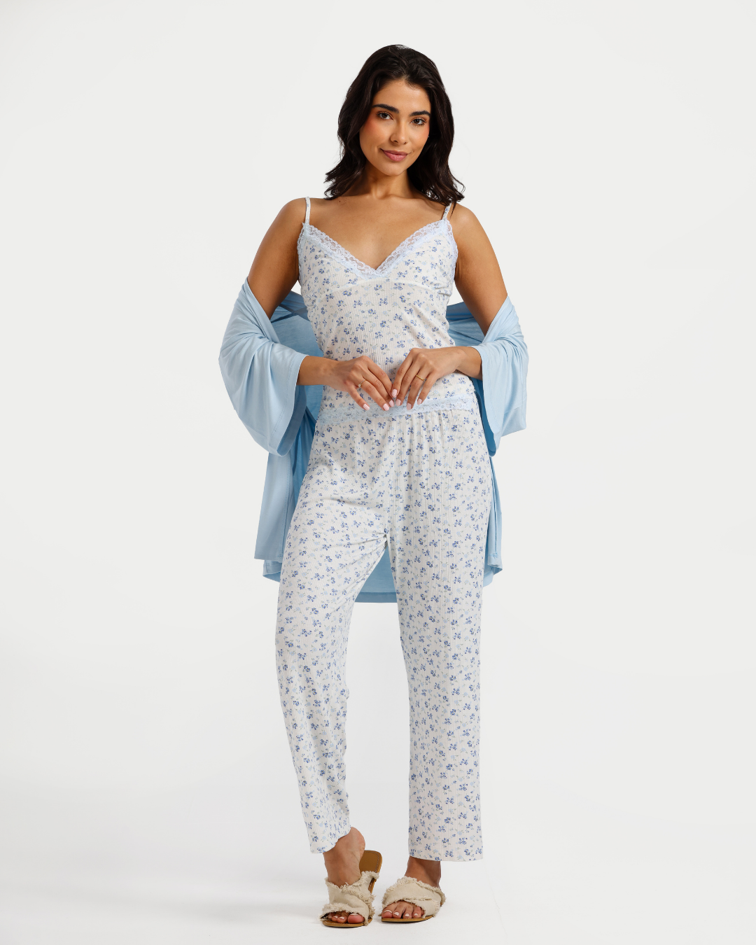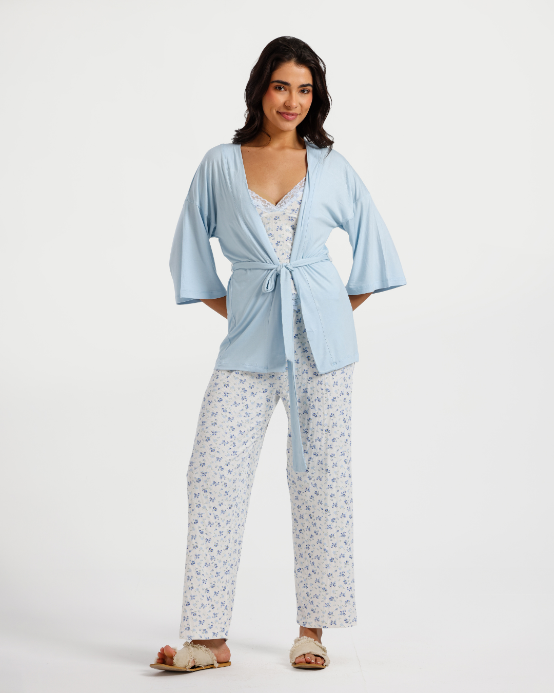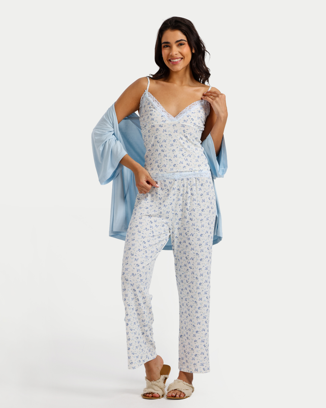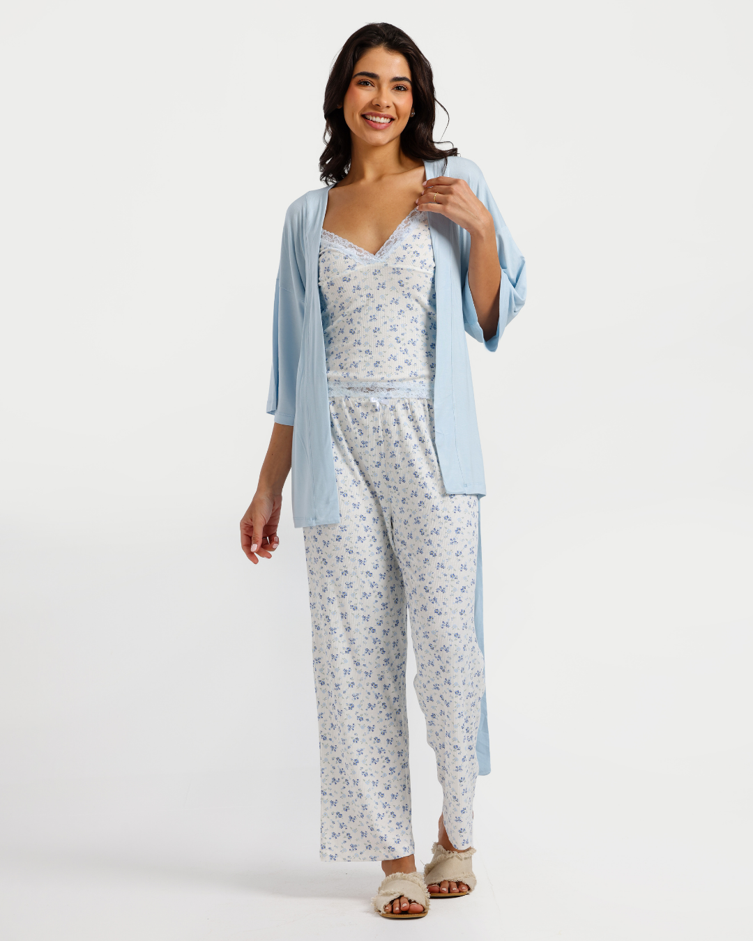 بيجاما بنطلون 3 قطع فسكوز ليكرا, ورود زرقاء