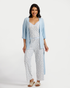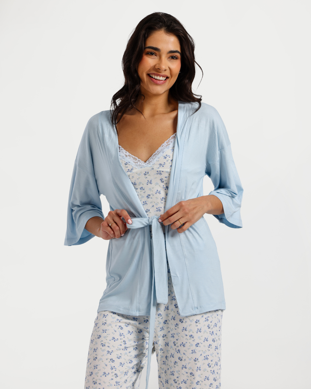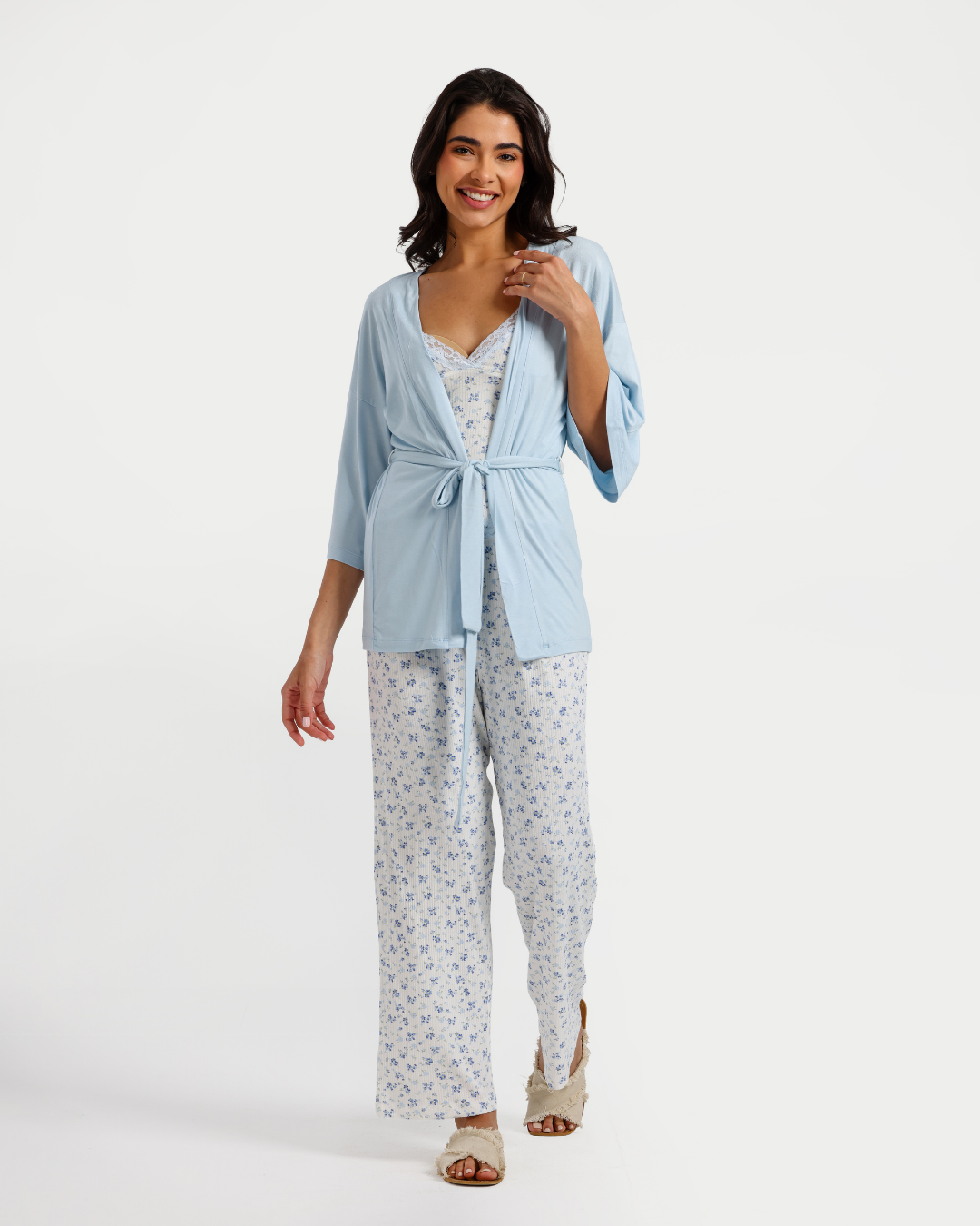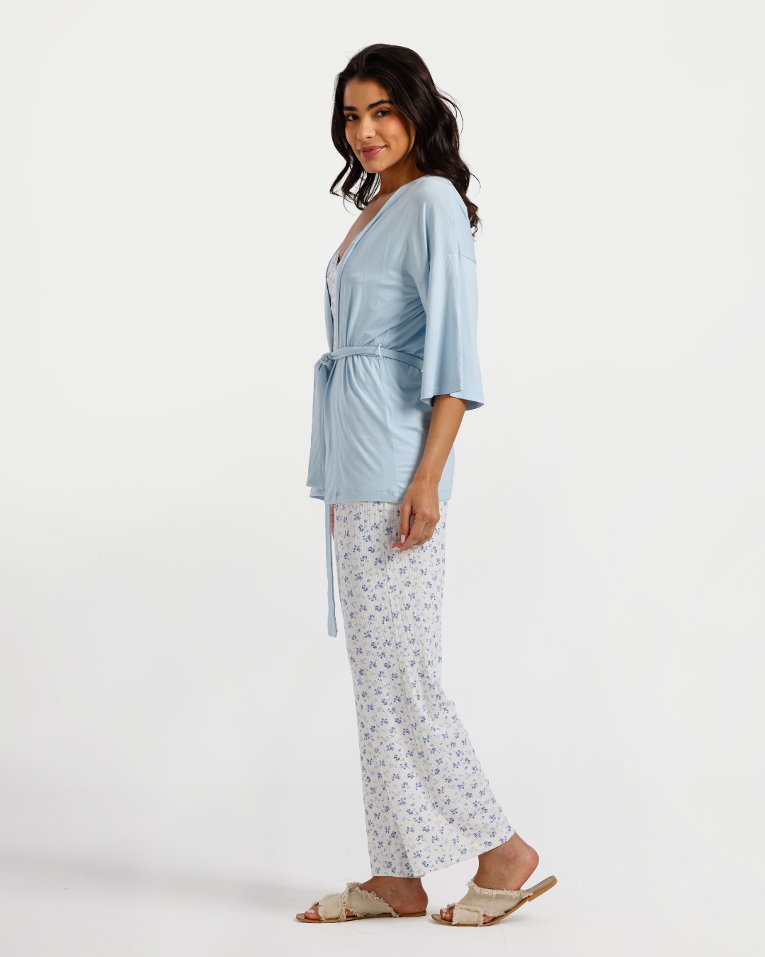 بيجاما بنطلون 3 قطع فسكوز ليكرا, ورود زرقاء