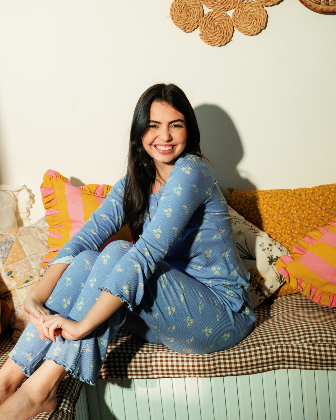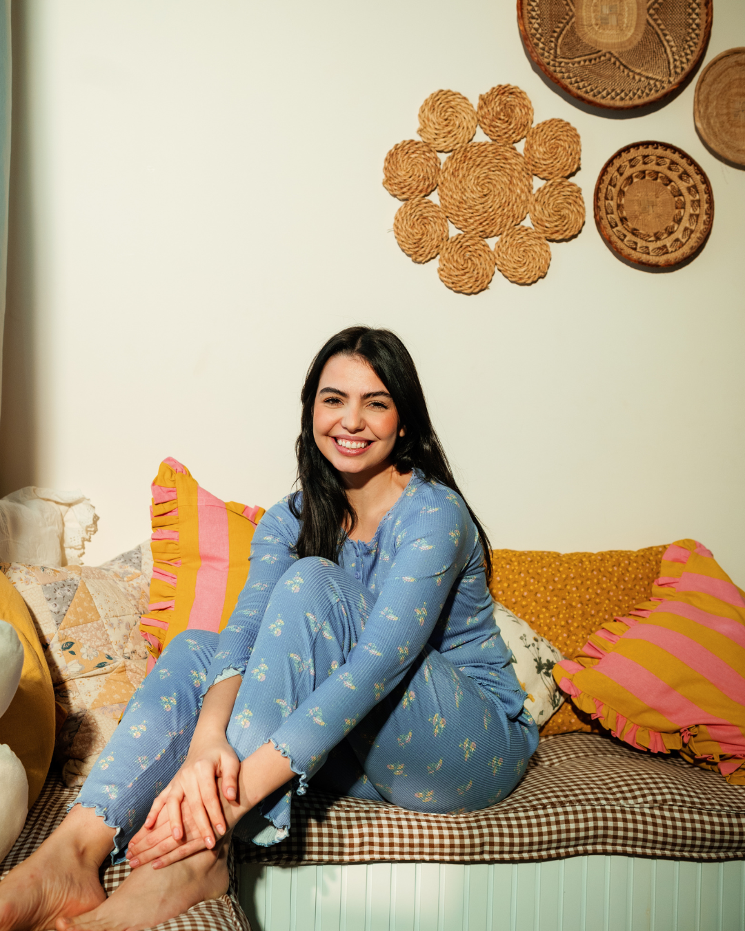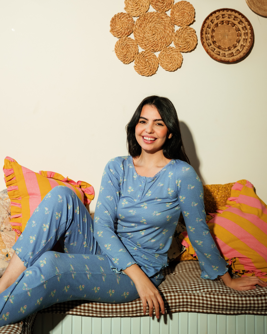 بيجاما حريمي بكم و بنطلون مطبوع ورود هندسيه صغيره