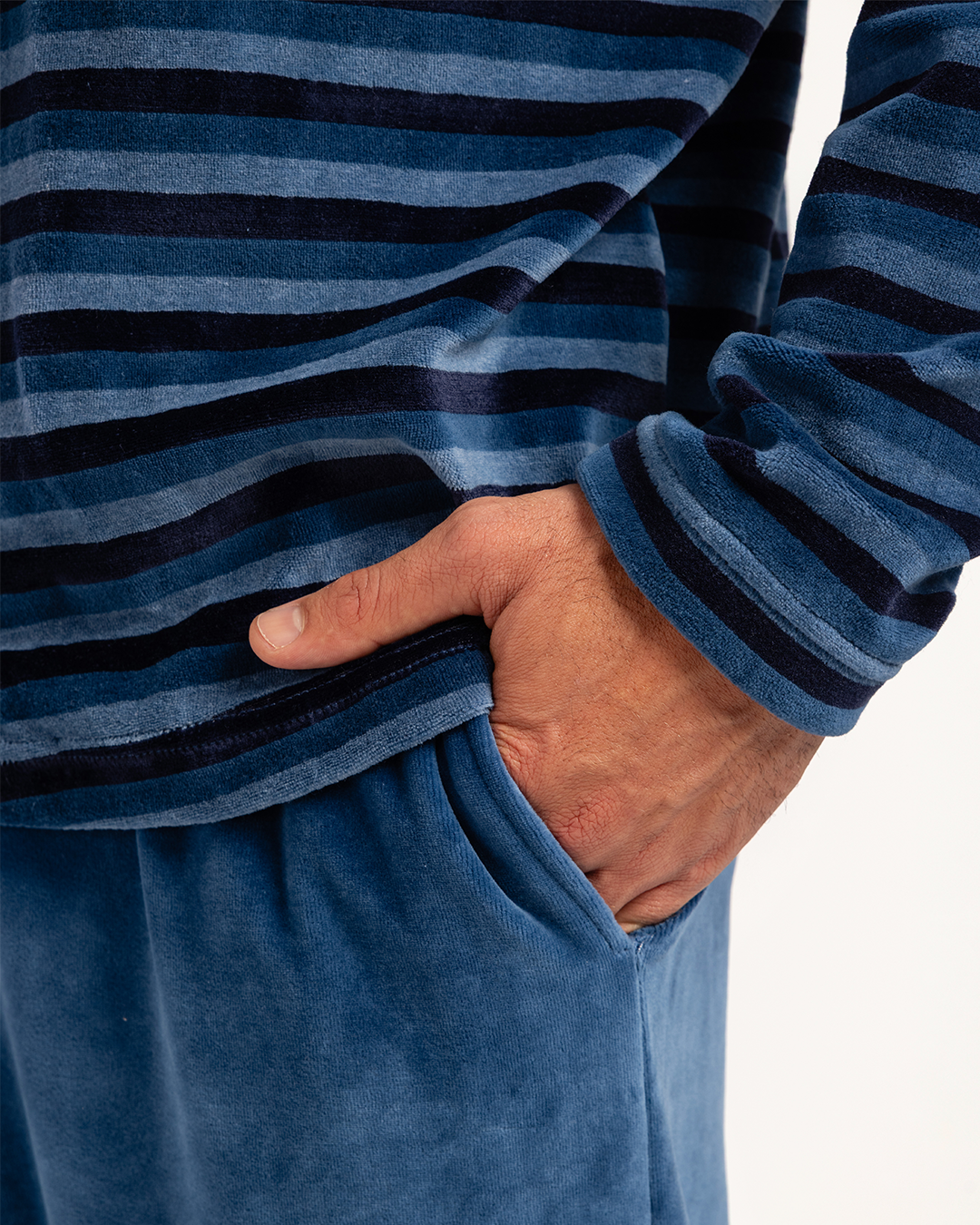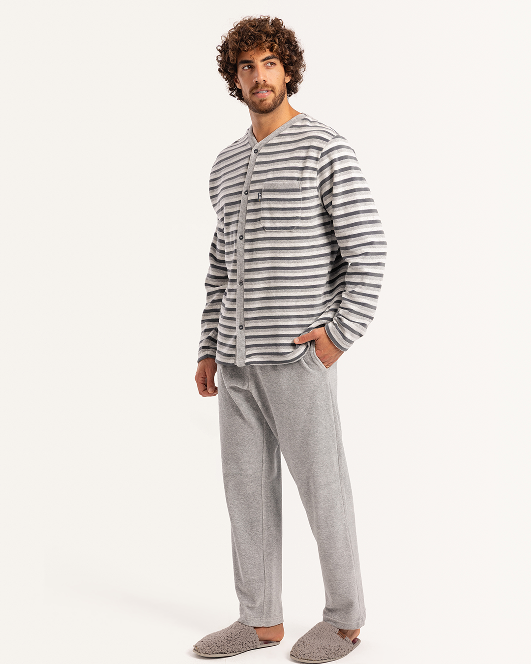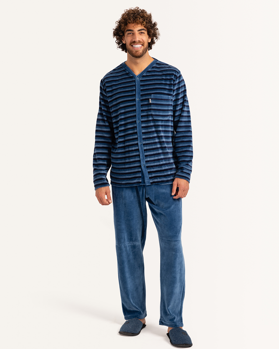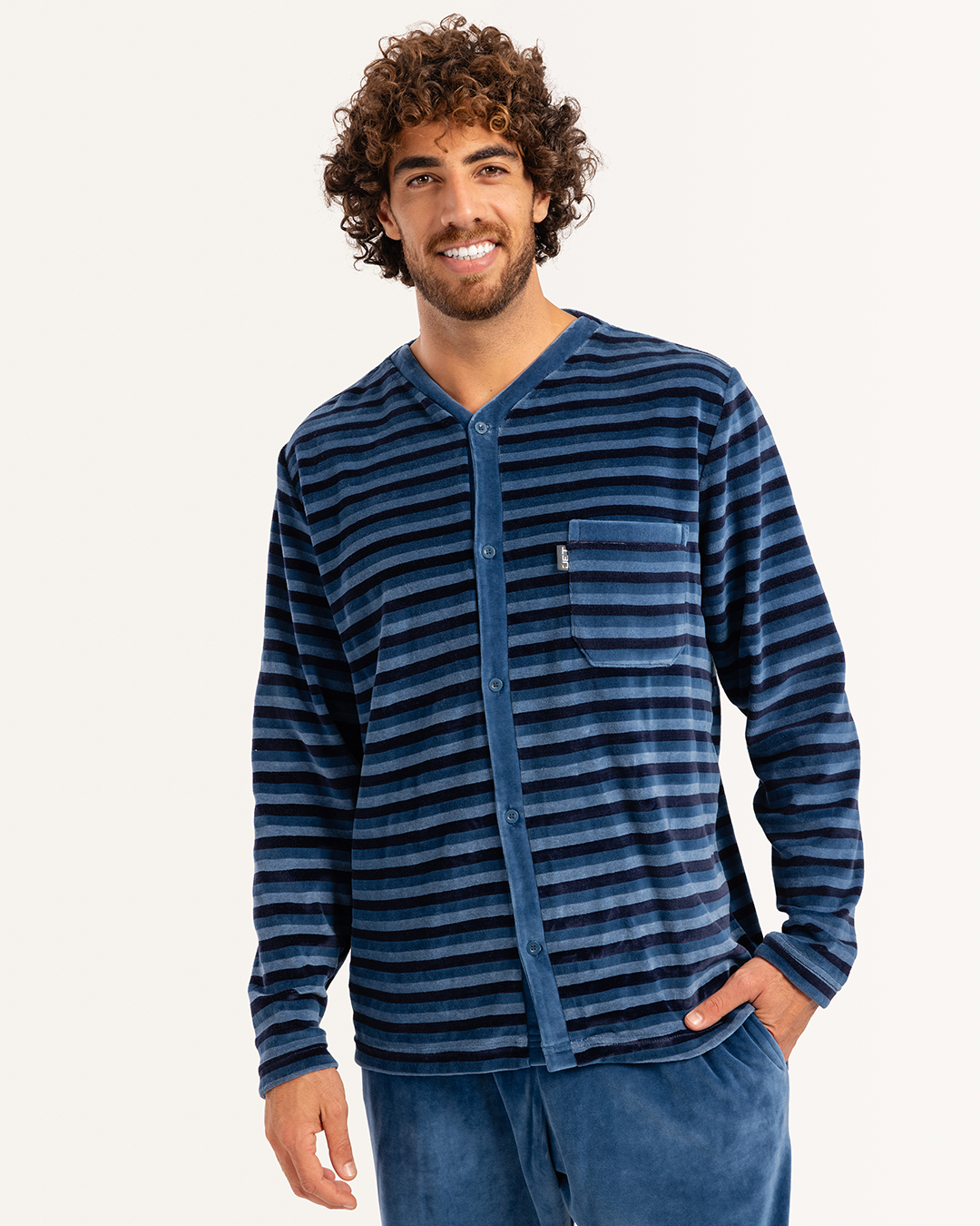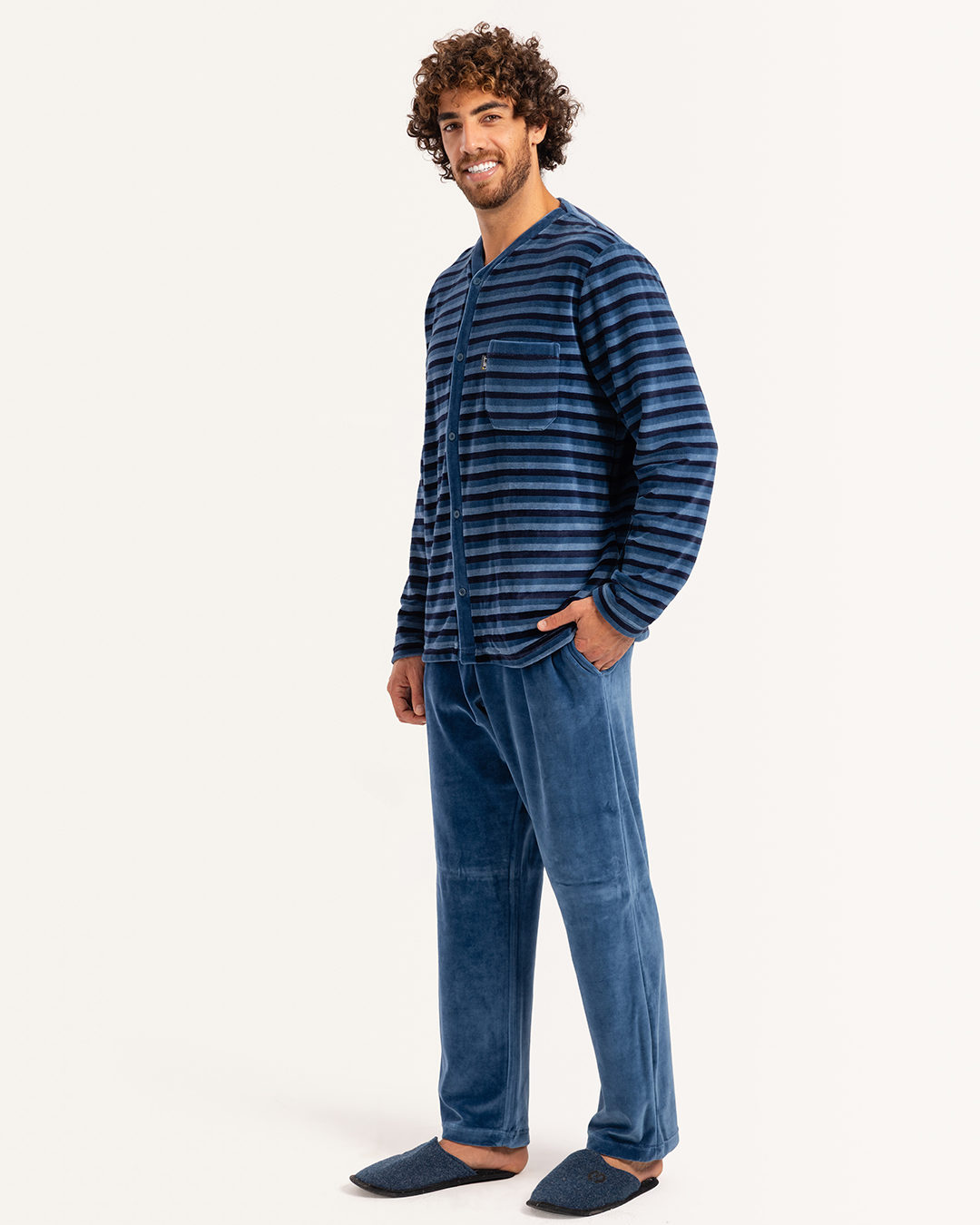بيجاما رجالى قطيفة سترايبر جاكيت بزراير رقبه V جيب على الصدر و بنطلون سادة