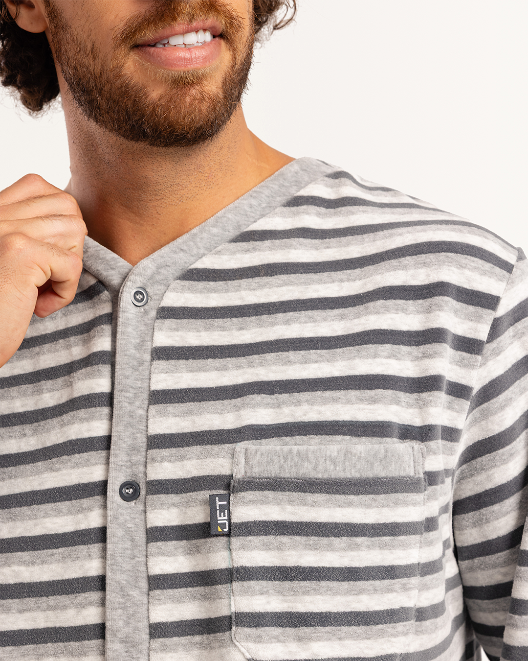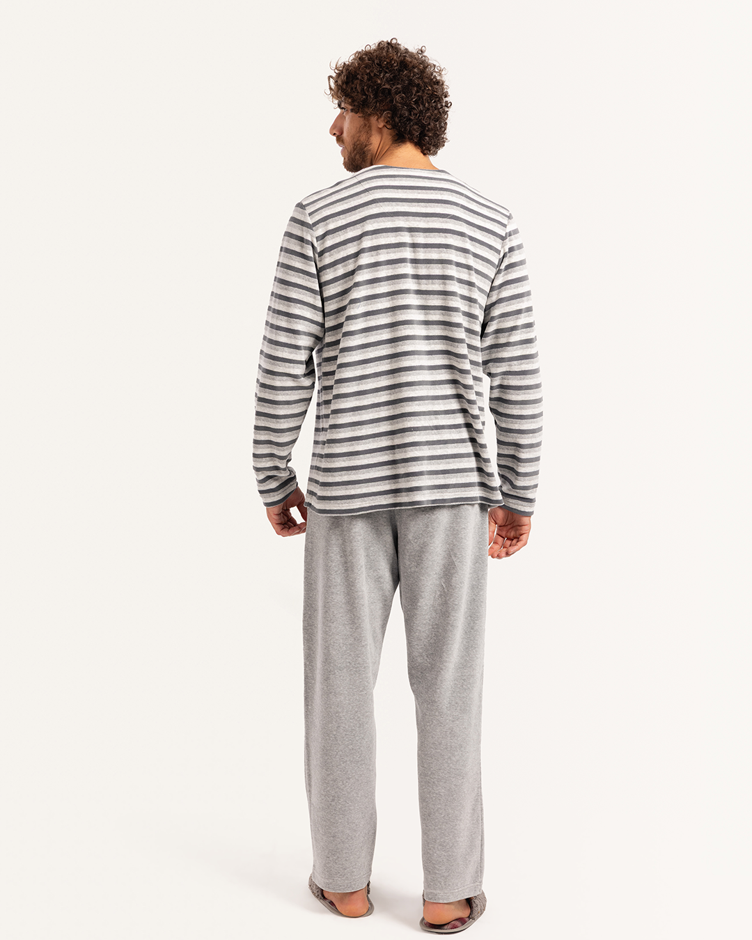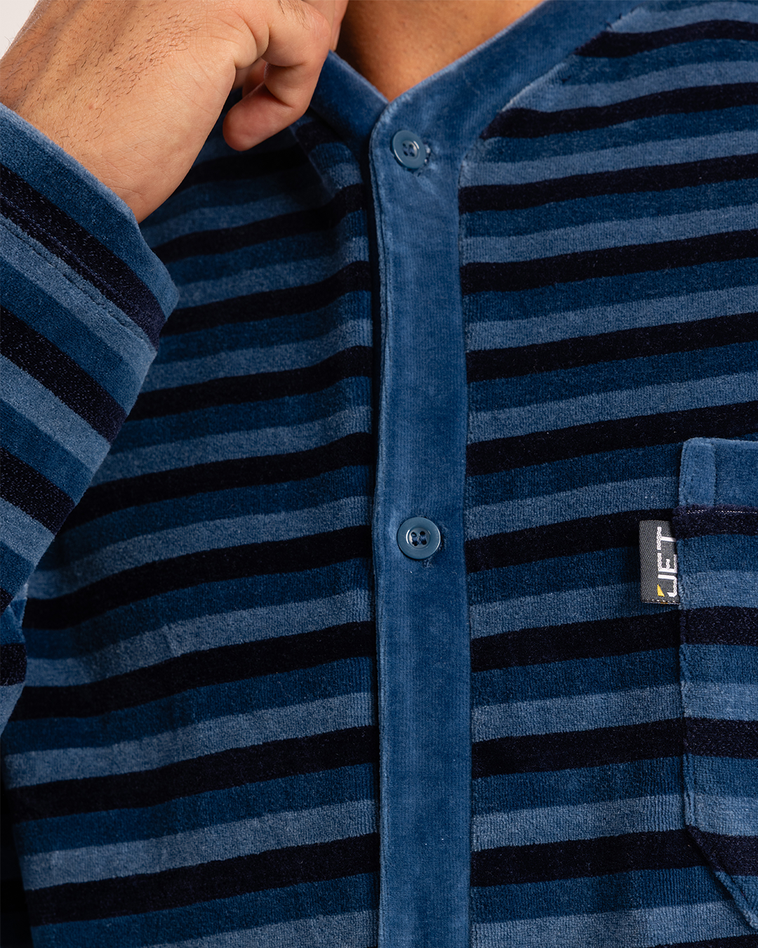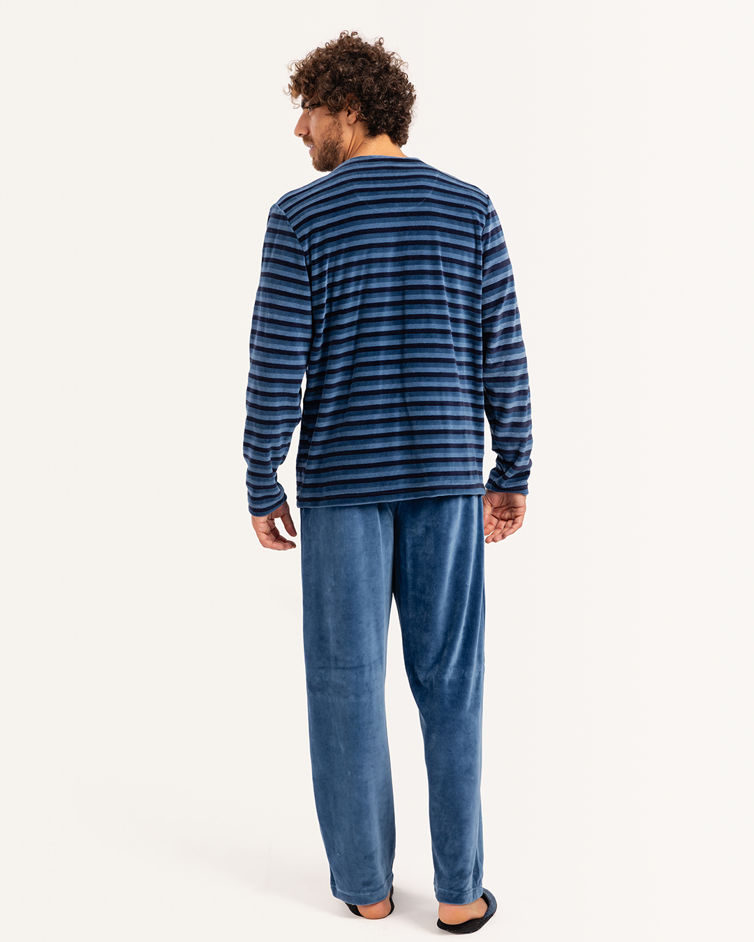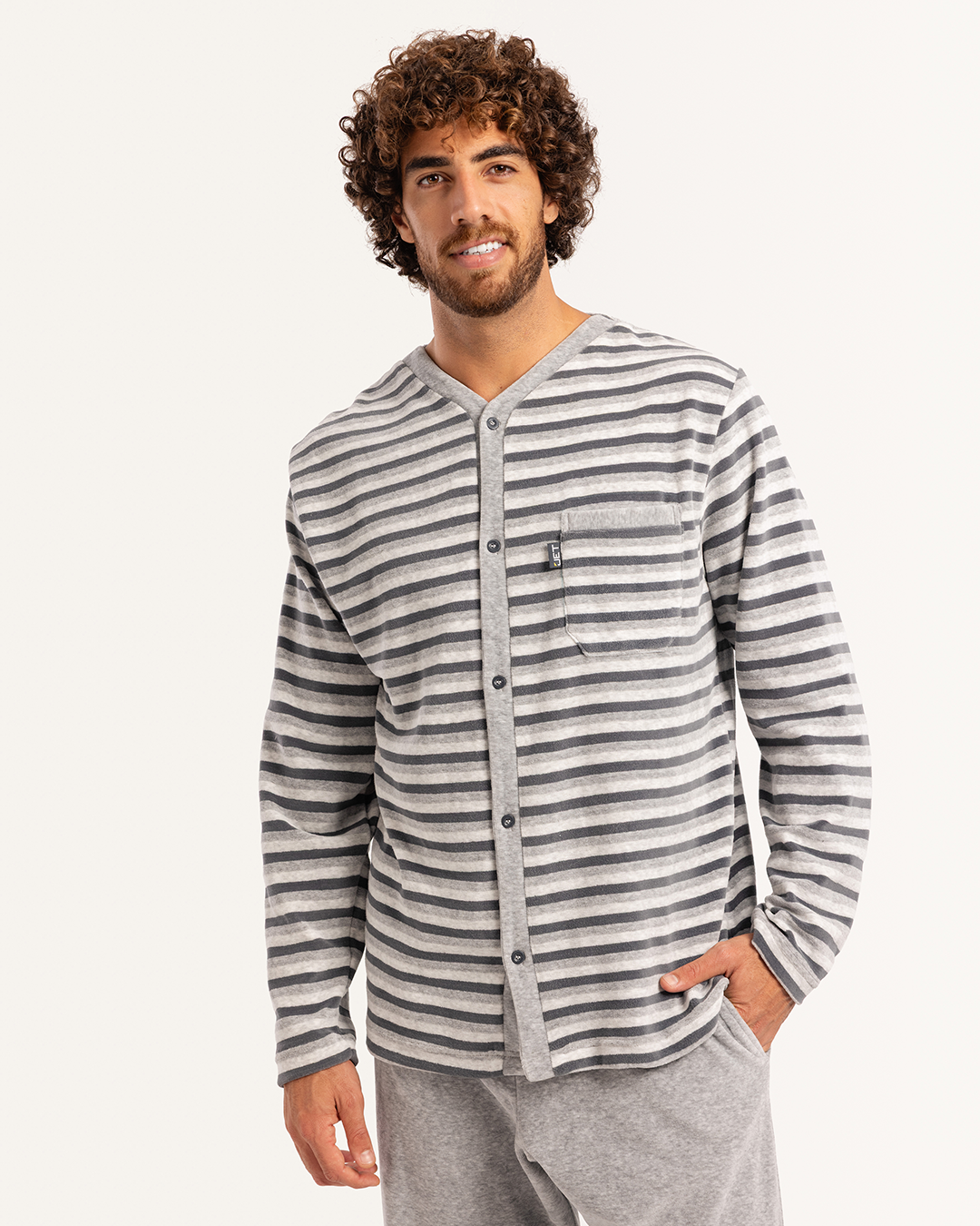 بيجاما رجالى قطيفة سترايبر جاكيت بزراير رقبه V جيب على الصدر و بنطلون سادة