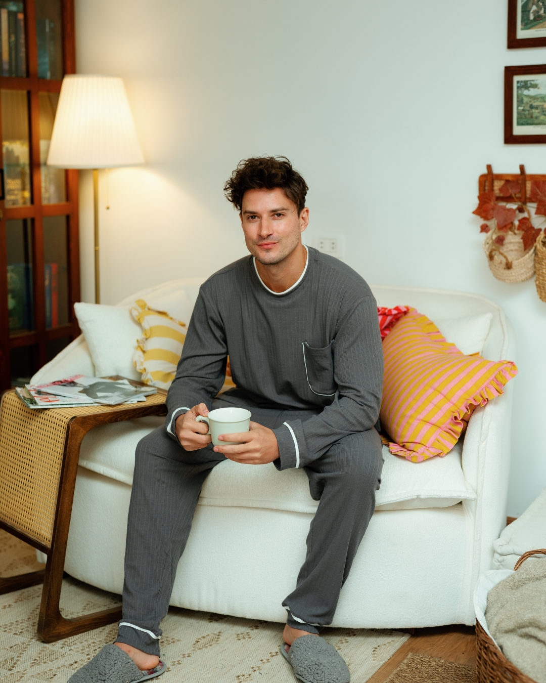 بيجاما رجالي بكم طويل و بنطلون مطبوع اشكال هندسيه
