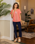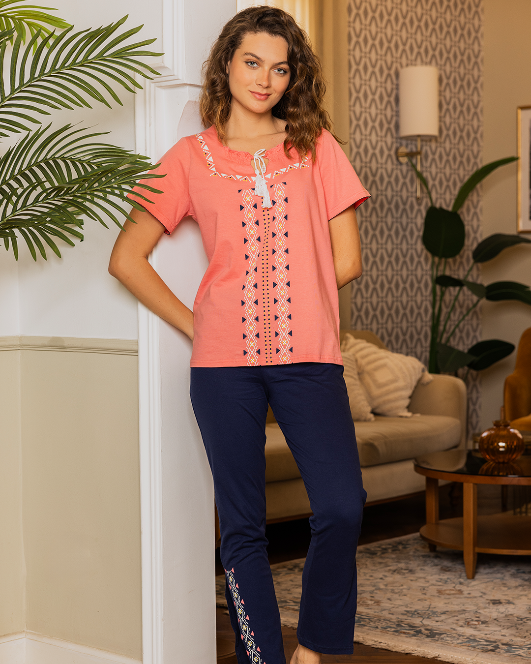 بيجامه حريمي بنطلون طويل مفتوح تيشرت نص كم طباعة ورد برباط علي الصدر اشكال هندسبه
