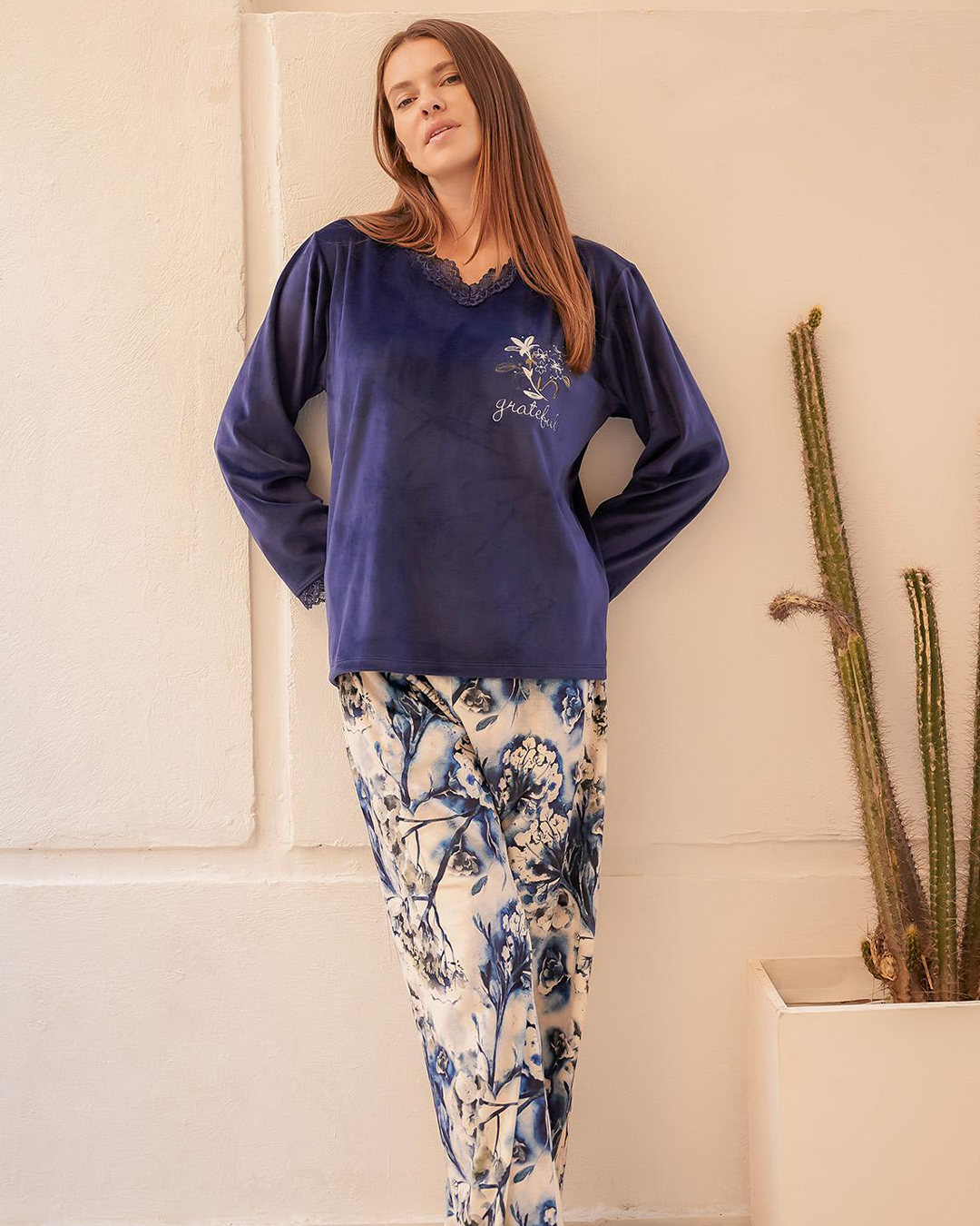 بيجامه حريمي سبعه دانتيل تطريزه ورد صغير بنطلون ورده كحلي