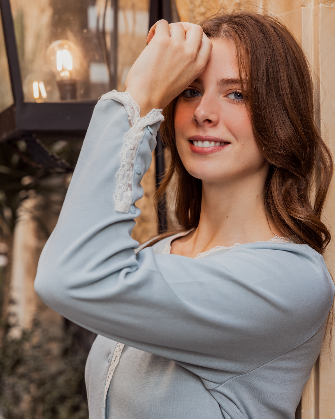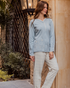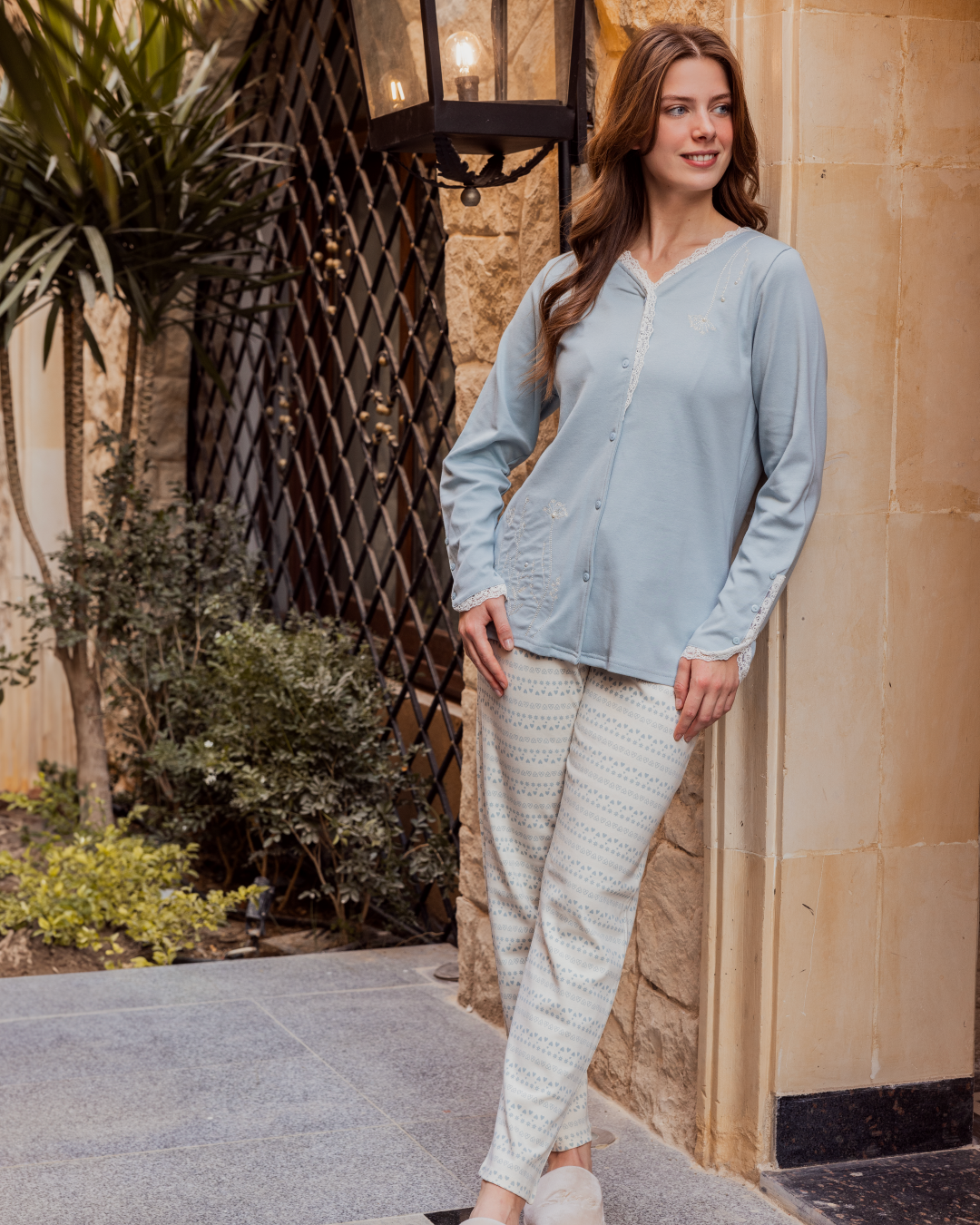 بيجامه حريمي فتح ازرار كم طويل بنطلون طويل دانتيلتطريز ورد