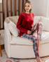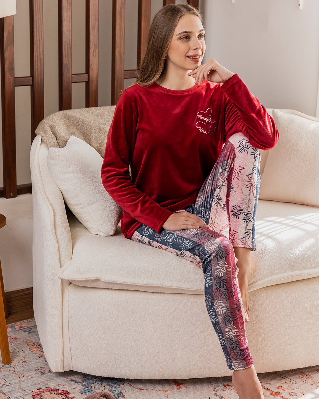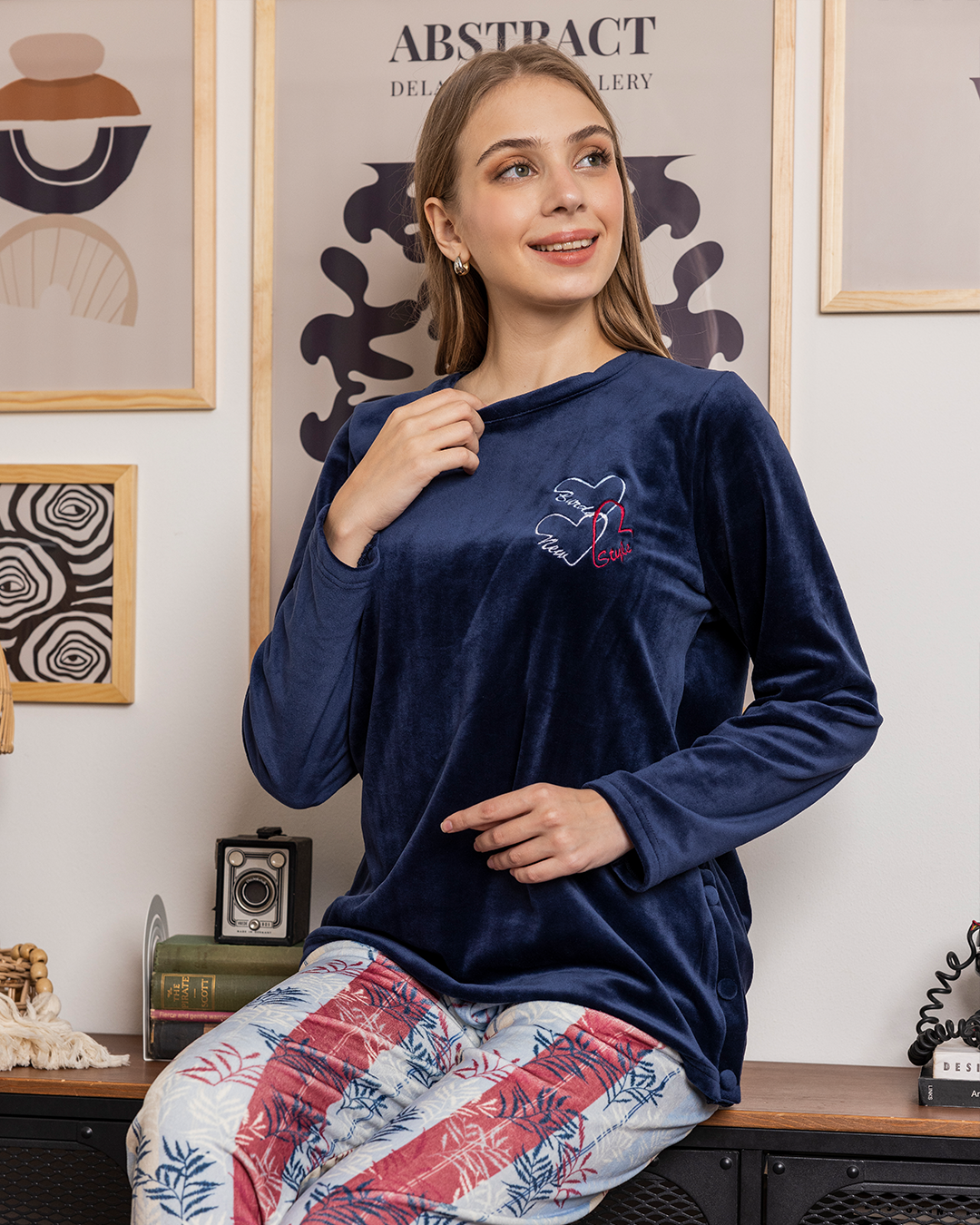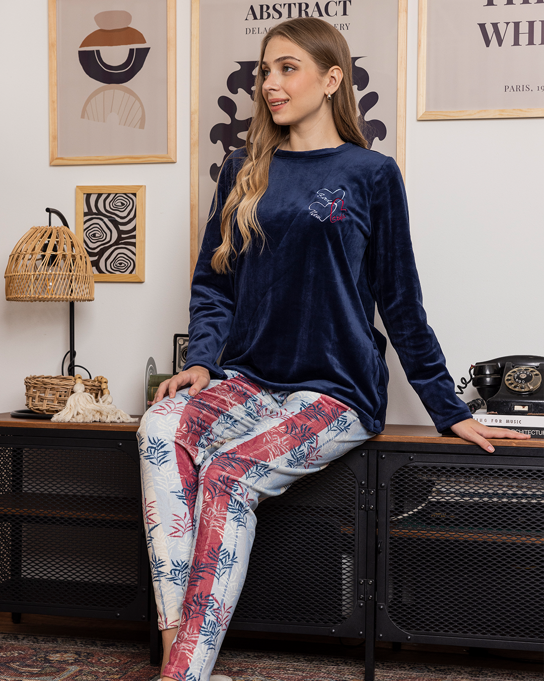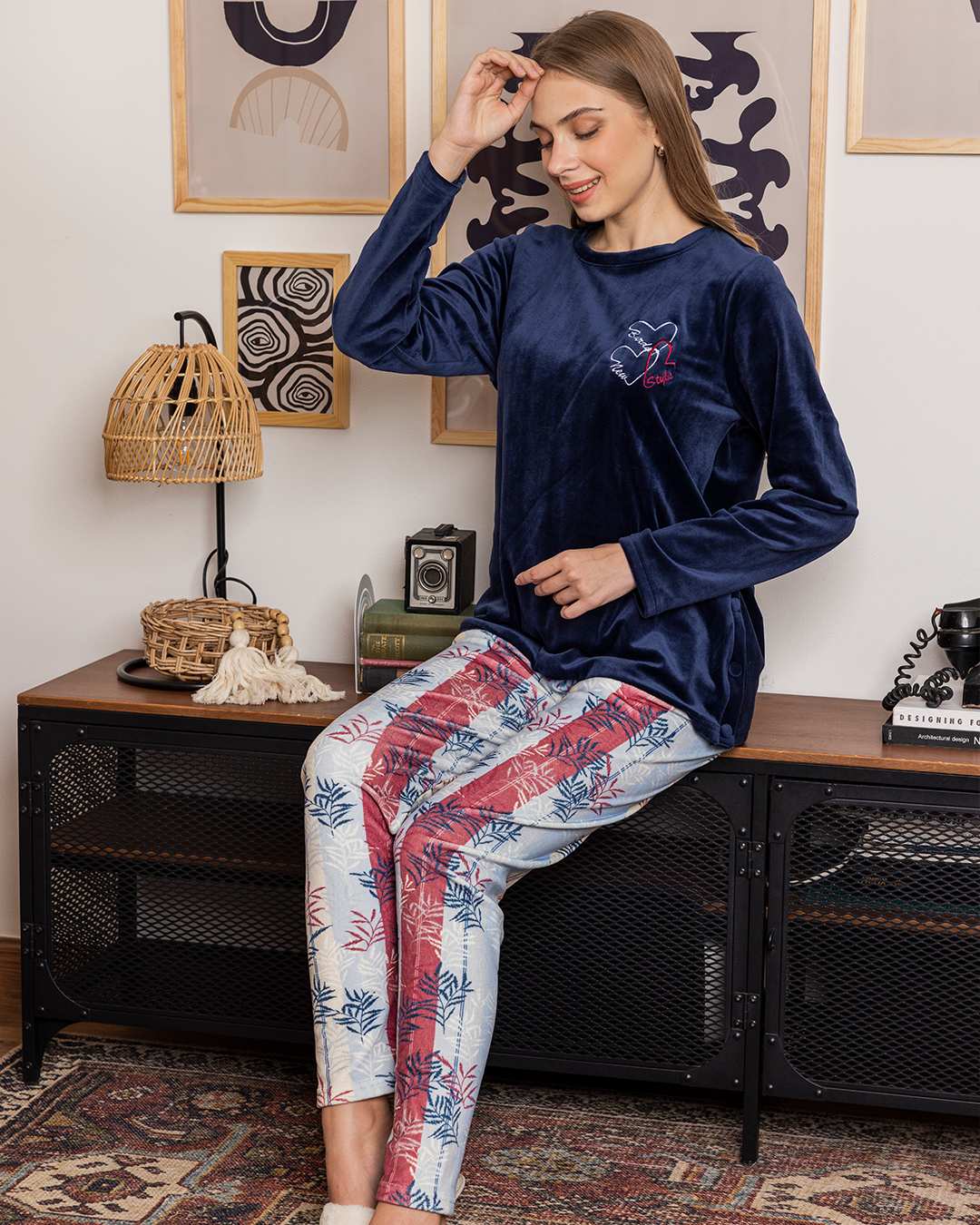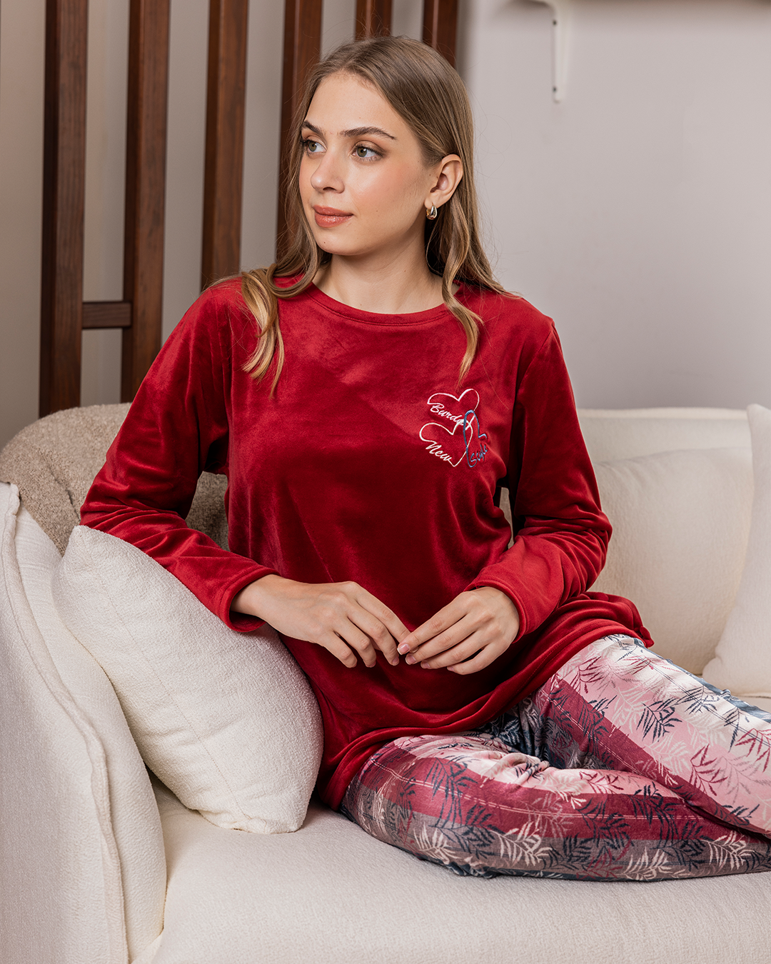بيجامه حريمي قطيفة كنزة سادة تطريز قلوب