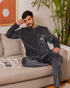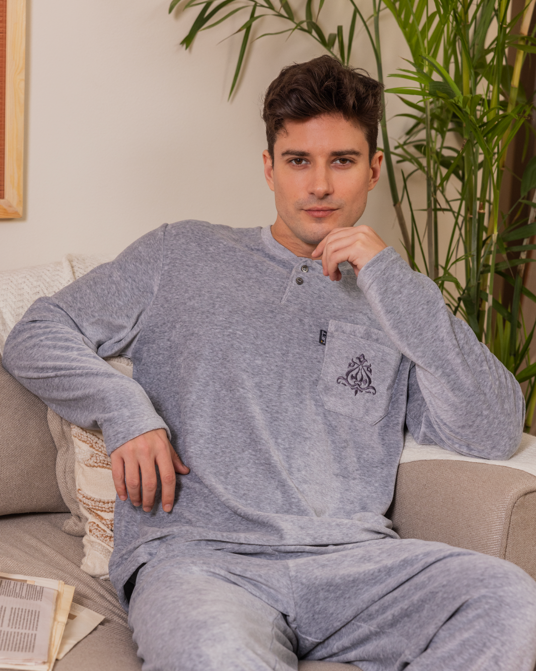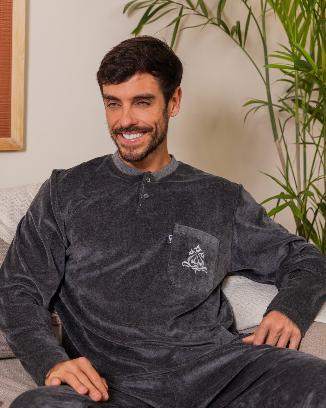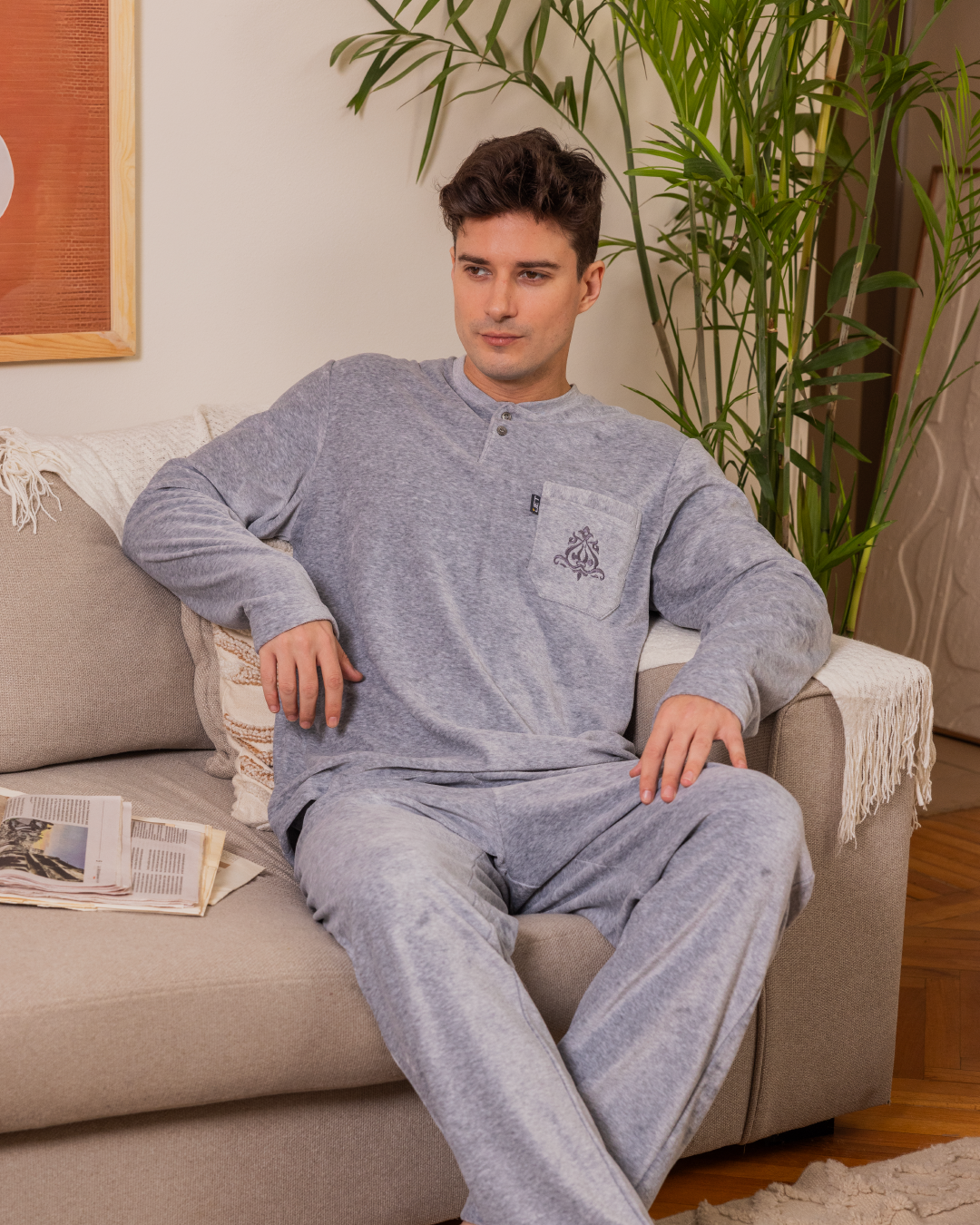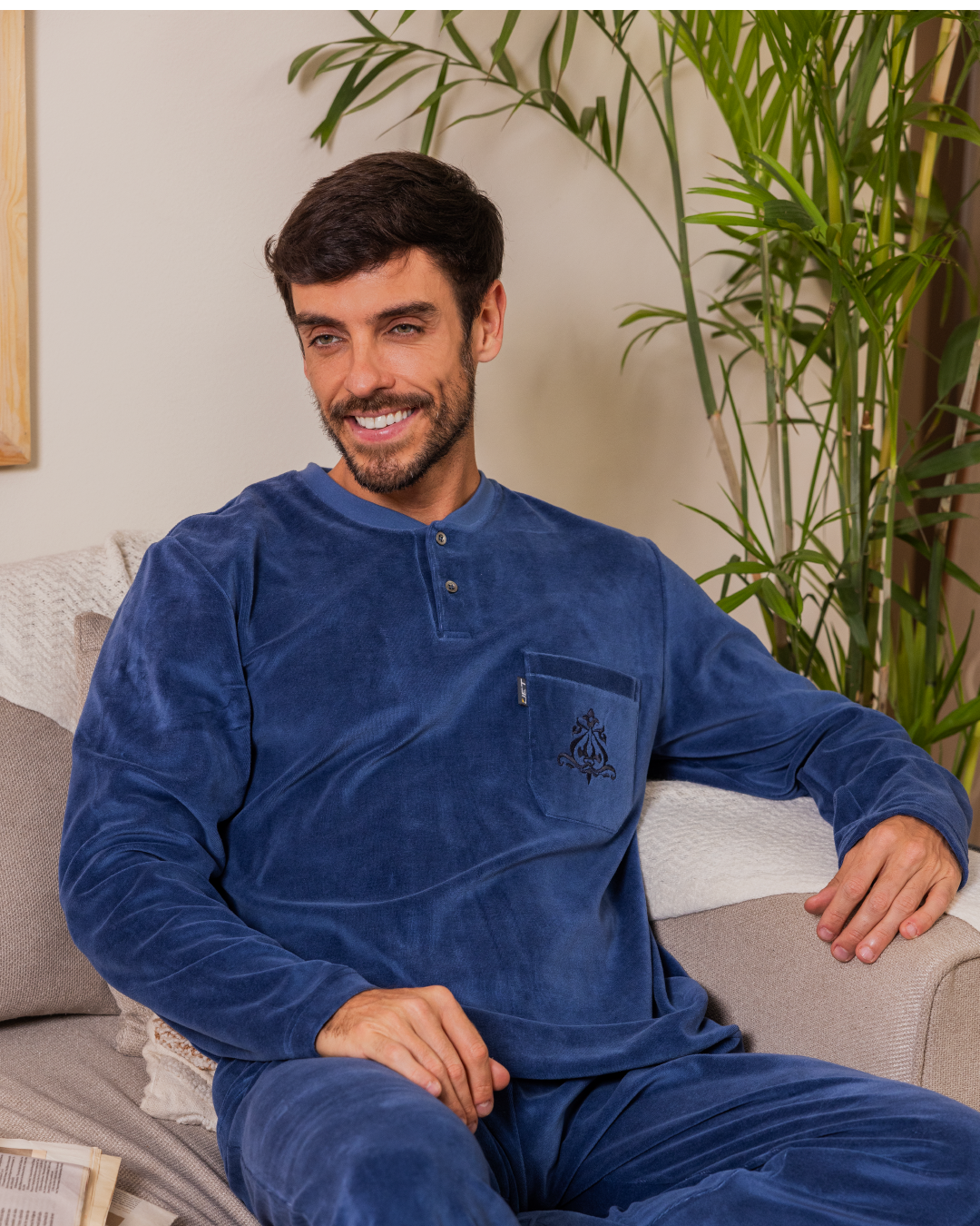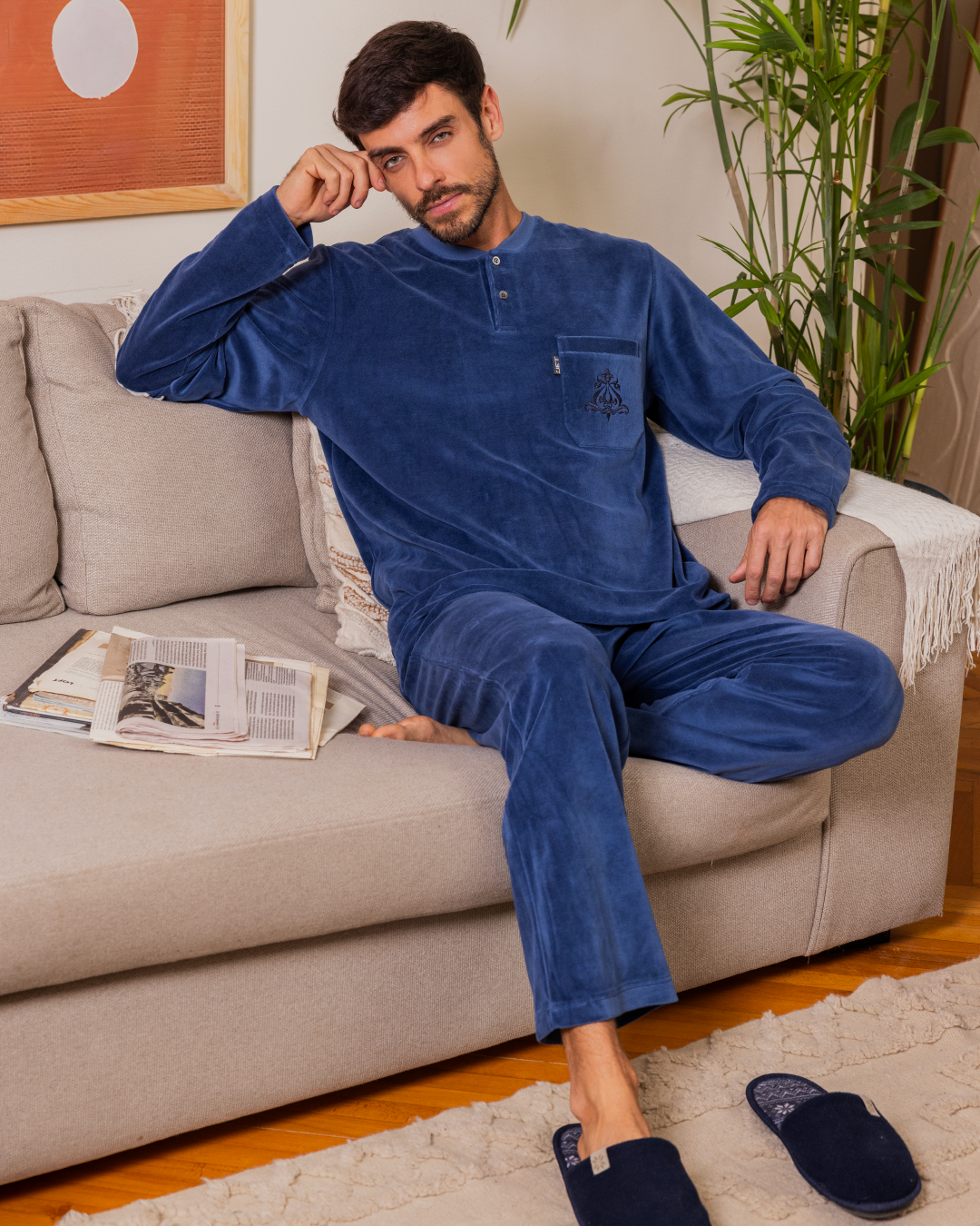 بيجامه رجالي تيشرت سادة بكم طويل قطيفة راجلان برقبة رواند وجيب علي الصدر مطرز وبنطلون ساده