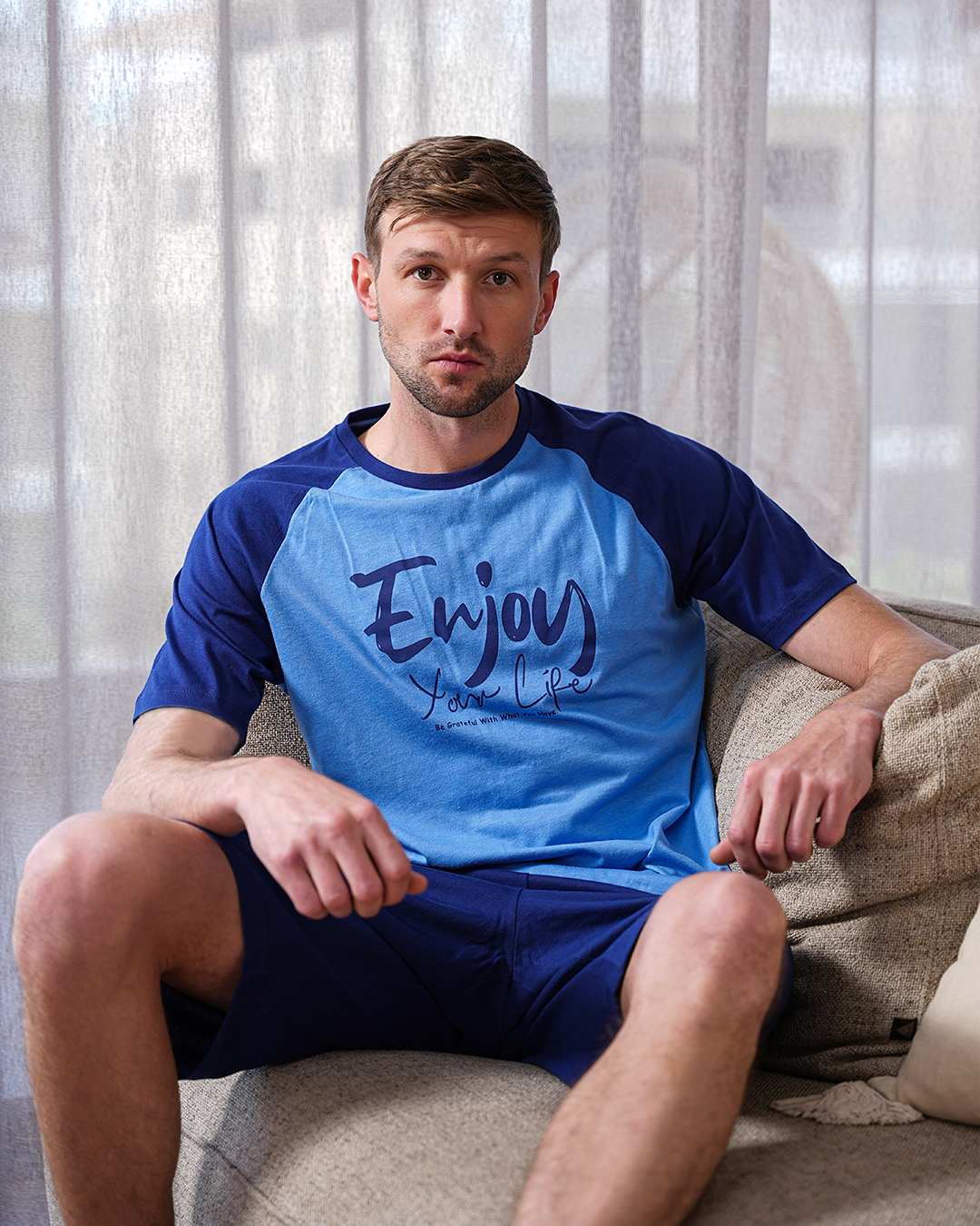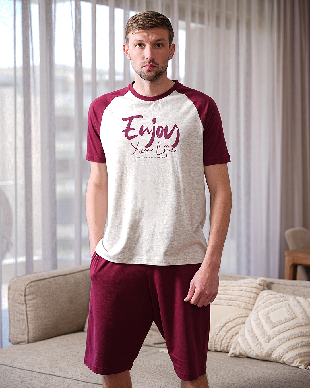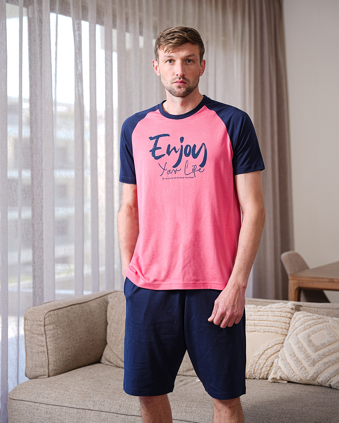 بيجامه رجالي سادة تيشرت طابعة علي الصدر نص كم وشورت