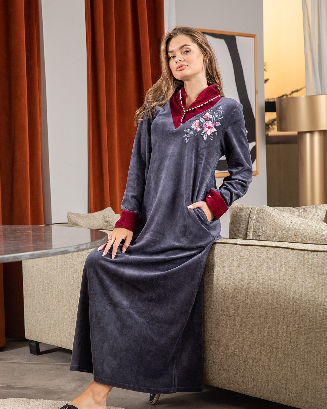 قميص حريمي قطيفة كول شال مطرز ورد