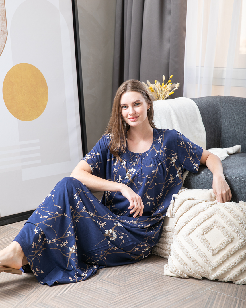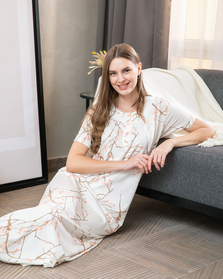 قميص نوم حريمي طويل زراير مع كشكه عالصدر اوراق الشجر