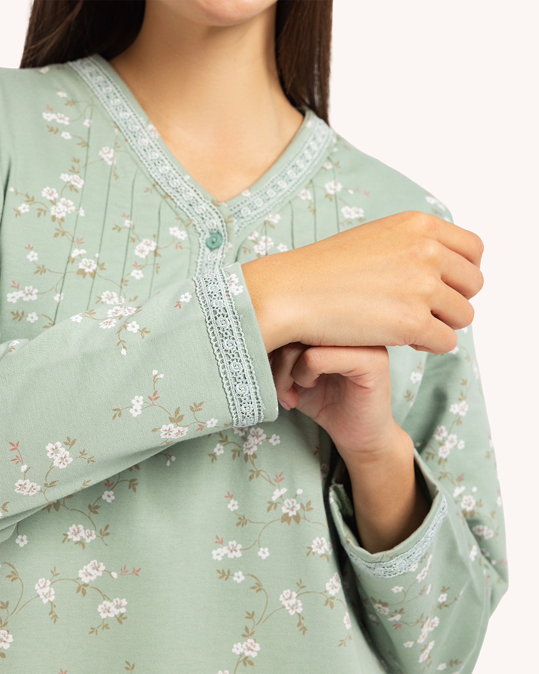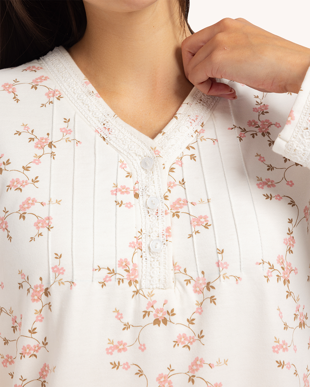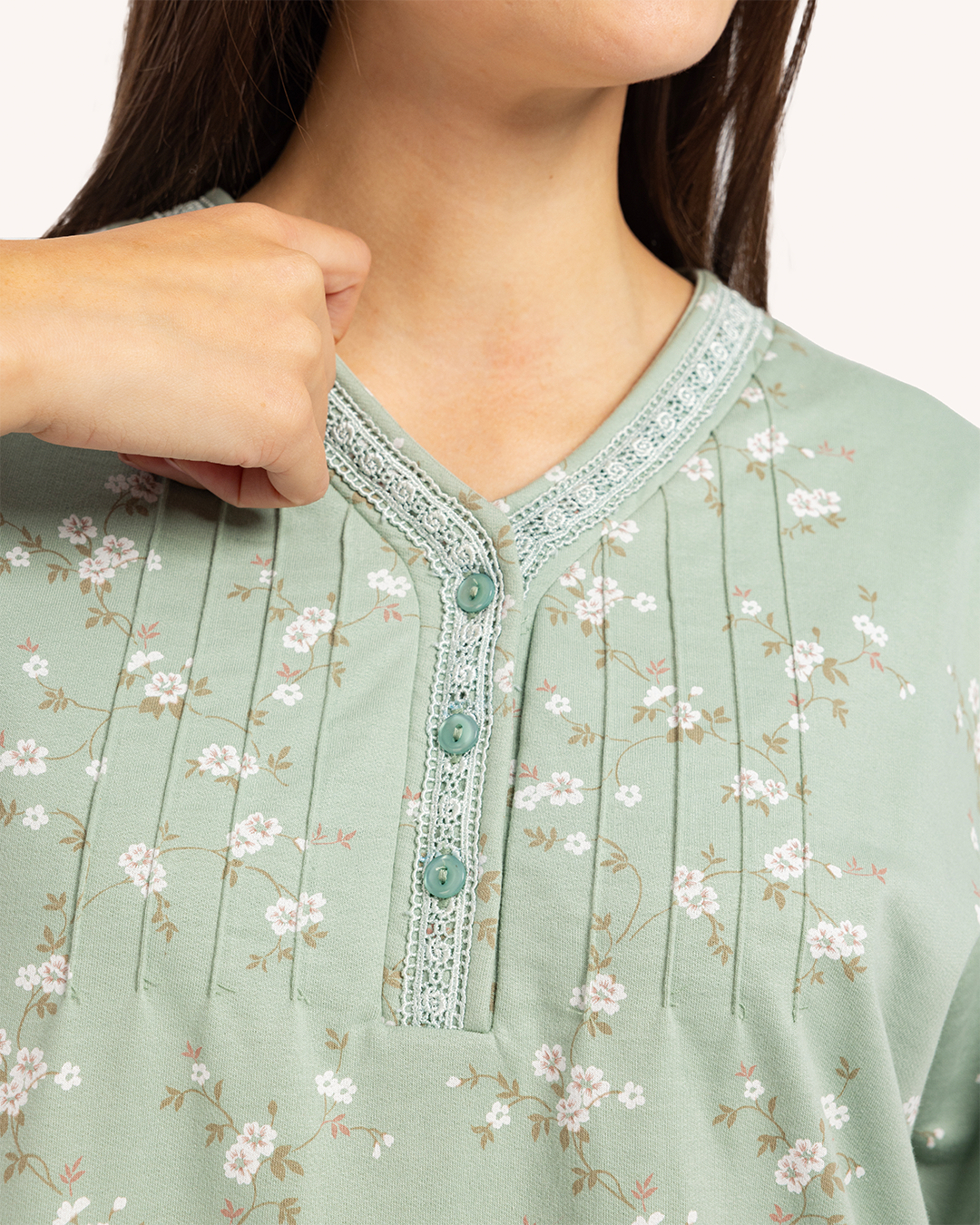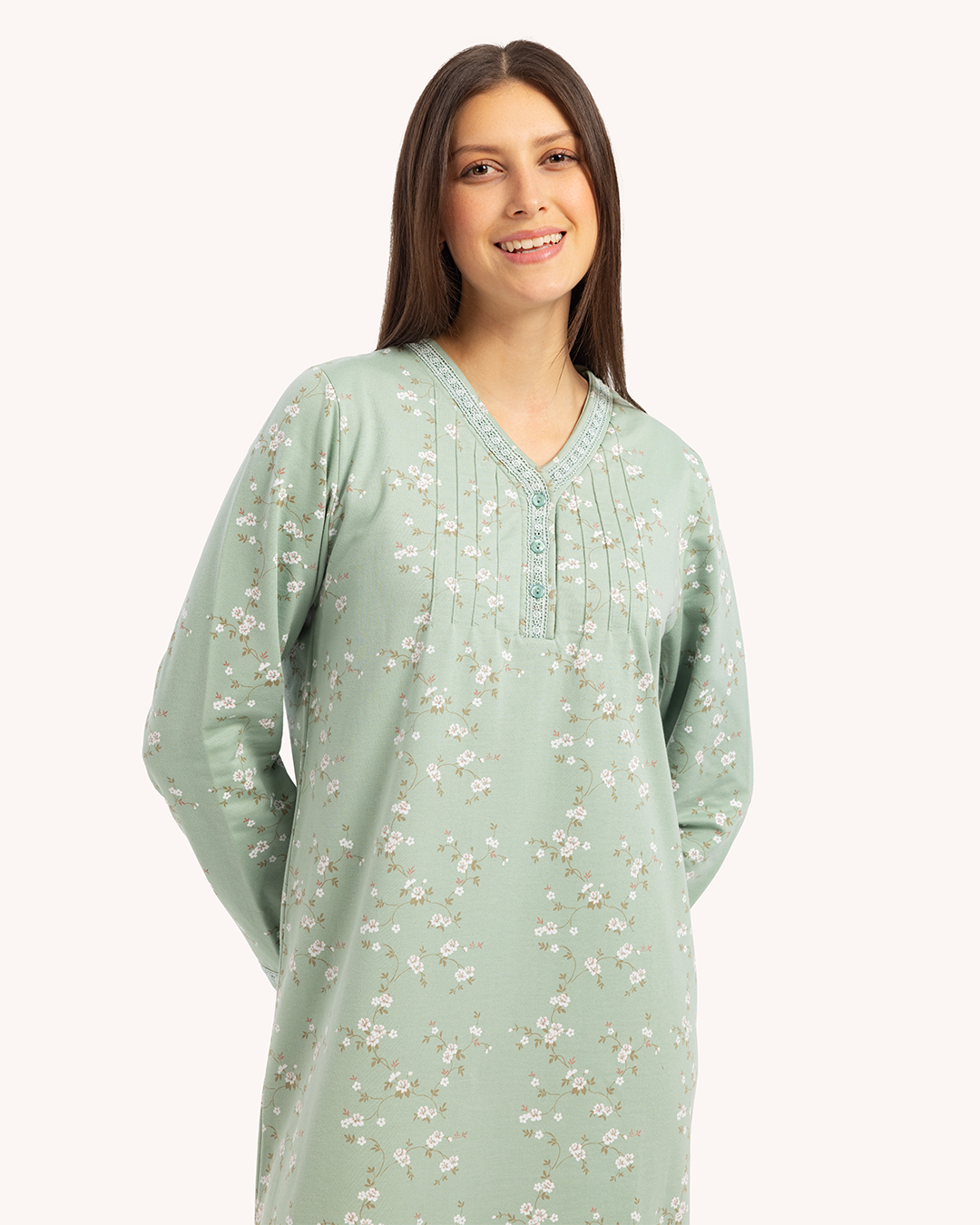 قميص نوم حريمي مطبوع بكم طويل برقبة V ومرد بزراير و دانتيل