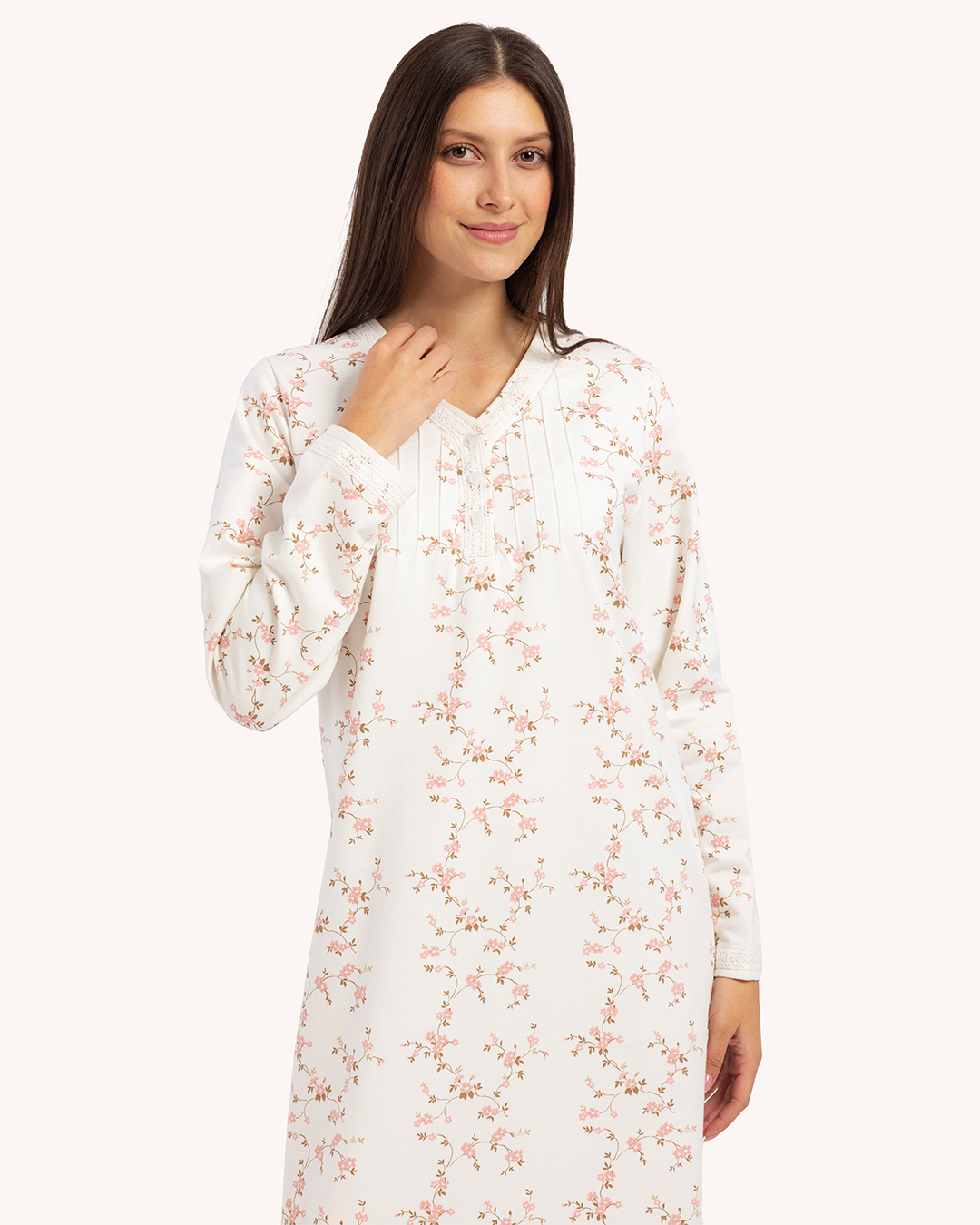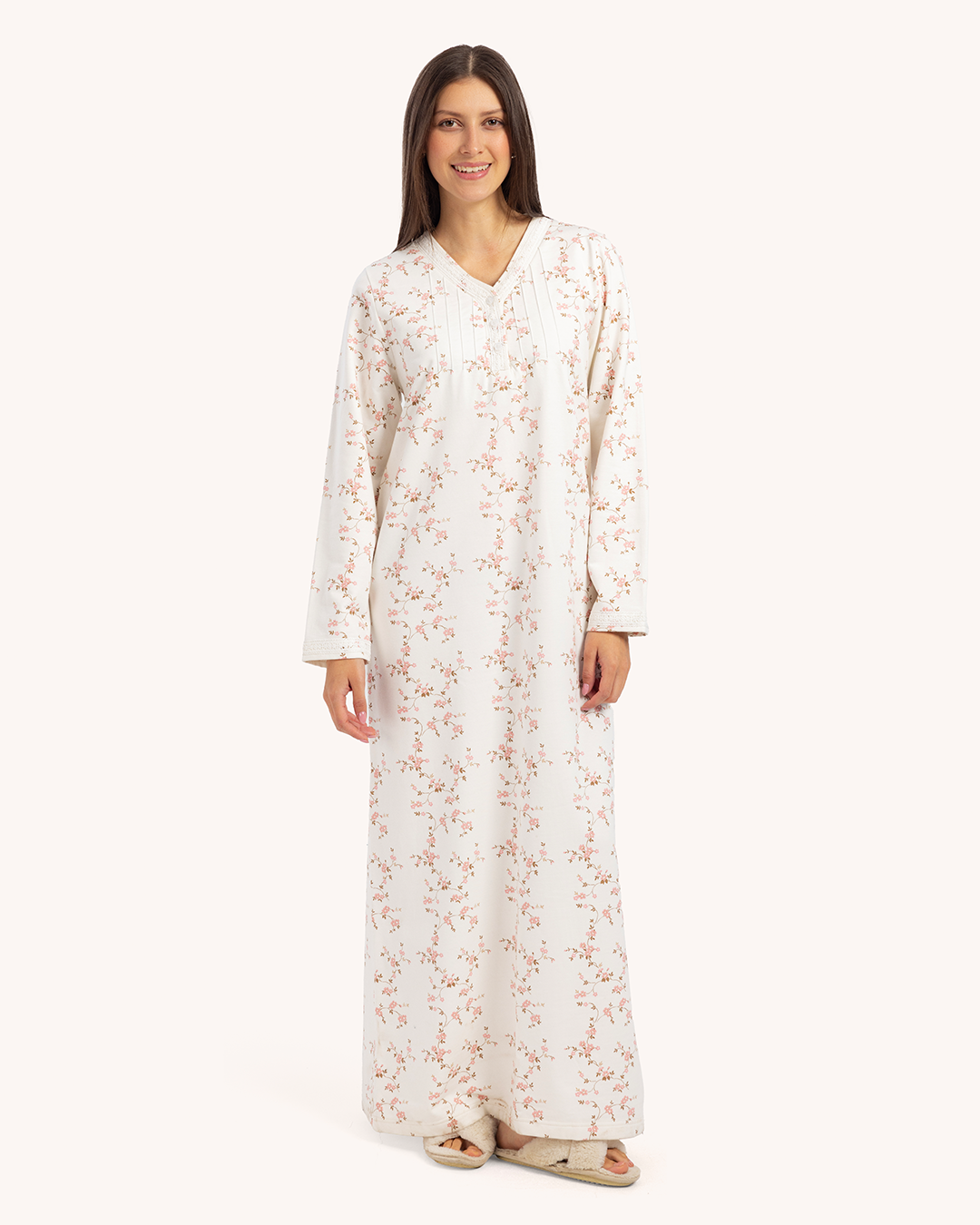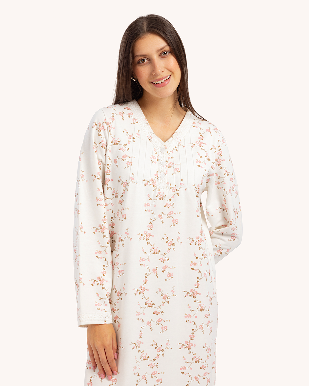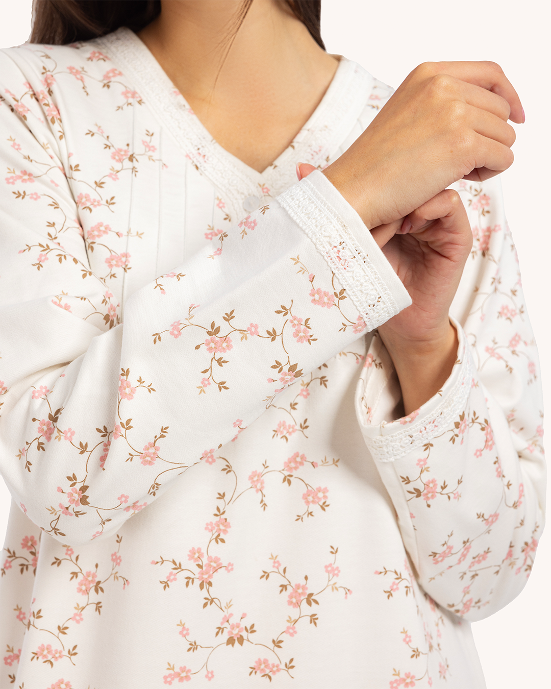 قميص نوم حريمي مطبوع بكم طويل برقبة V ومرد بزراير و دانتيل
