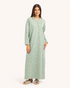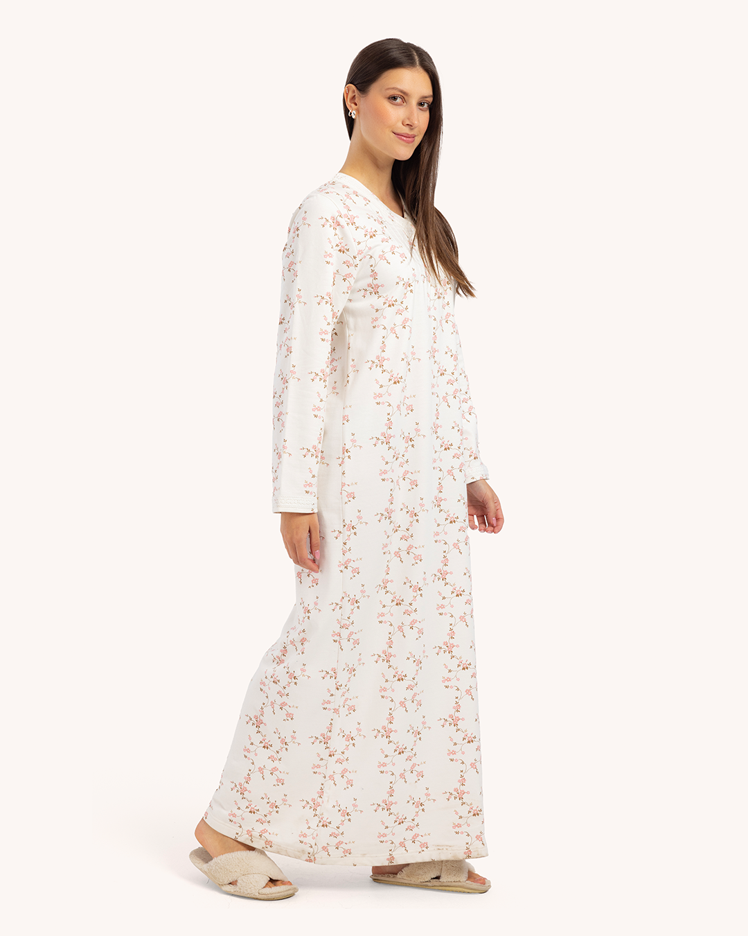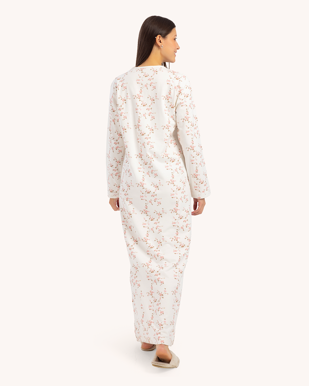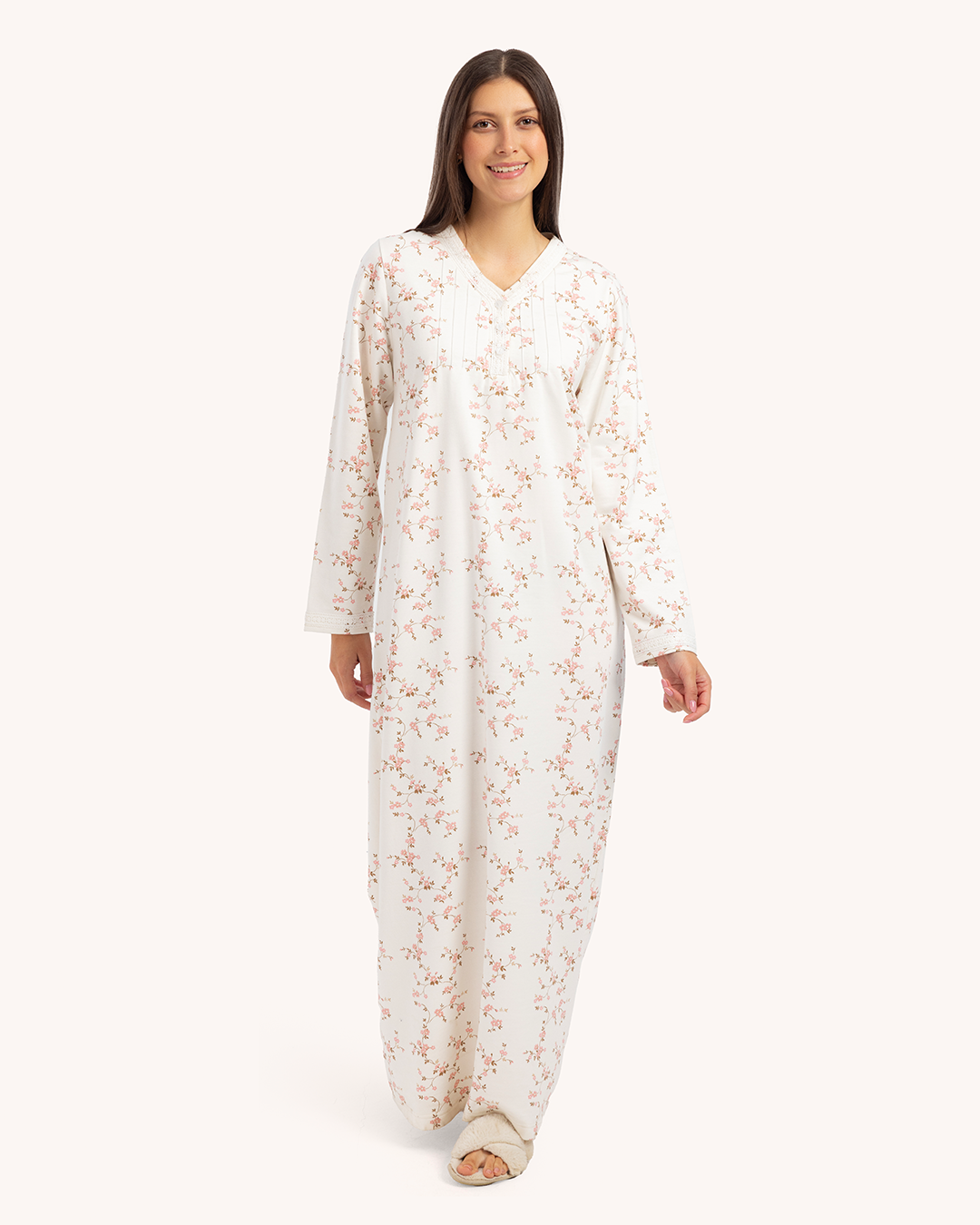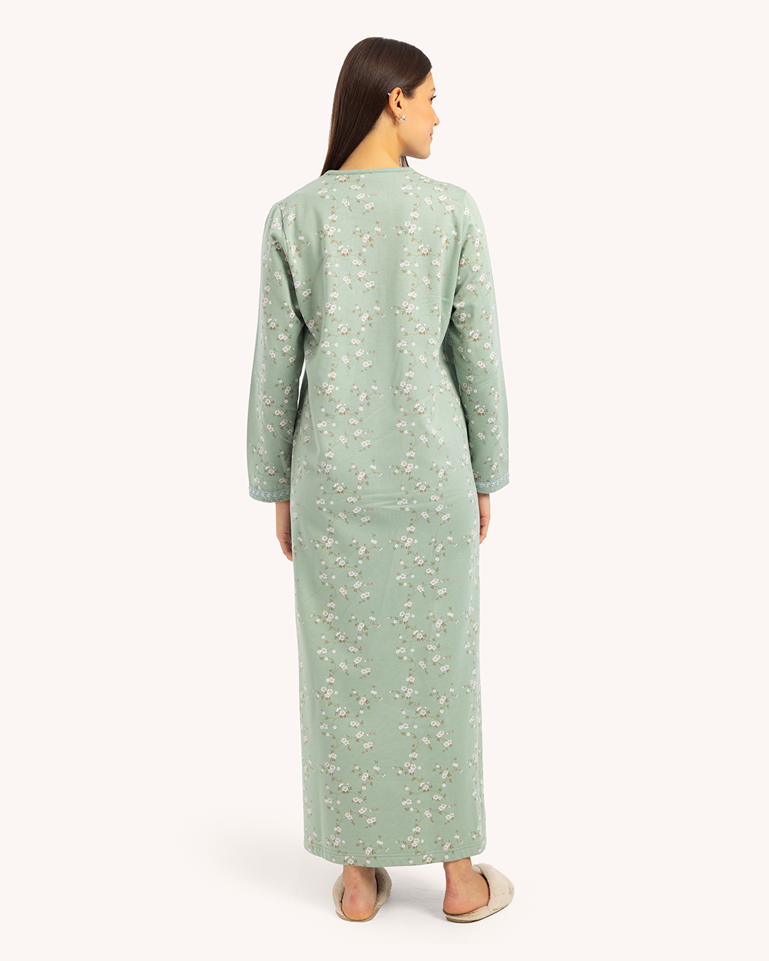 قميص نوم حريمي مطبوع بكم طويل برقبة V ومرد بزراير و دانتيل