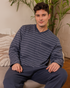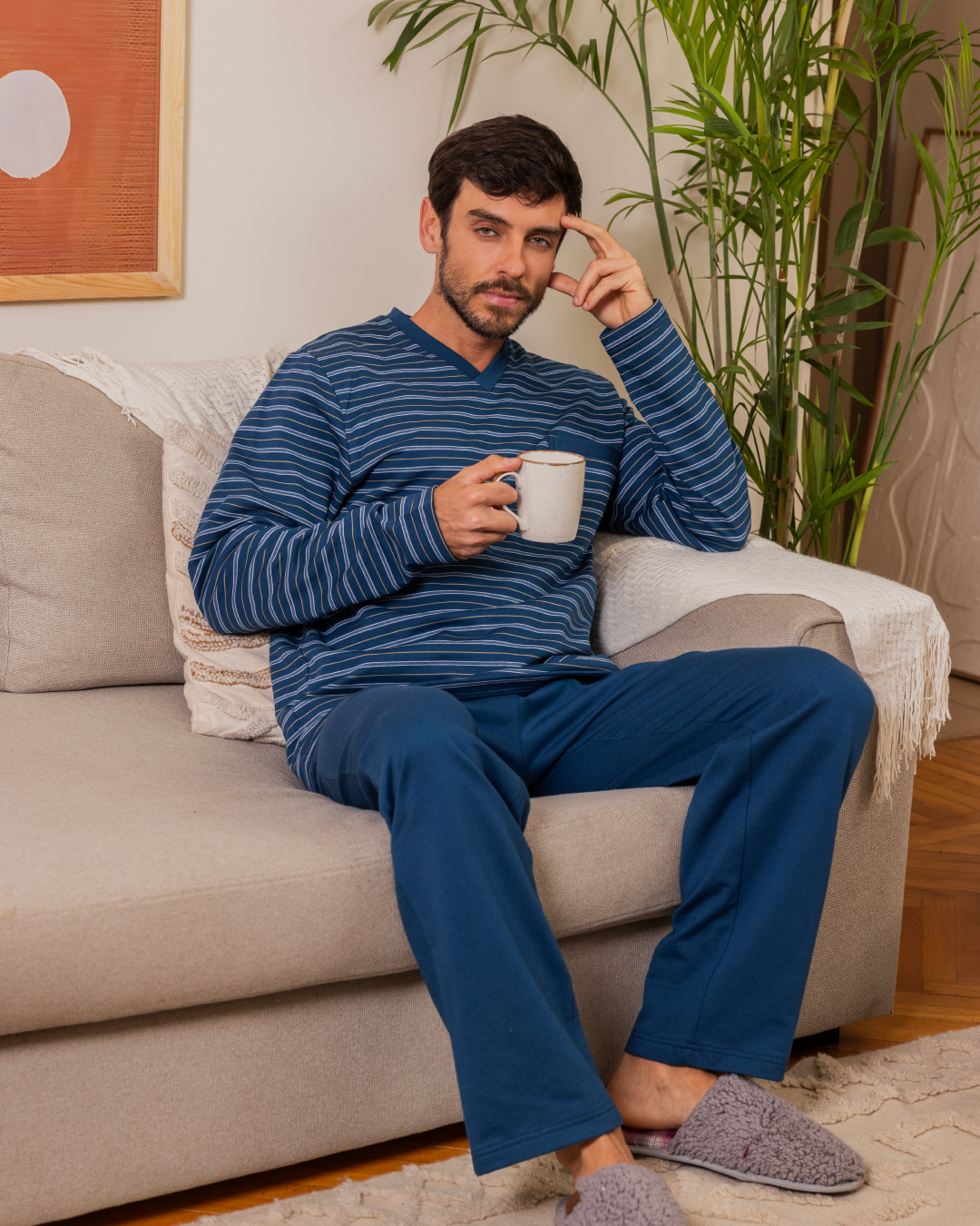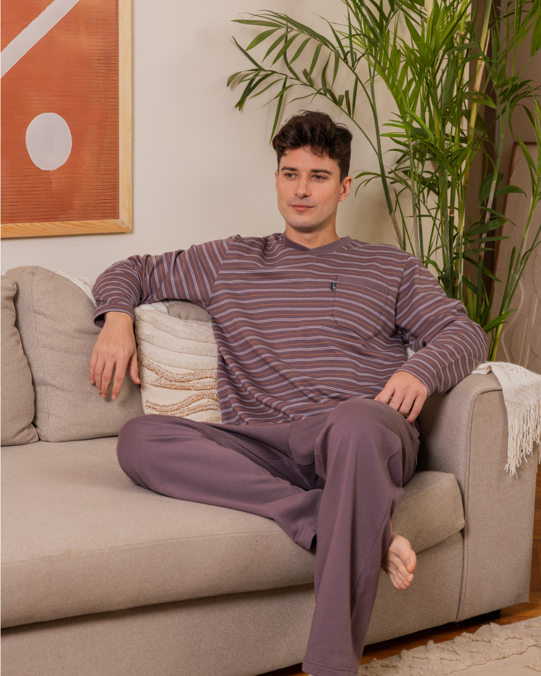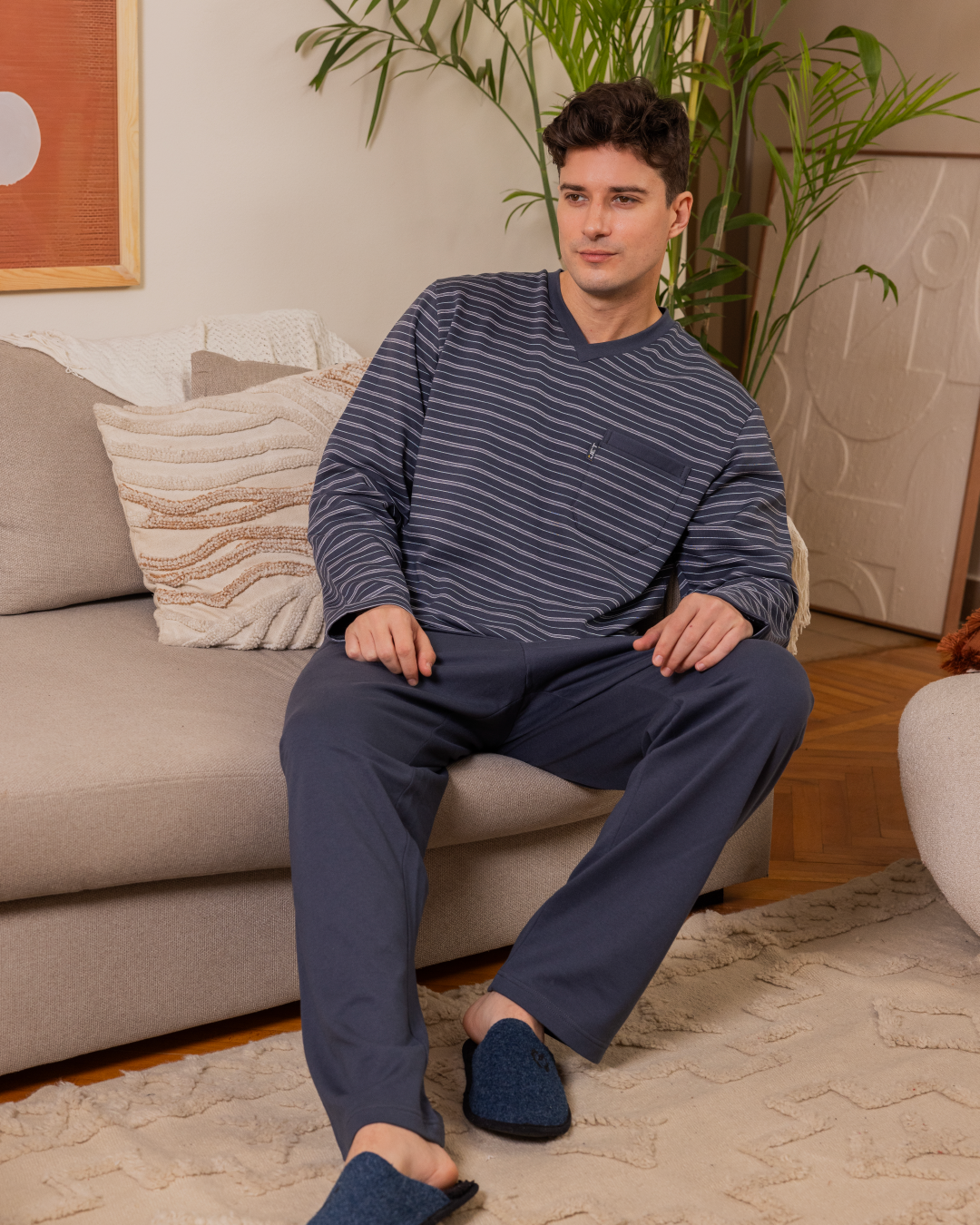 مرد بزراير وجيب علي الصدر وبنطلون ساده V بيجامه رجالي سترايبر تيشرت بكم مقلم برقبة