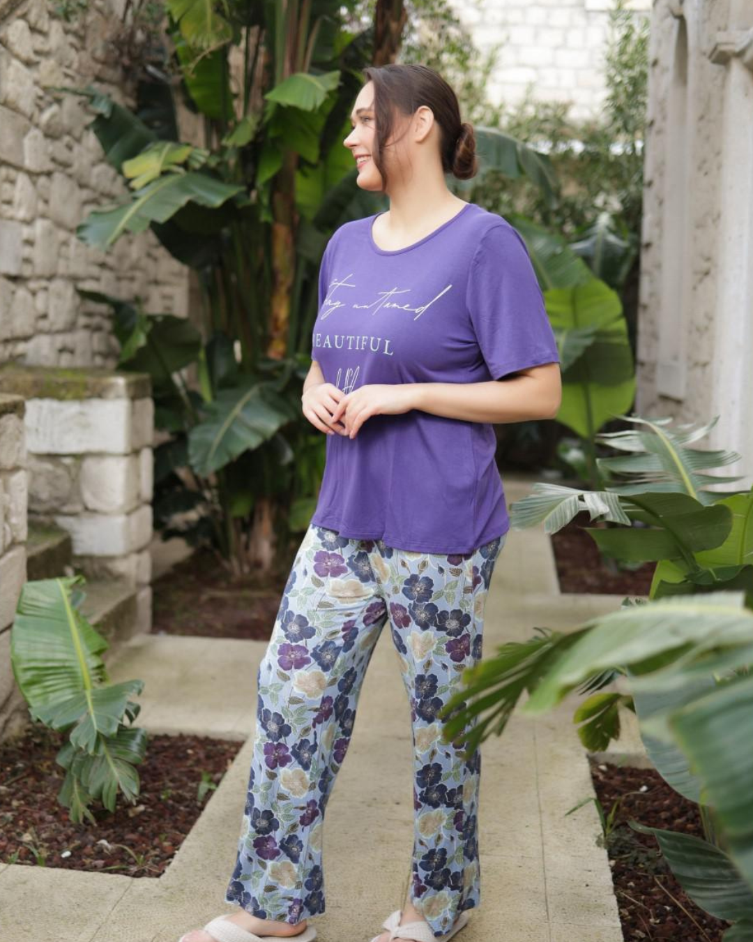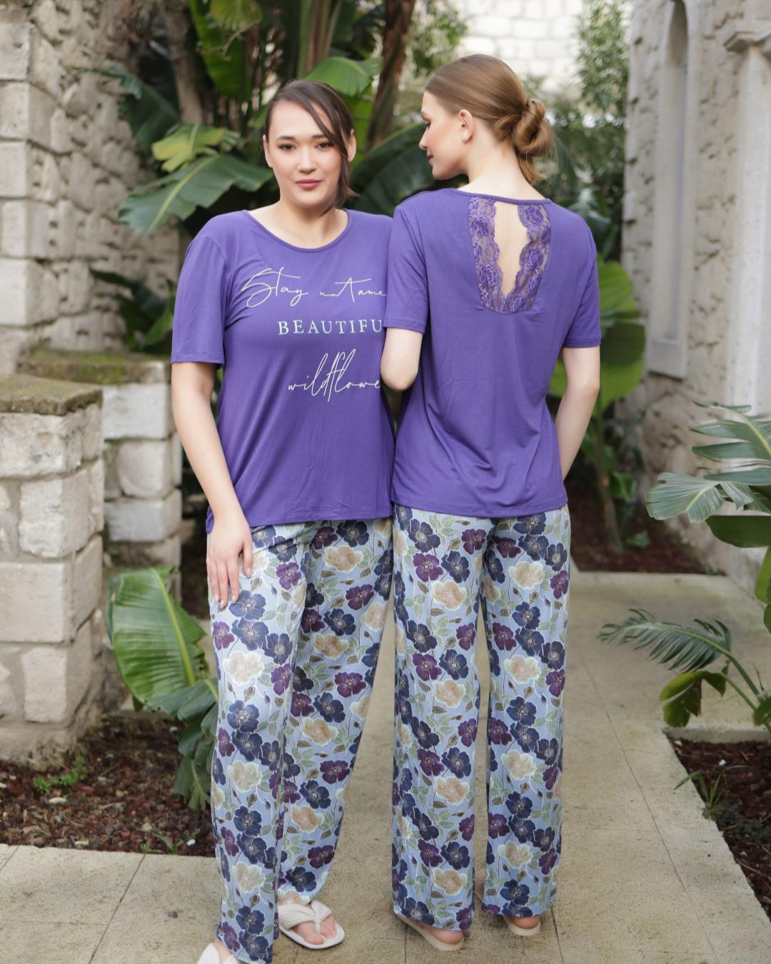 BEAUTIFUL بيجامه حريمي تيشرت نص كم ضهر دانتيل وبنطلون مشجر ورد