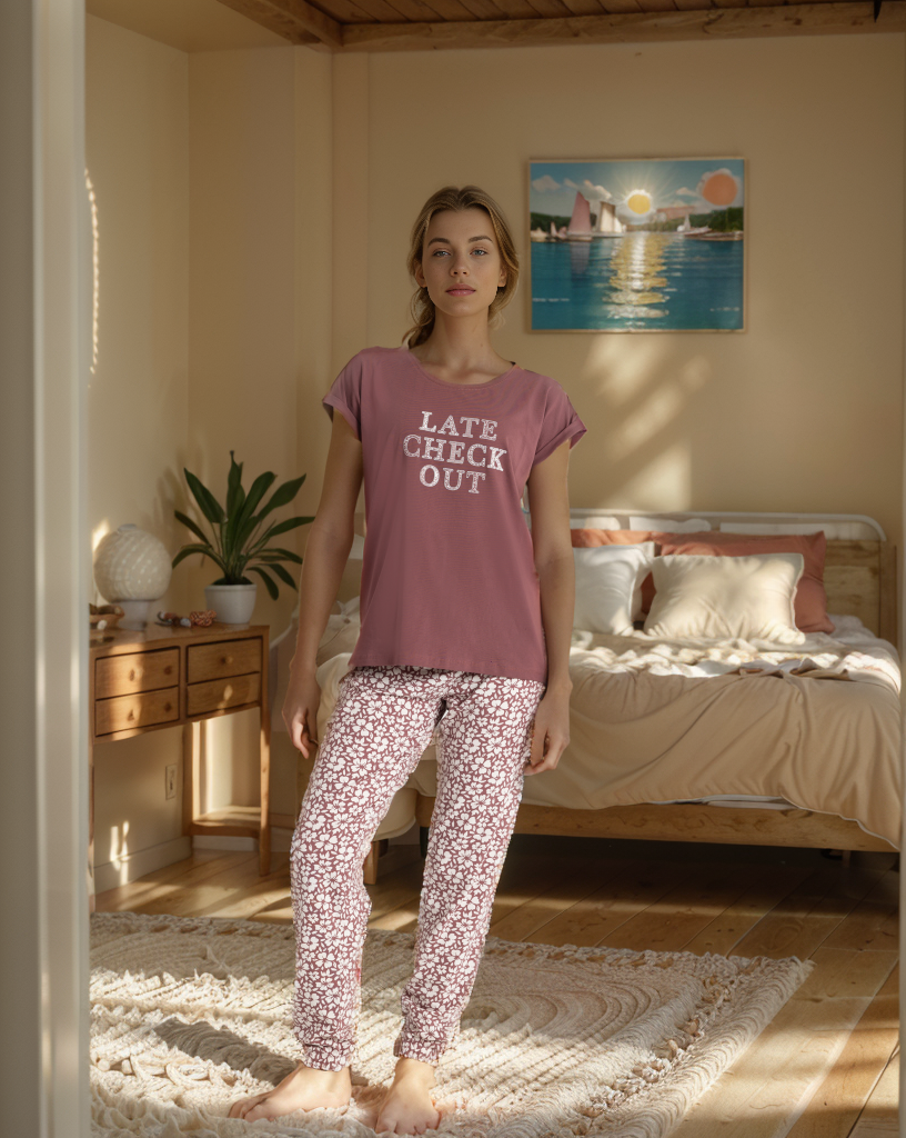LATE CHECK OUT بيجامه حريمي تيشرت نص كم وبنطلون مشجر