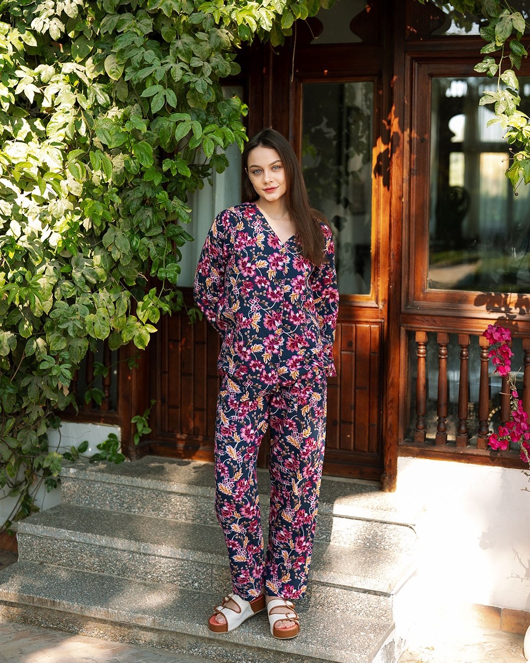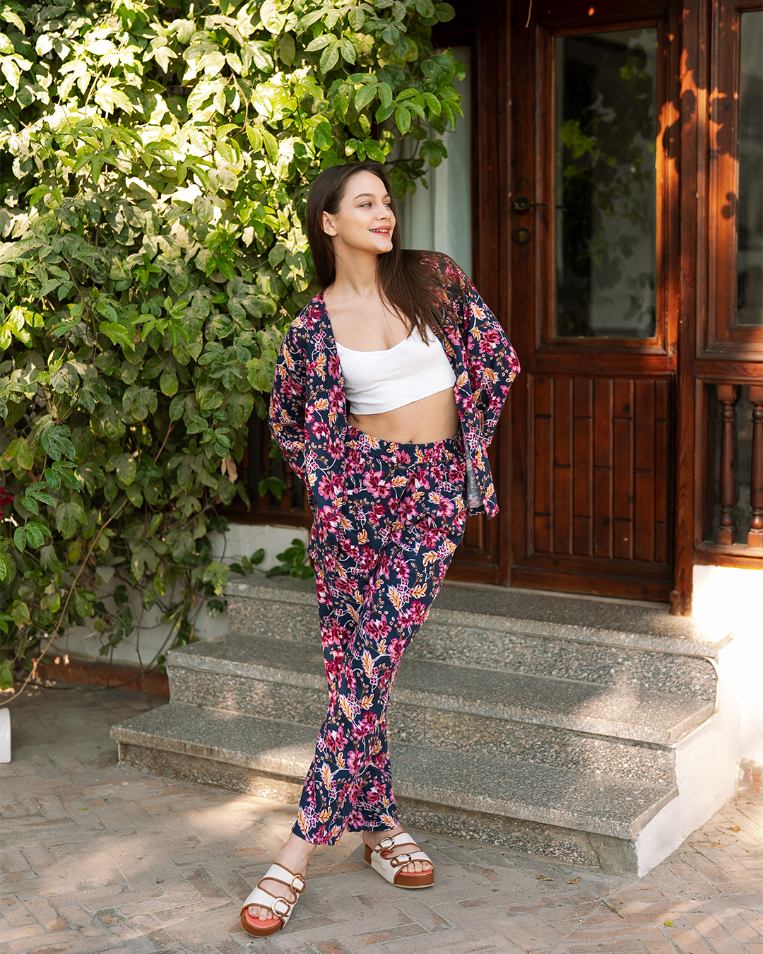 طقم كيمونو بزراير كتان مطبوع