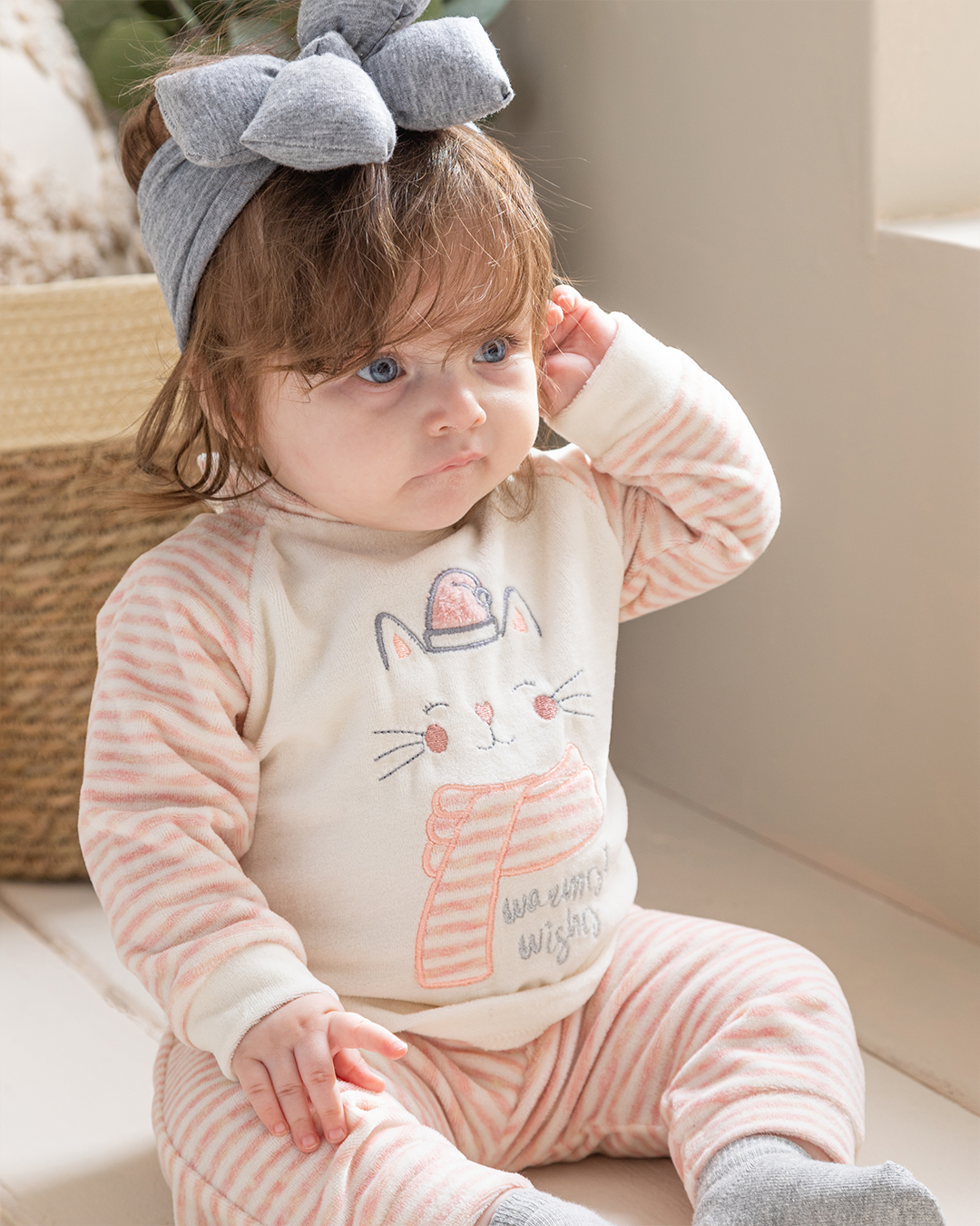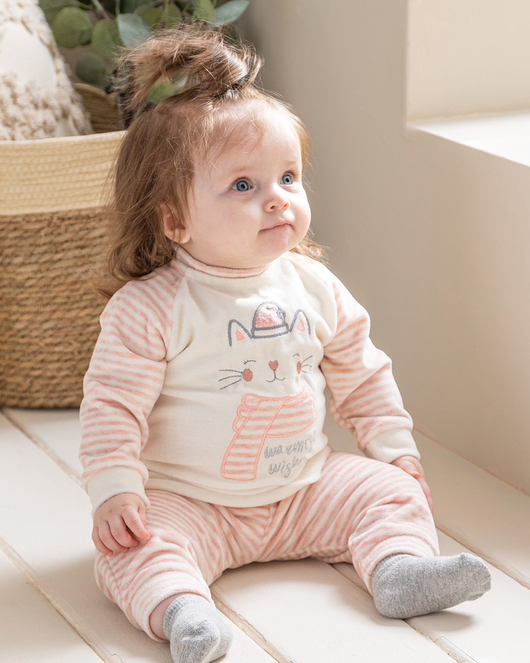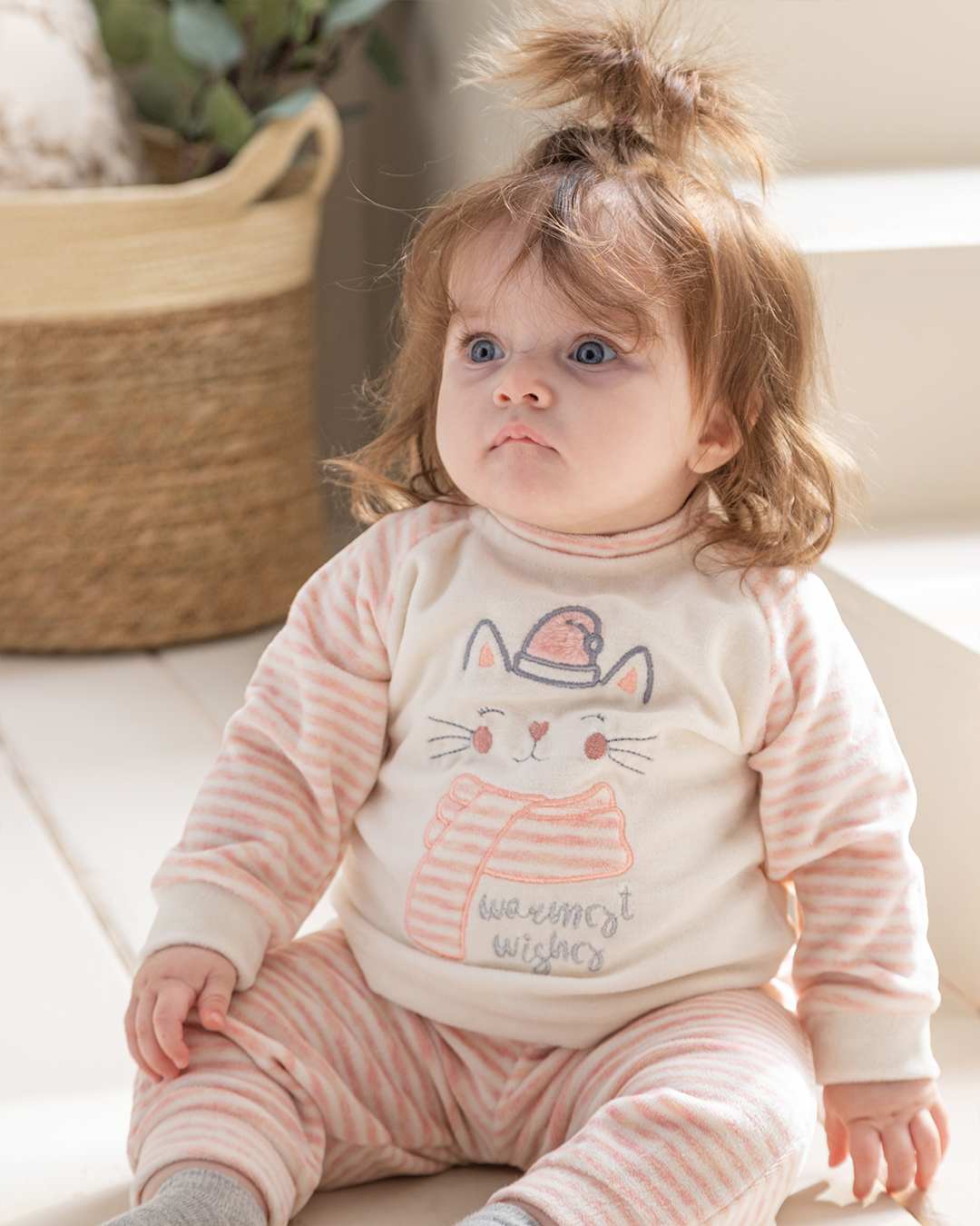 Warmest Wishes بيجامة بيبي بناتي قطة قطيفة سترايب